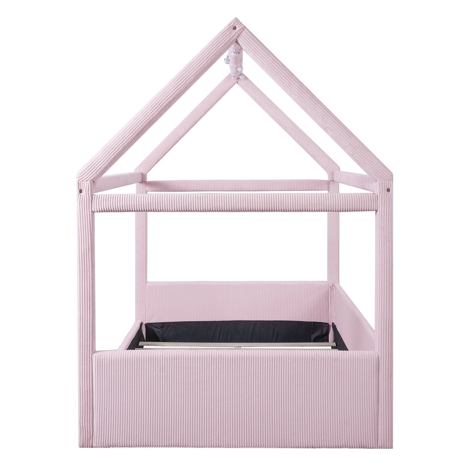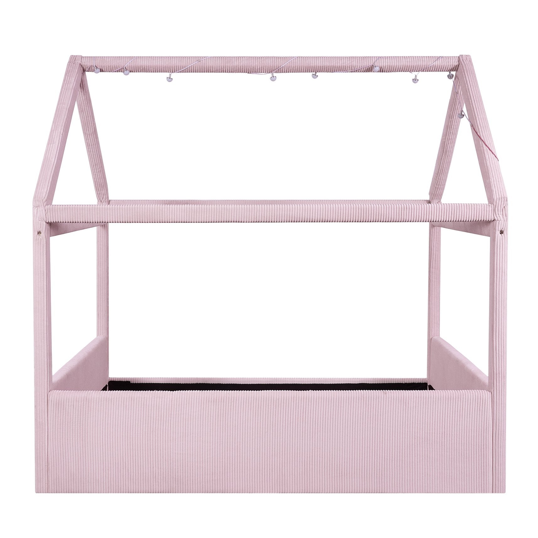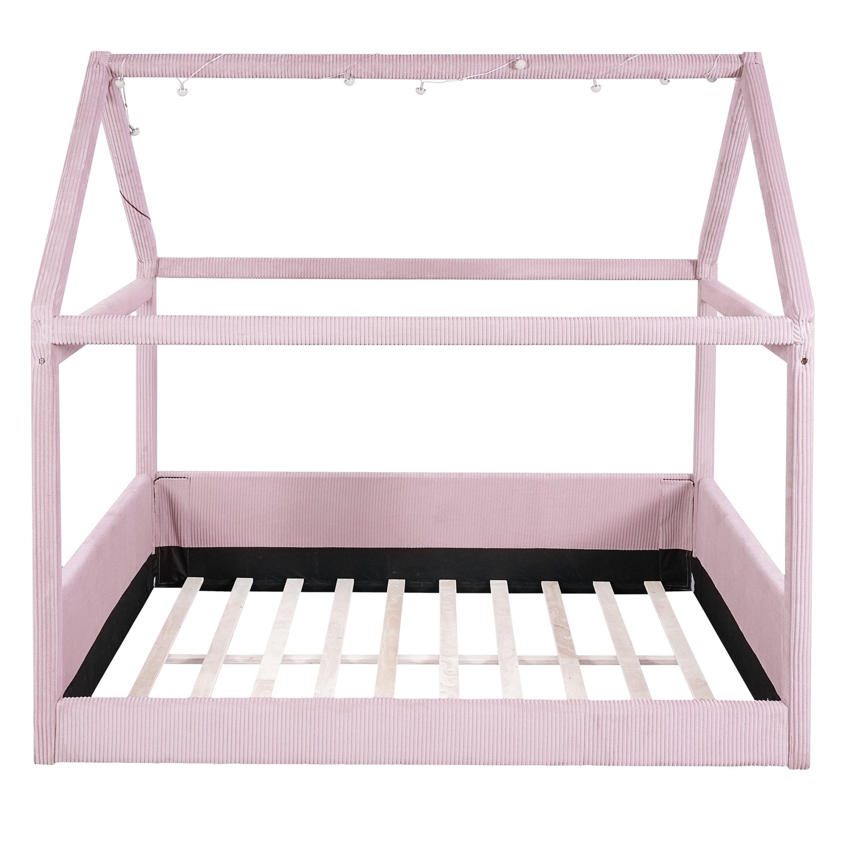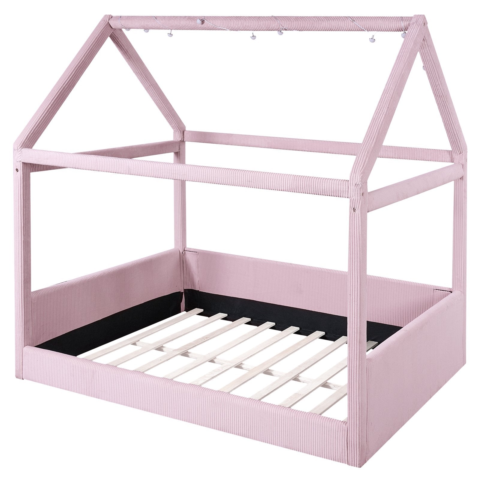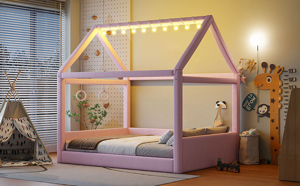 Create a dreamy, cozy retreat for kids or guests with this full-size upholstered house daybed. Its charming house-shaped frame, plush corduroy upholstery, and soft vertical channel tufting combine playful design with refined comfort. Built from solid pine and engineered MDF, the bed is both sturdy and stylish, while the built-in LED light strips with a touch switch offer two color options (white and warm) to set the perfect nighttime ambiance.