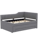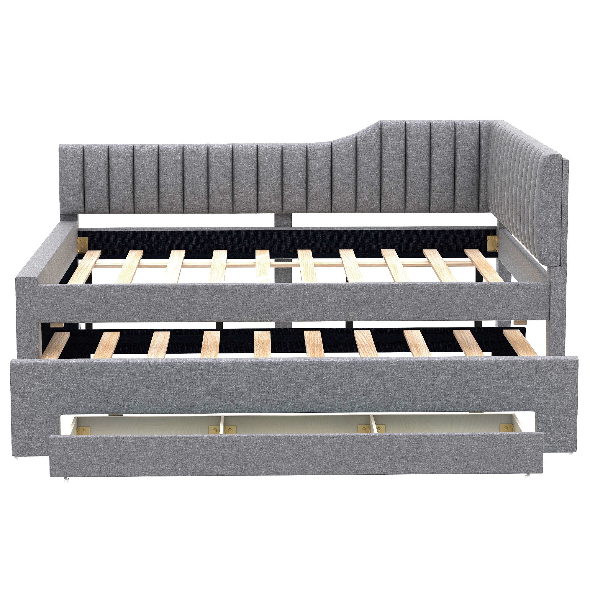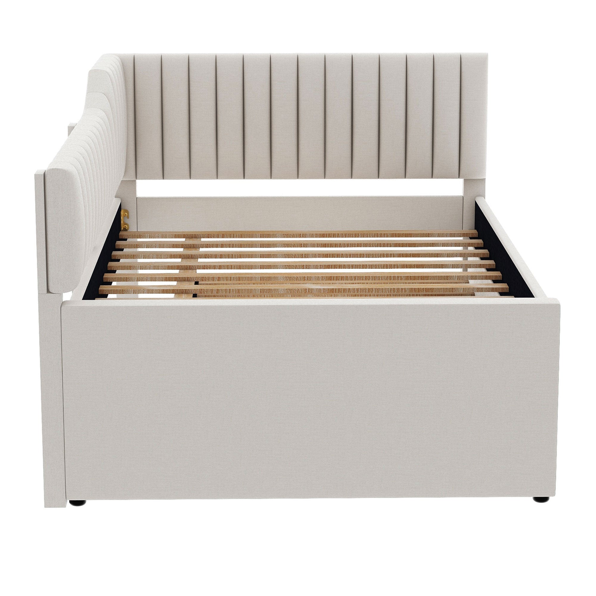 Offering the versatility of a sofa with the comfort of a bed, this full-size upholstered daybed with trundle and three built-in drawers is ideal for guest rooms, studios, or multifunctional living spaces. Its neutral beige linen-blend upholstery and clean silhouette provide a timeless look that complements a variety of decor styles, while the trundle and storage drawers maximize functionality without sacrificing style.