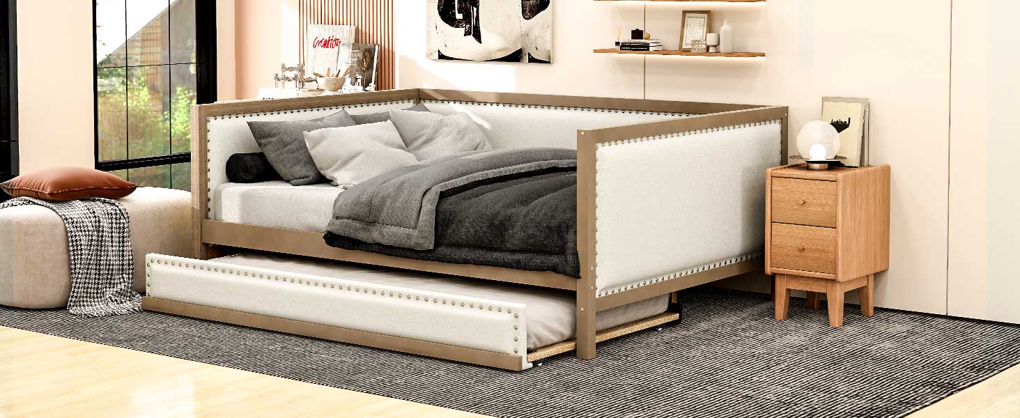 - [Modern Upholstered Daybed] This design is elegant style upholstered in Linen. Nailhead decarotion adds design to this daybed, making it a classic addition to your room.