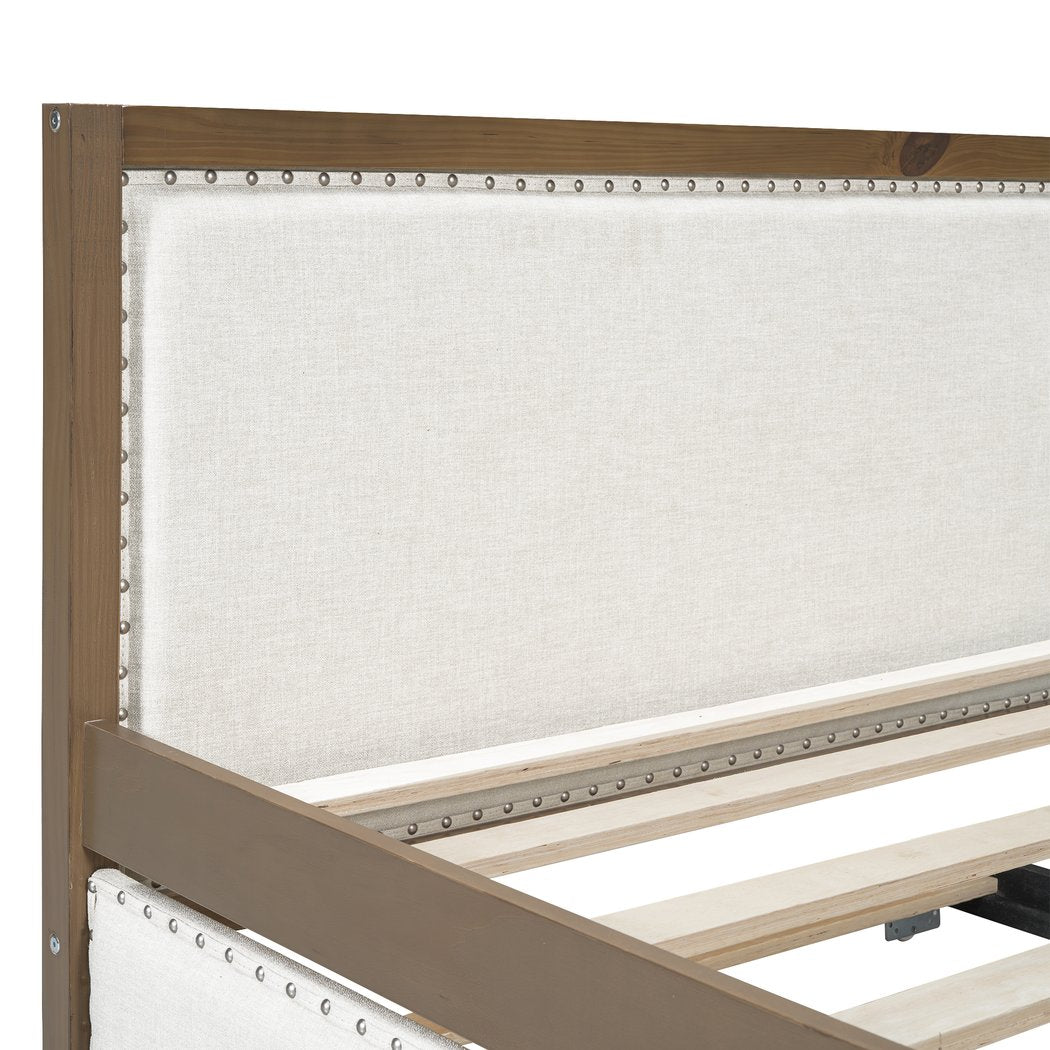 This full-size upholstered daybed with a pull-out trundle and tasteful nailhead trim combines timeless style with practical functionality — ideal for guest rooms, home offices, or multi-purpose spaces. Built with a solid wood frame, MDF panels and linen upholstery, it supports a standard full mattress without a box spring and offers flexible sleeping arrangements while maximizing floor space.