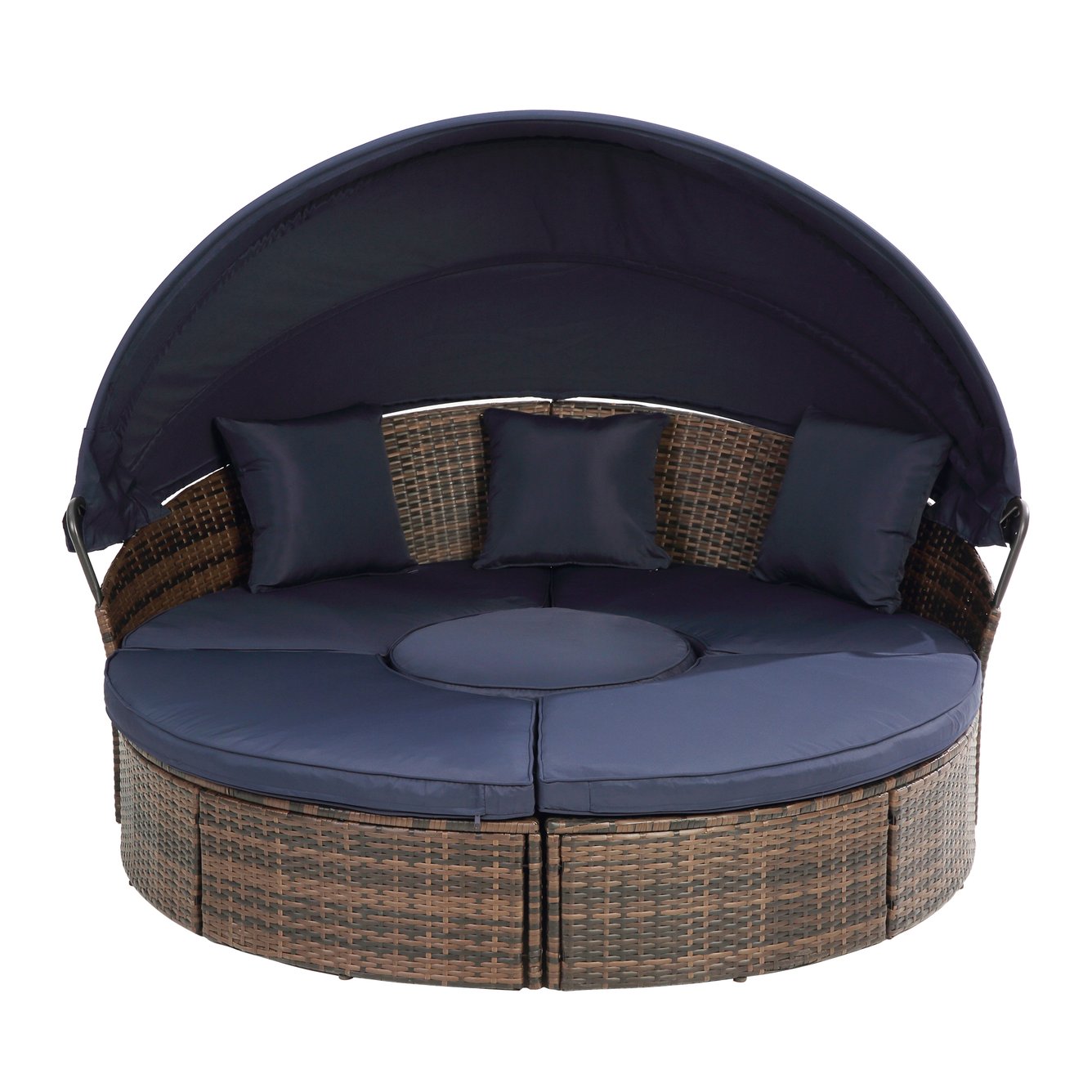 Experience outdoor relaxation reimagined with this elegant round rattan lounge and adjustable canopy bed. Designed for comfort and versatility, it combines weather-resistant wicker construction with thick, washable cushions and a flexible clamshell layout that converts from a full daybed into four individual chairs—perfect for lounging solo or sharing time with family and friends. Durable, stylish, and practical, it’s an inviting centerpiece for patios, poolside areas, decks, or garden retreats.