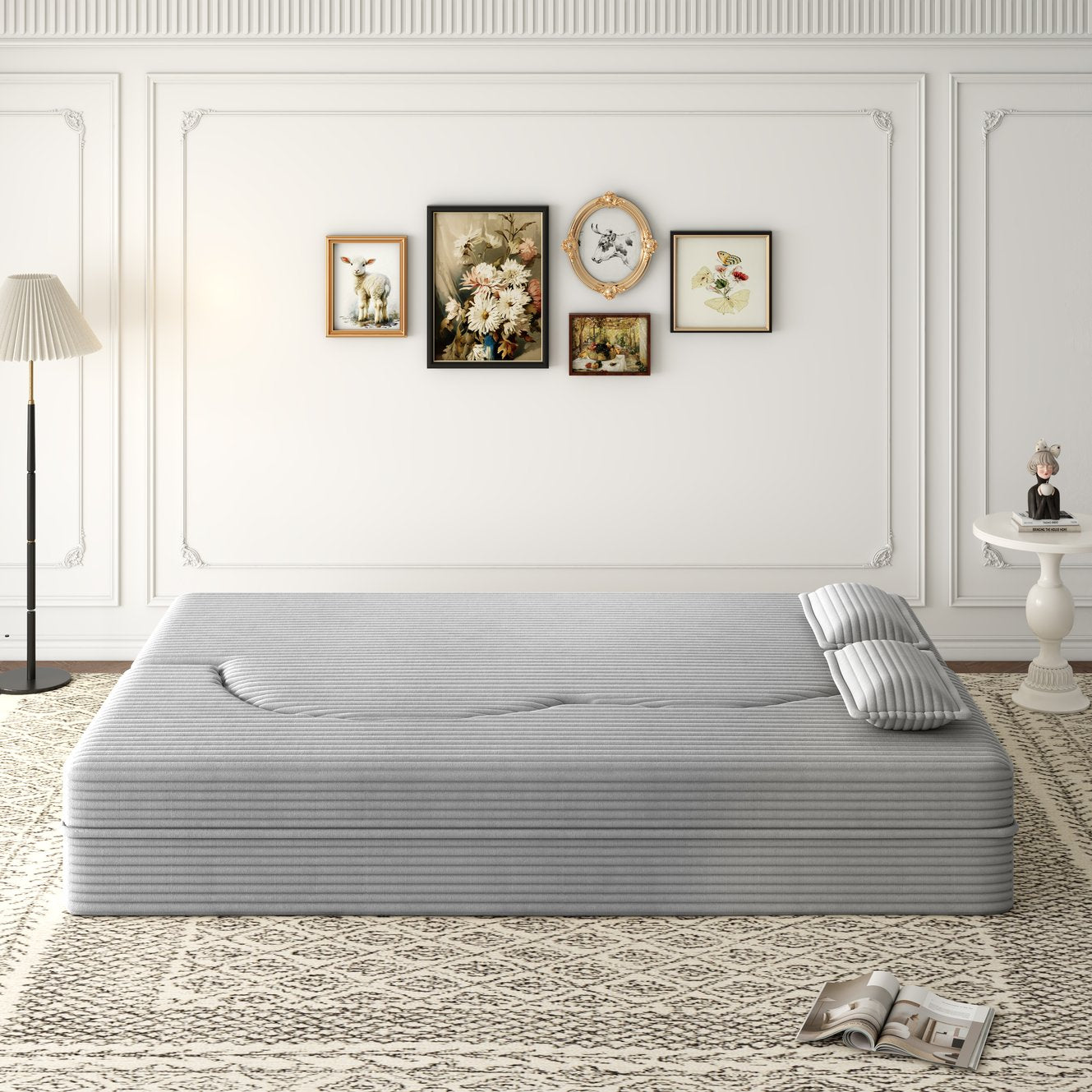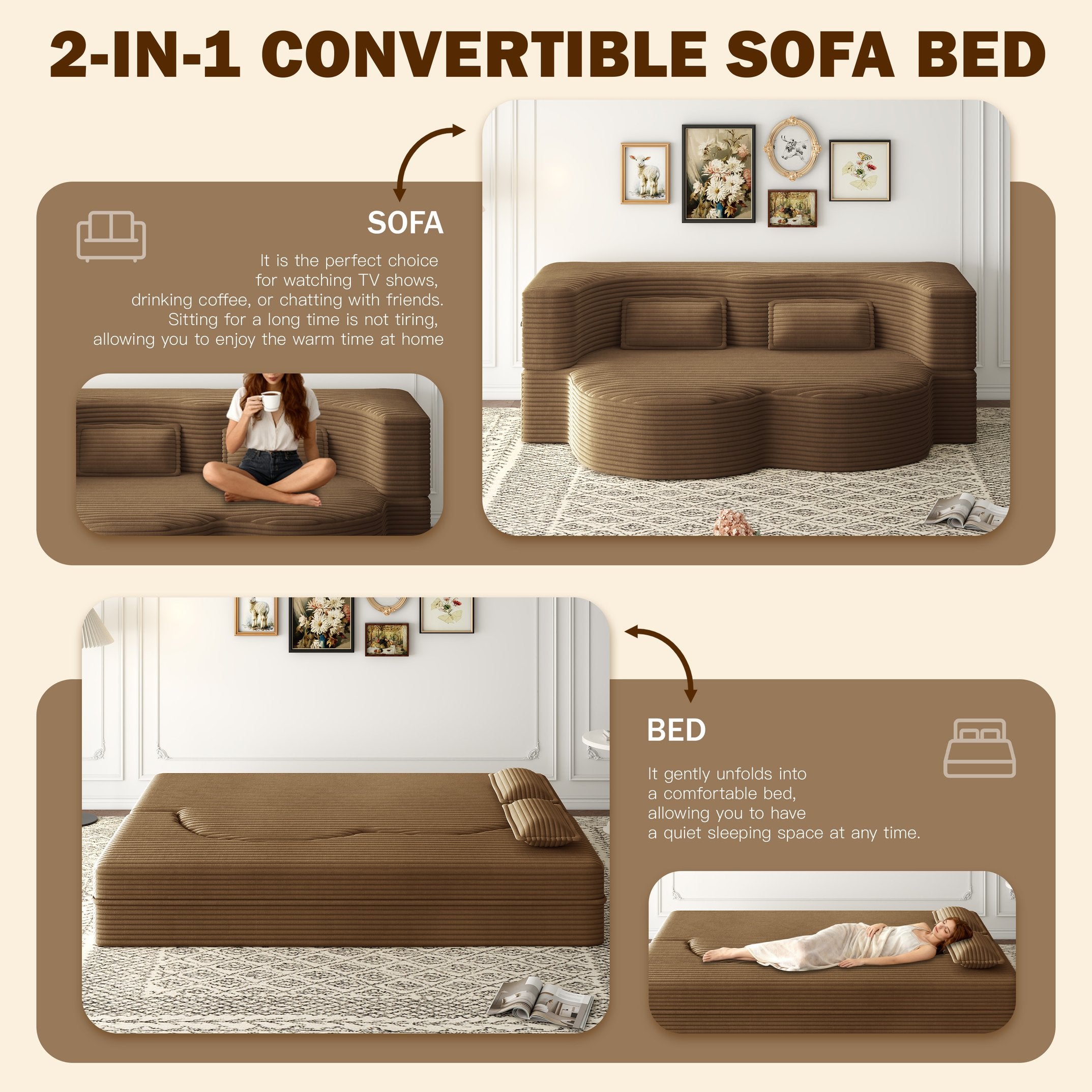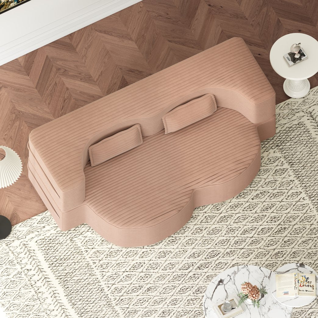 Bring versatile comfort and modern style to small spaces with this convertible floor sofa. Upholstered in plush corduroy with foam-filled cushions and two included pillows, it functions as a compact two-seat sofa by day and unfolds into a full-size 15" sleeper mattress for overnight guests — all with no assembly required. Removable covers and cushions make maintenance simple, while the low-profile design suits living rooms, bedrooms, dorms, or studio apartments.
