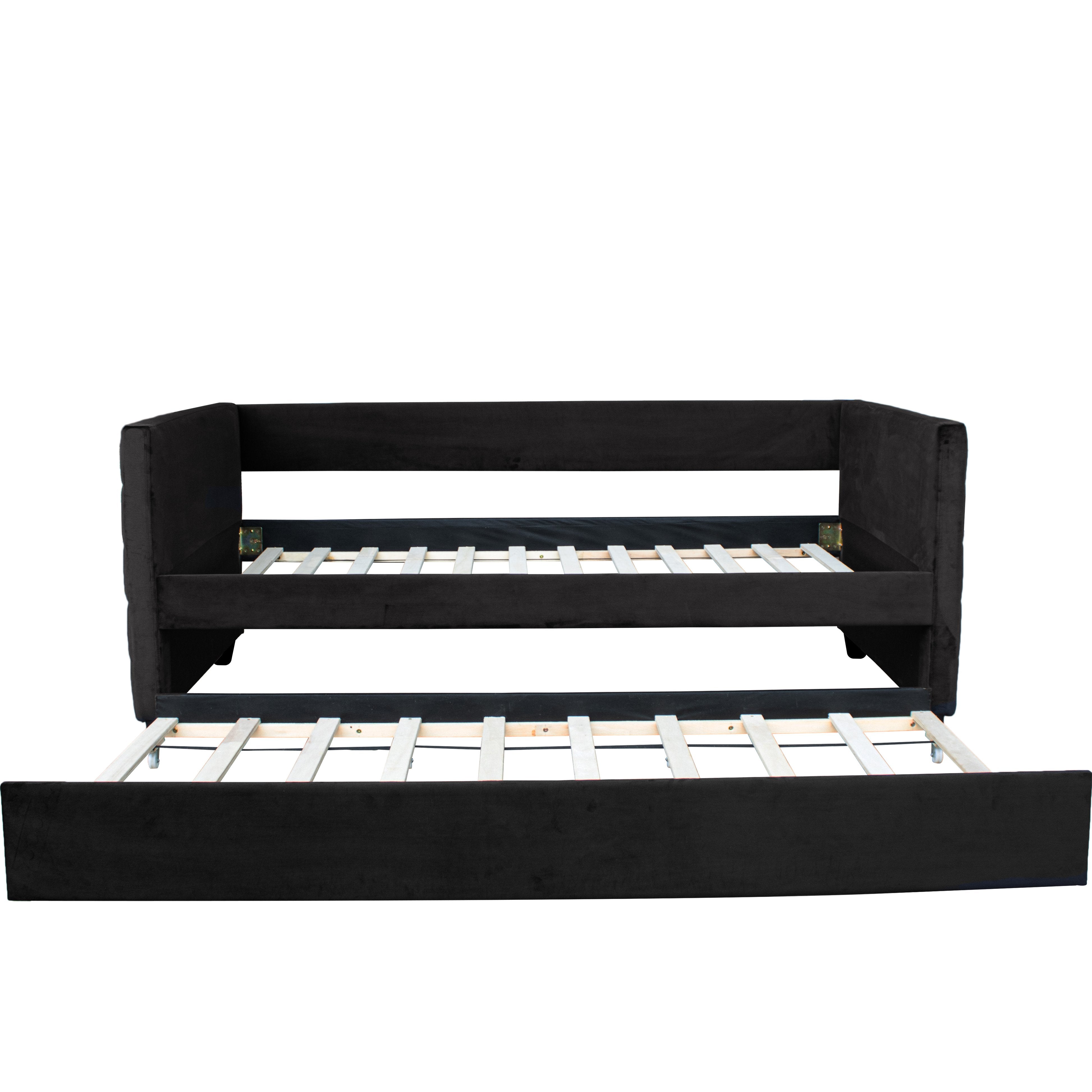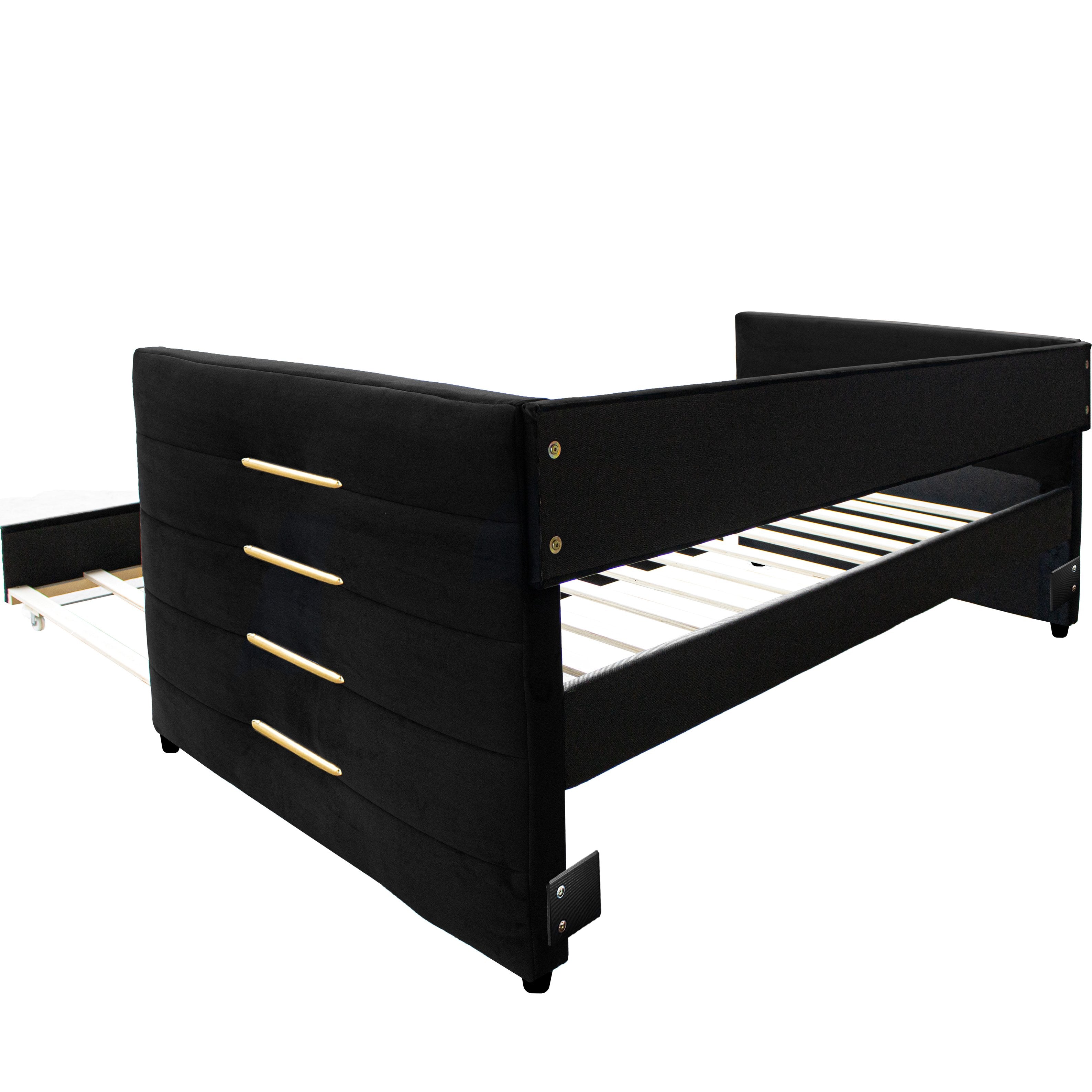 An elegant, space-saving solution for guest rooms or living areas, this modern daybed combines plush black velvet upholstery with striking gold accents for a refined, contemporary look. Designed to function as a sofa by day and a comfortable twin bed by night, it includes a removable trundle for extra sleeping space without sacrificing style or durability.