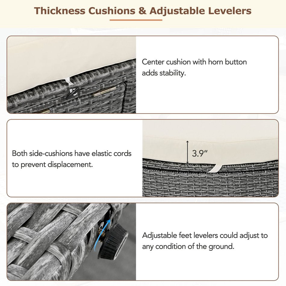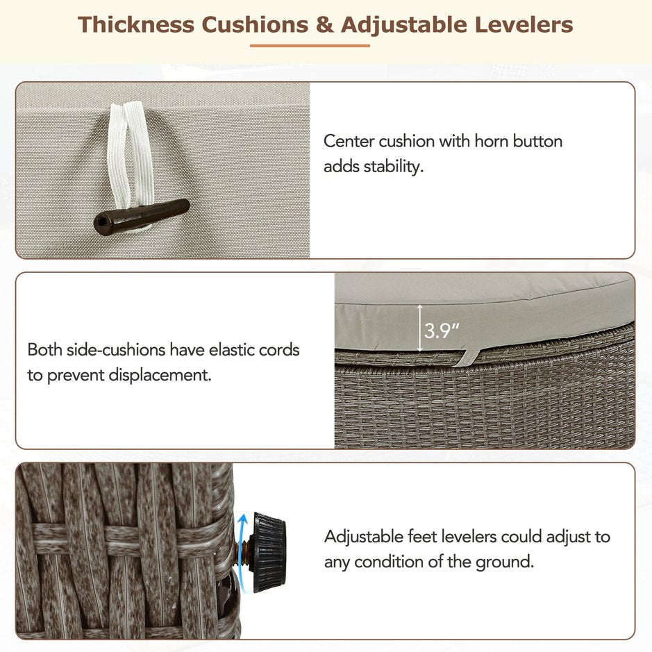 - [Thickness Cushions & Adjustable Levelers] 6-piece 3.9 thickness cushions ensure a comfortable and relaxing experience when using our outdoor daybed. The backs of the cushions on both sides are attached to the rattan frame with elastic cords to prevent displacement during use. Horn buttons are incorporated into the cushions at the center section for added stability, ensuring that the cushions stay firmly in place. Adjustable feet levelers could adjust to any condition of the ground.