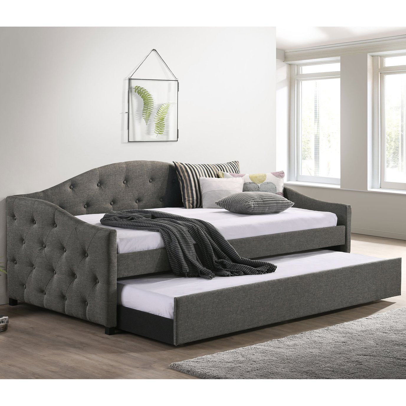 Elegant and versatile, this Tremont grey upholstered twin daybed with trundle blends transitional design and practical function, making it an ideal addition to bedrooms, guest rooms, or living areas. The smooth grey fabric, decorative tufting, and camelback silhouette create a refined focal point while the convenient pull-out trundle and built-in slats deliver comfortable sleeping options without the need for a separate foundation.