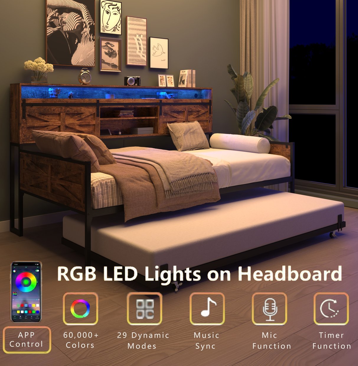 Bring farmhouse charm and modern convenience to any bedroom or guest room with this Twin Daybed with Trundle. Thoughtfully designed for everyday use, it pairs rustic styling and smart features — a sliding barn door headboard with hidden storage, built-in charging and LED lighting, and a sturdy frame with lockable wheels — to create a versatile piece that works as seating by day and a comfortable sleeping solution by night.