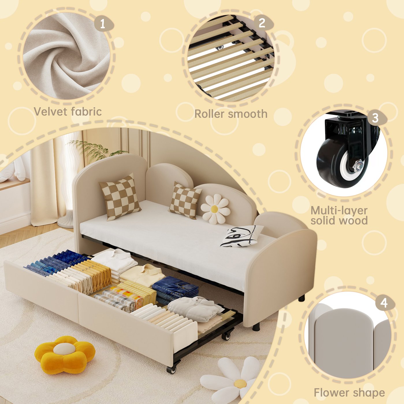 Bring whimsical charm and versatile function to a child's bedroom or a cozy living space with this flower‑shaped velvet daybed. Thoughtfully designed for comfort, safety, and storage, the plush velvet upholstery and foam‑filled seat create a snug lounging spot, while the pull‑out trundle and roomy under‑bed drawer keep toys, linens, or extra bedding neatly organized. Its modern silhouette and neutral gray tone blend with a variety of décor styles, making it suitable for kids' rooms, guest spaces, and small living areas.