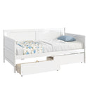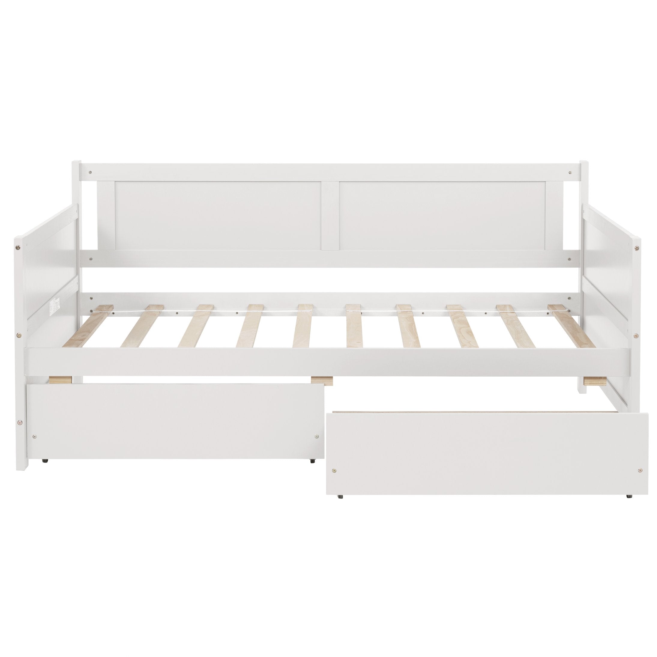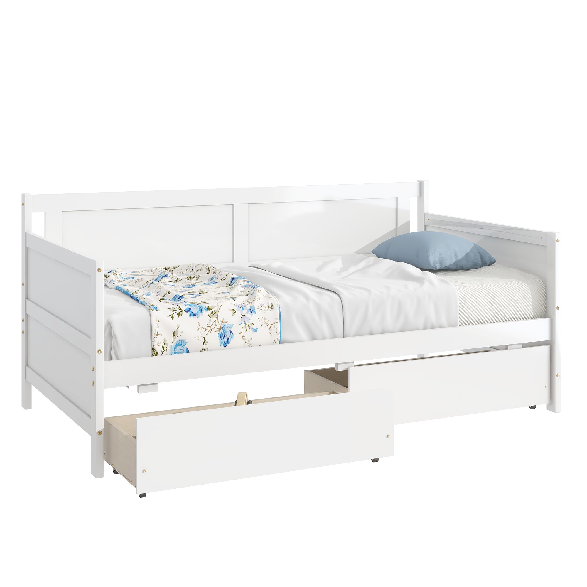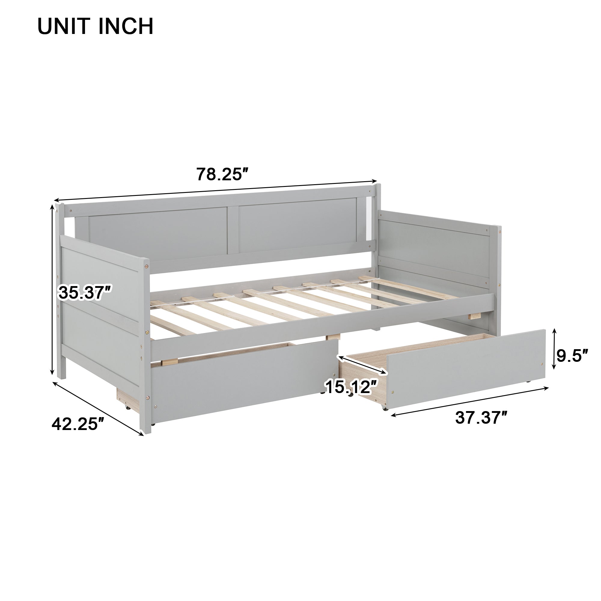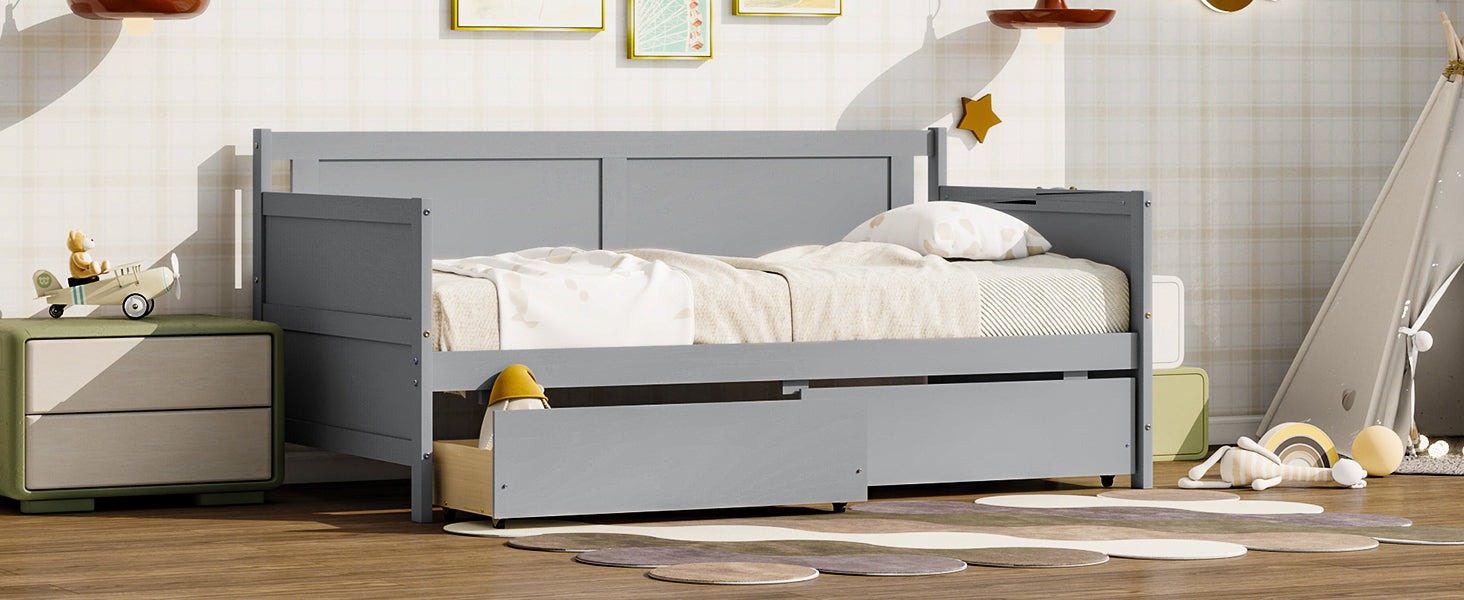 This twin-size pine wood daybed combines timeless design with practical storage to maximize small spaces. Its clean silhouette and neutral grey finish allow it to serve as a comfortable sleeping surface by night and an attractive sofa by day, while two integrated hideaway drawers keep linens and belongings neatly organized.