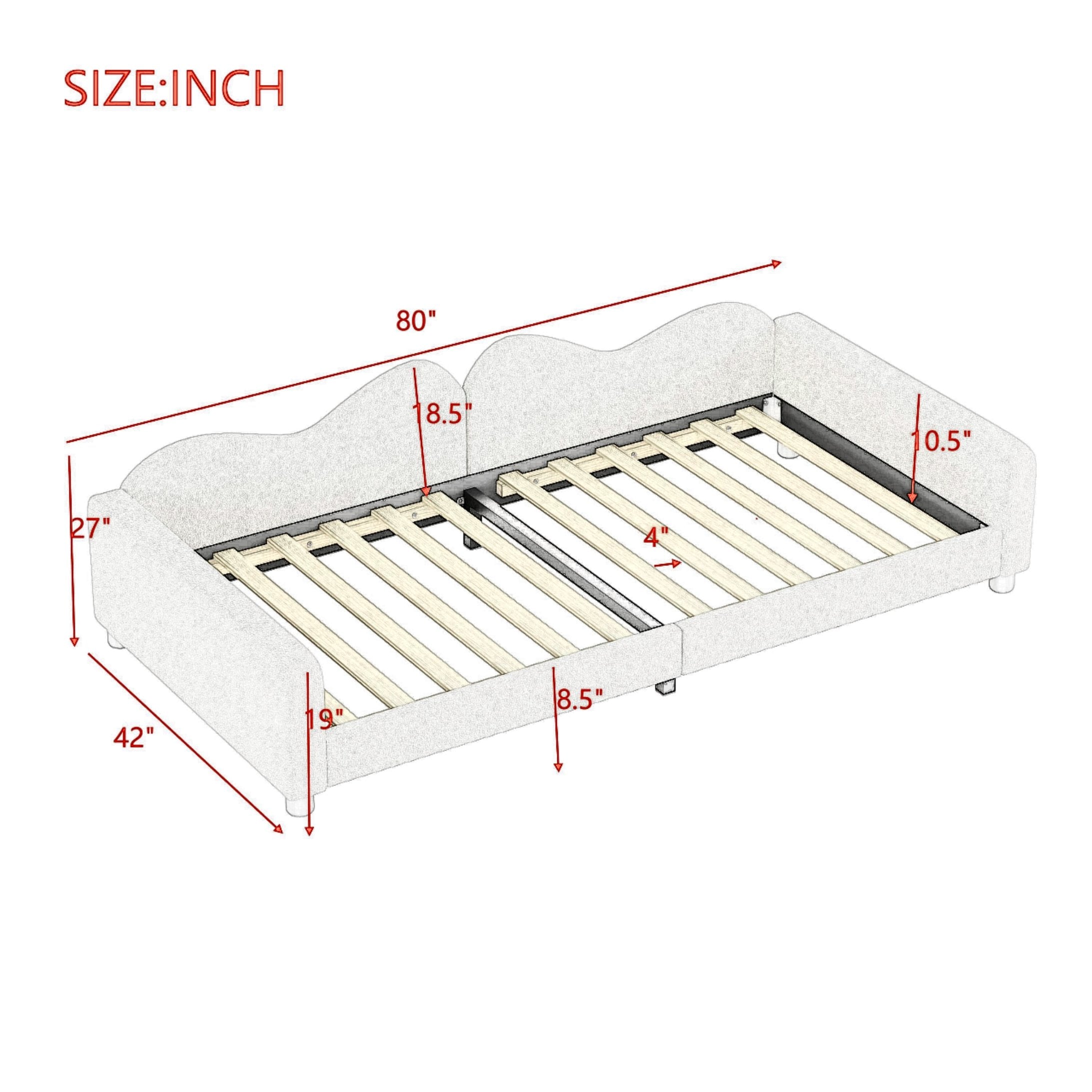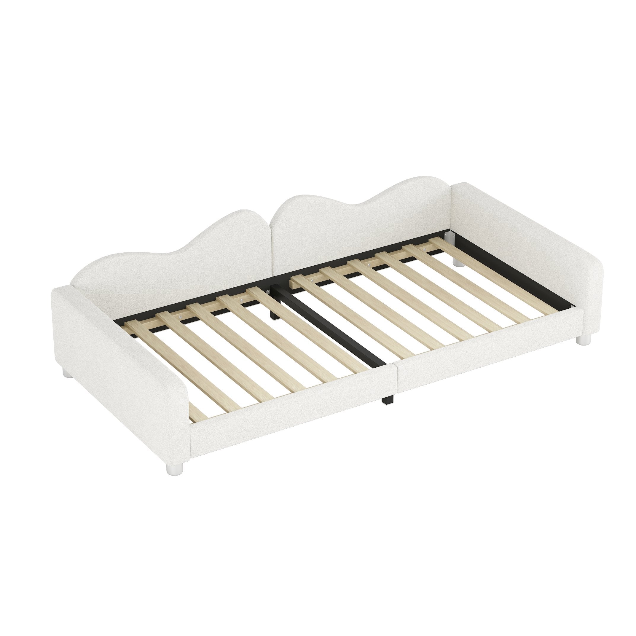 Bring cozy charm and modern functionality to a bedroom or guest space with this twin-size upholstered daybed. Wrapped in soft sherpa fabric and featuring a whimsical cloud-shaped backrest, it blends playful design with practical construction—no box spring required. Ideal for kids’ rooms, guest nooks, or compact apartments, the daybed supports restful lounging and overnight stays while complementing contemporary décor.