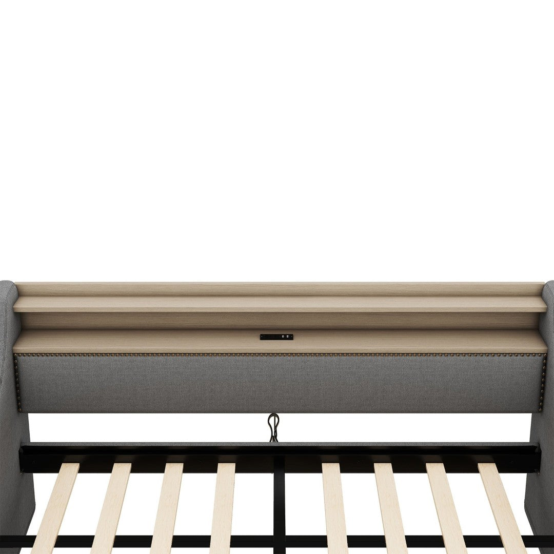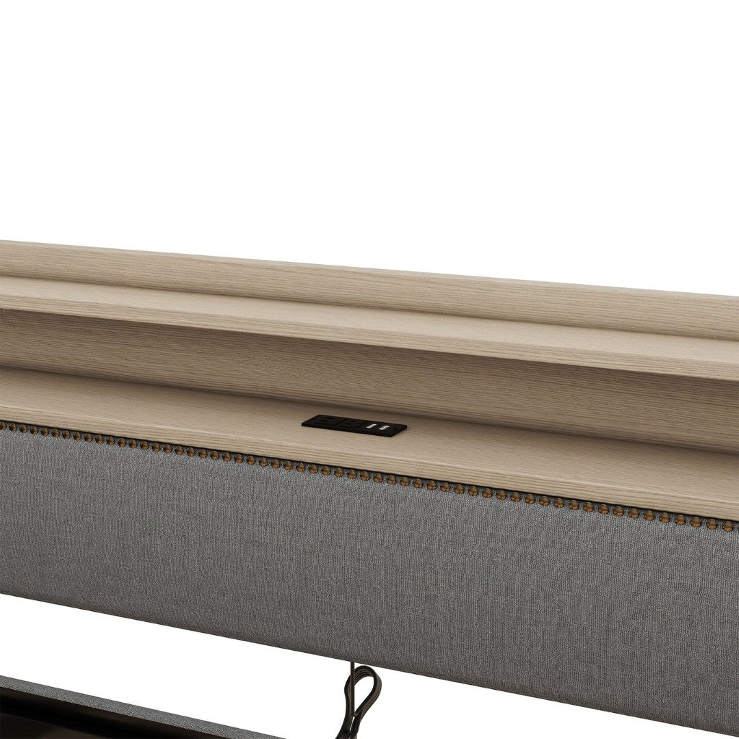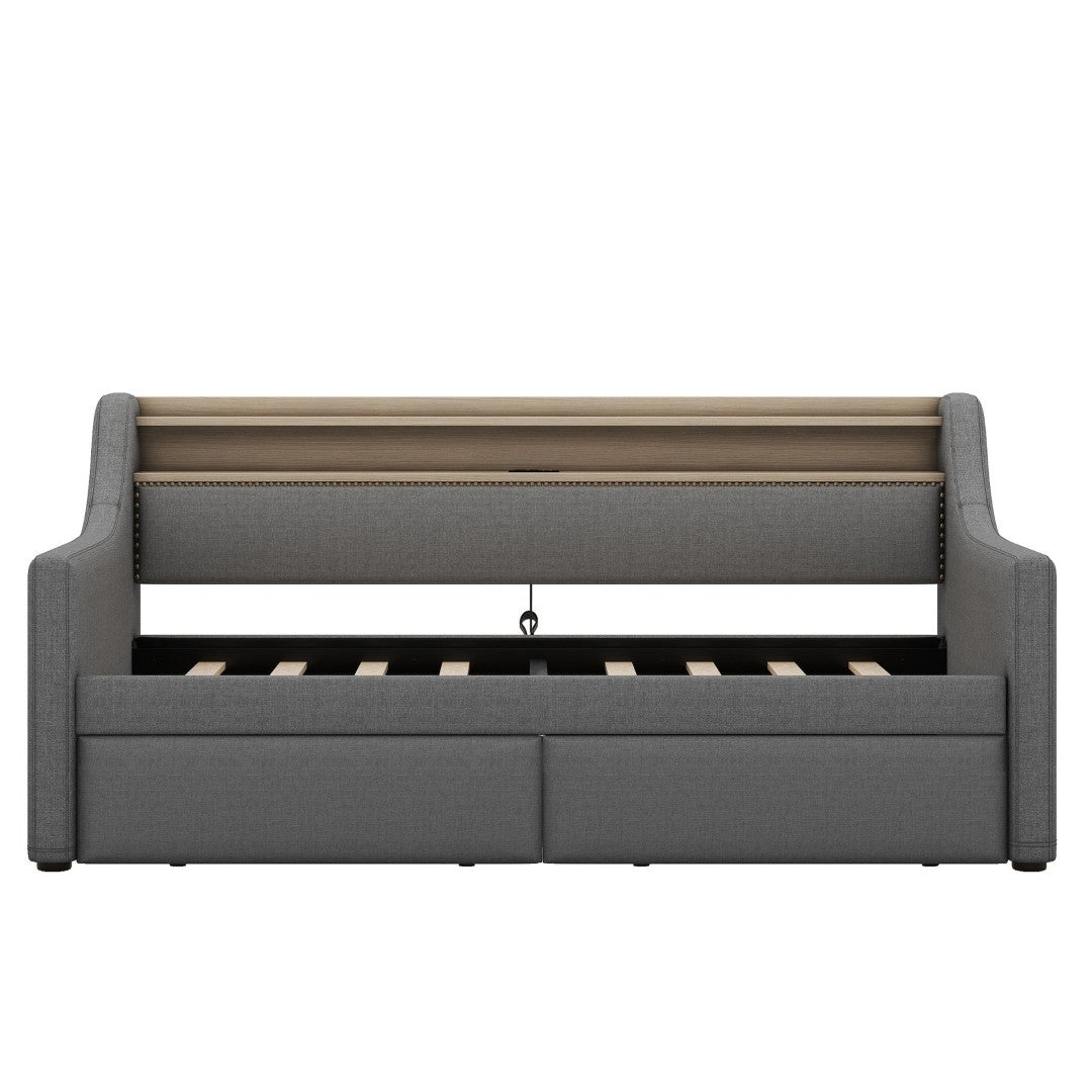 Bring contemporary comfort and smart functionality to your bedroom with this upholstered twin daybed. Thoughtfully designed with clean lines, bronze nailhead trim, built-in LED lighting and a convenient charging station, it combines style and modern convenience while maximizing storage with two under-bed drawers. Ideal for small spaces, guest rooms, or a multi-use bedroom, the gray linen-like upholstery offers a neutral, upscale look that pairs with a variety of decor.