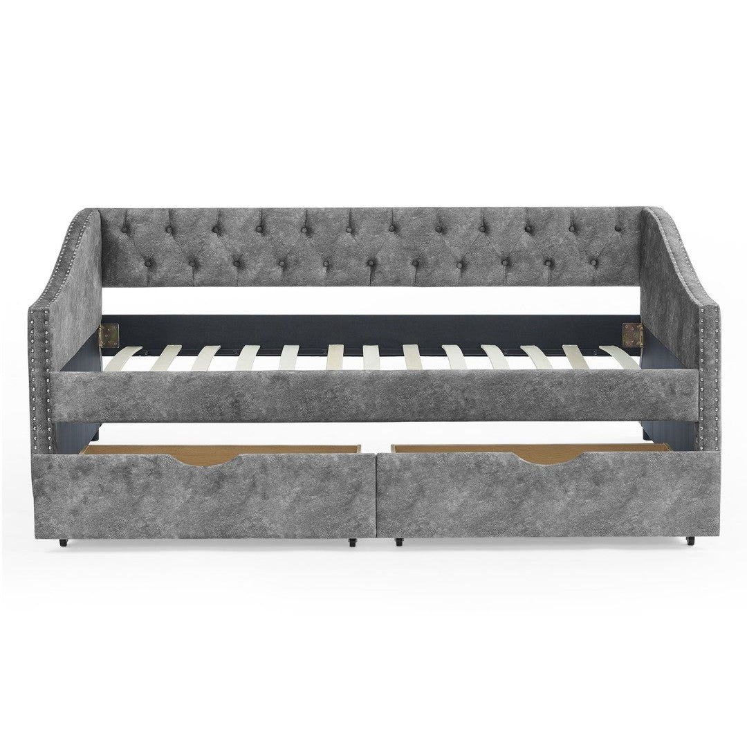 Transform any bedroom or living space with this stylish and versatile twin daybed—designed for comfort, durability, and elegant farmhouse-inspired detail. Upholstered in soft grey fabric with tufted back, waved arms accented by copper nail trim, and built-in under-bed storage drawers, it functions seamlessly as a sofa by day and a cozy sleeper by night.