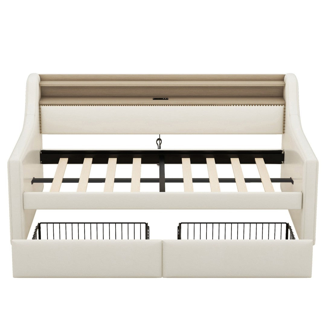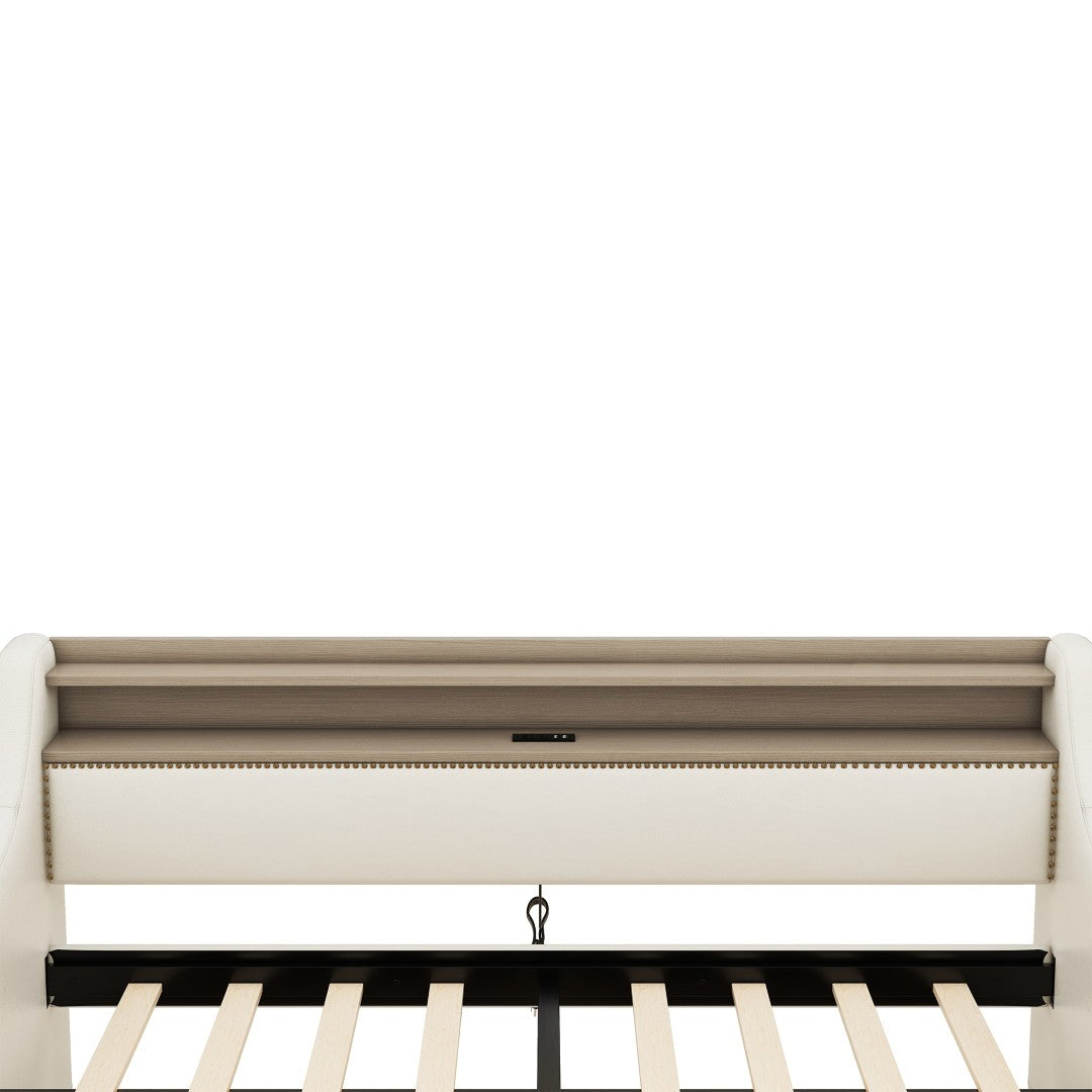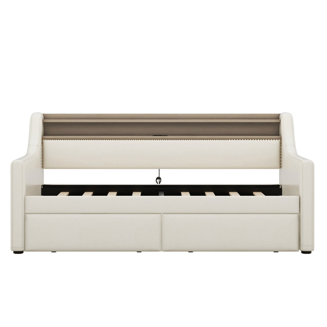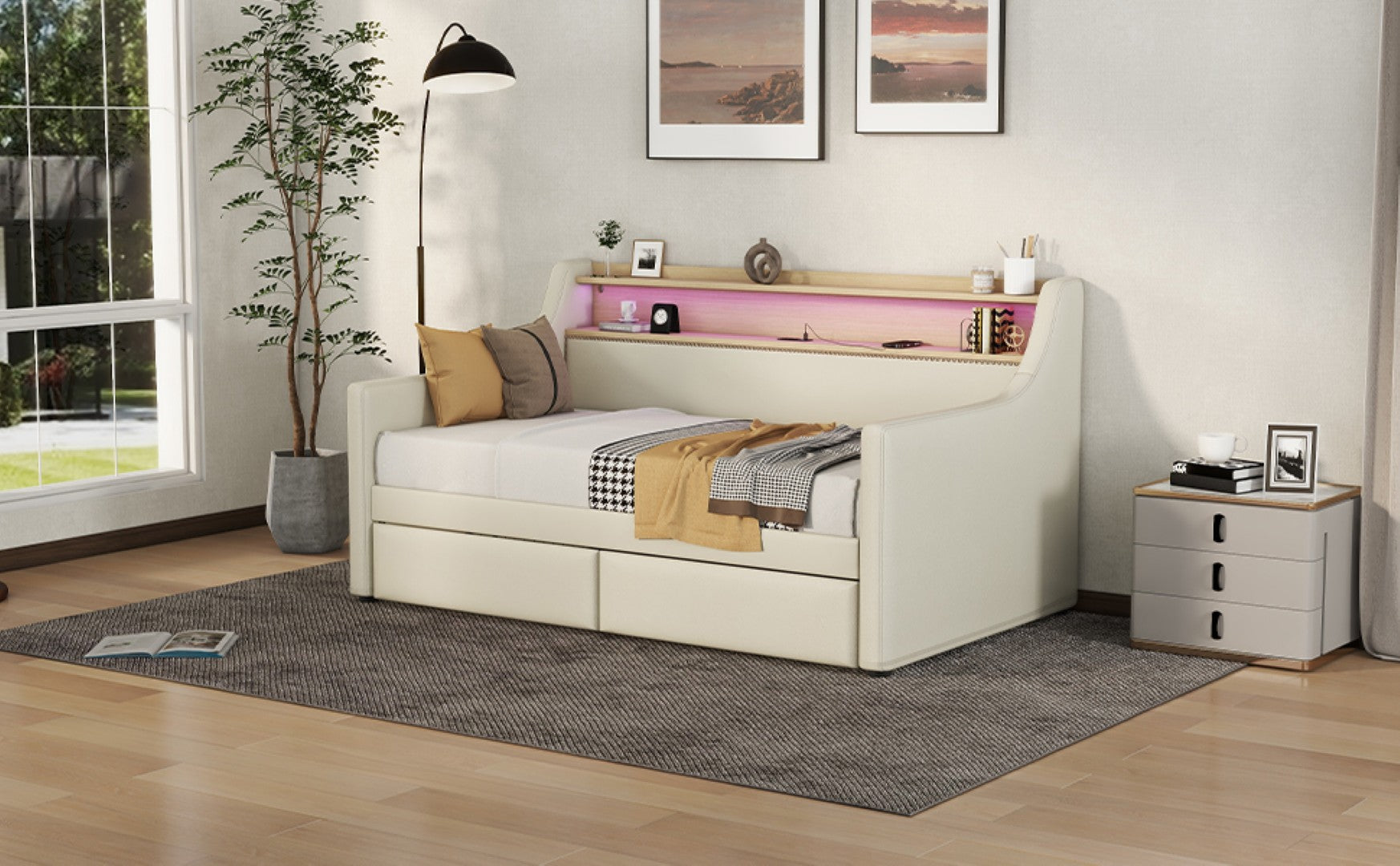 Give your bedroom a clean, contemporary upgrade with this upholstered twin daybed that combines style and functionality. Featuring bronze nailhead trim and a neutral beige finish, it provides comfortable seating by day and a restful twin sleeping surface by night — with built-in storage, integrated charging, and subtle LED lighting for modern convenience.