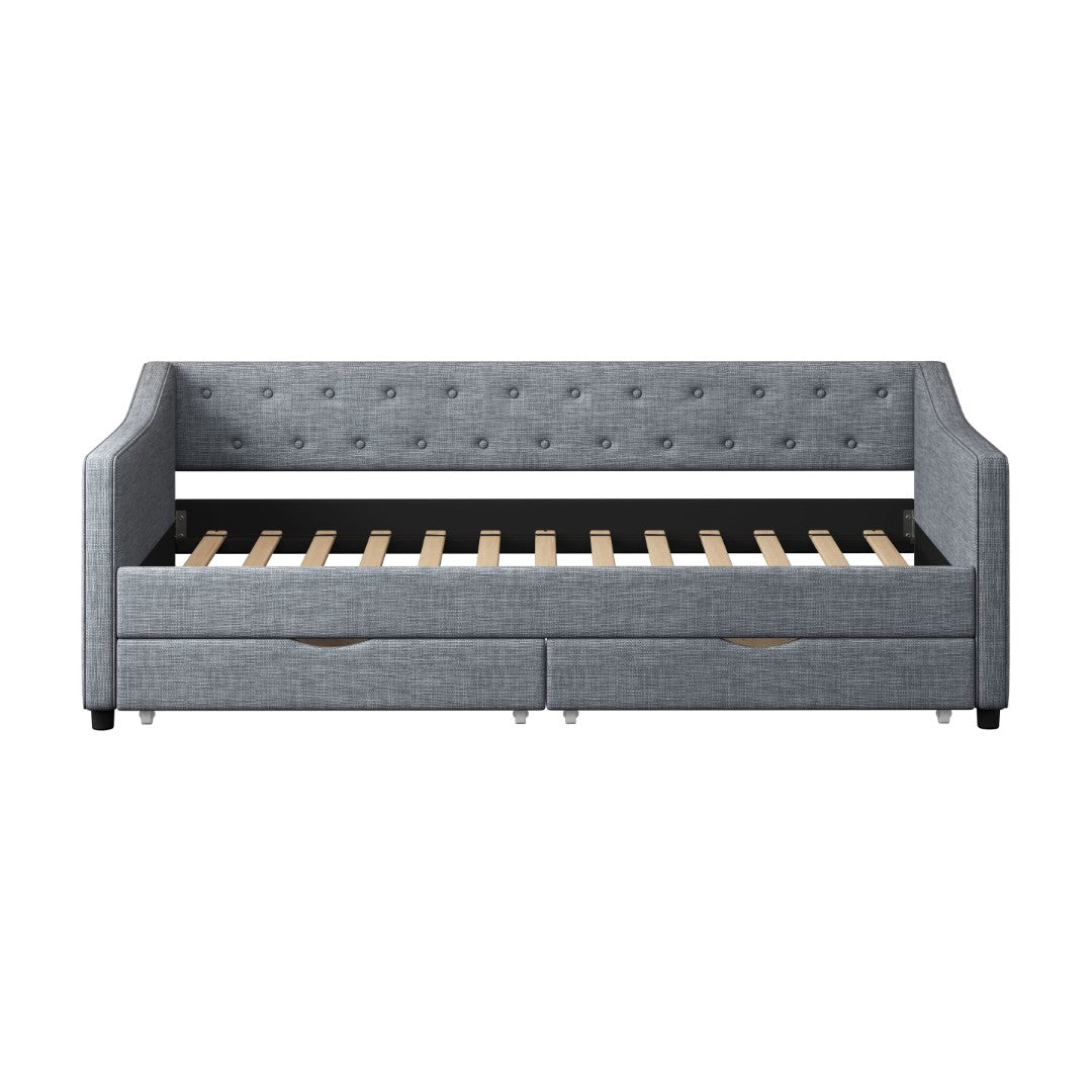 Bring versatile style and comfortable seating to any room with this twin-size upholstered daybed. Its tufted back with button detailing and waved arms trimmed with piping create a refined, modern silhouette, while breathable fabric and high-density foam cushions deliver supportive comfort for sitting or sleeping. Built on a sturdy wooden frame, this daybed includes under-bed drawers for extra storage and supports up to 500 lbs, making it a practical and elegant addition to guest rooms, home offices, or studio apartments.