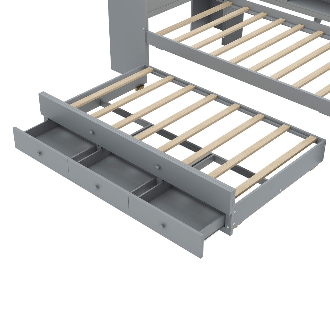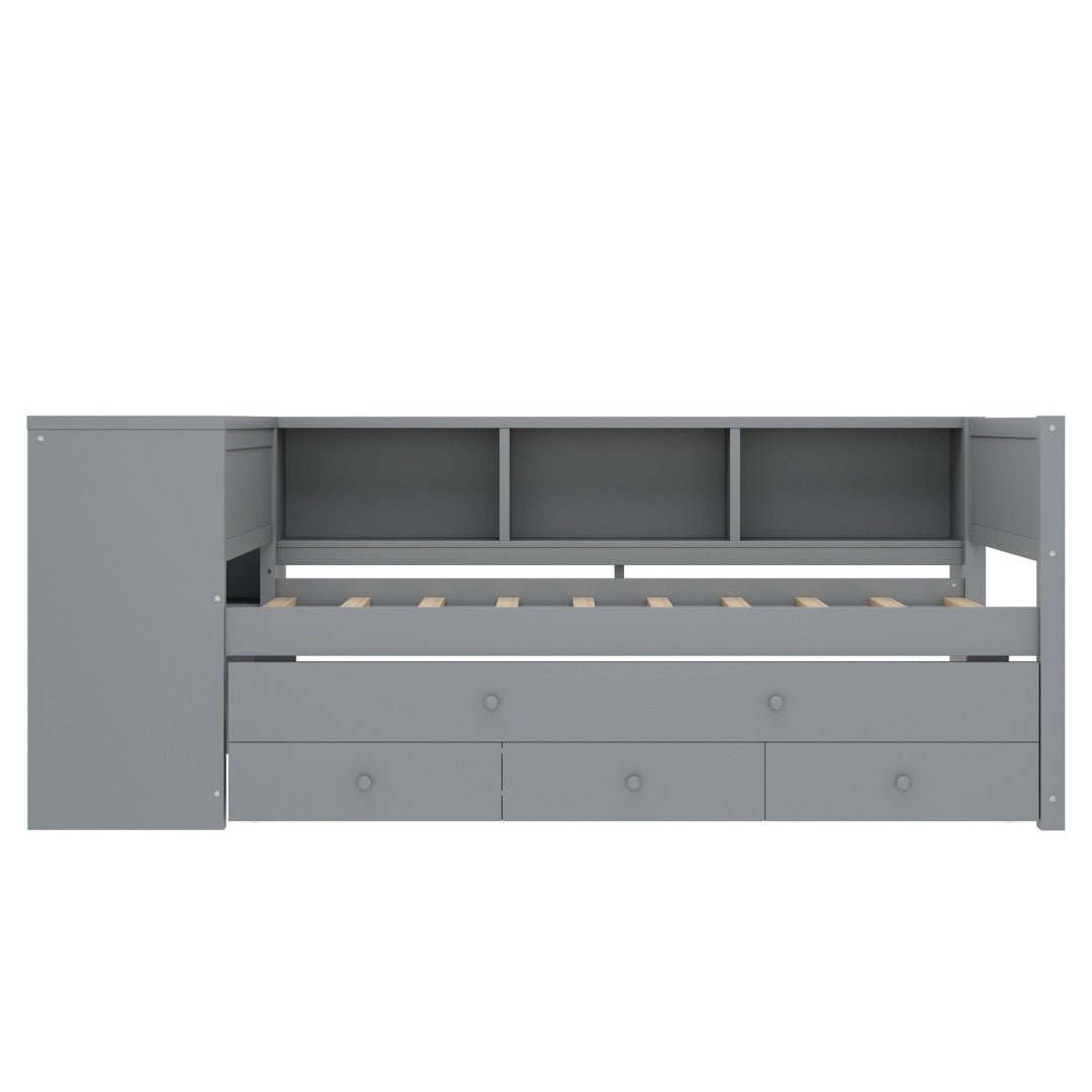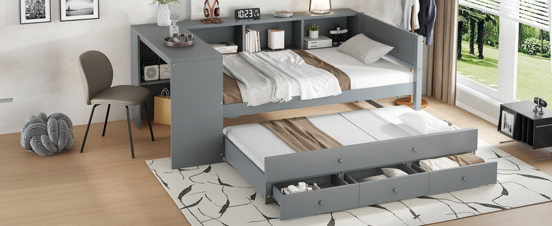 Transform your bedroom or guest space with a versatile daybed that combines sleeping, storage, and workspace in one compact, stylish design. Crafted from solid pine wood with durable plywood and MDF components, this twin-size daybed features a built-in trundle, integrated drawers and shelves, and a handy tray board — ideal for small apartments, kids’ rooms, or multifunctional guest areas.