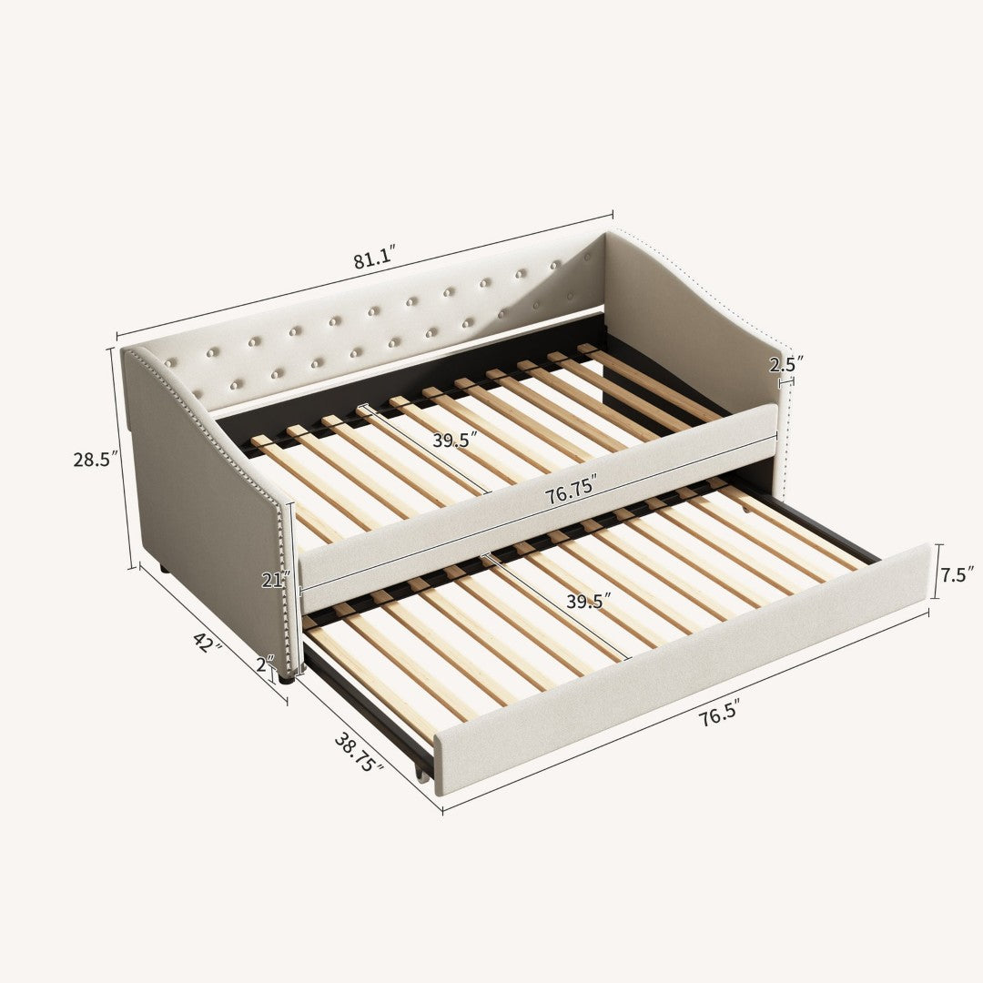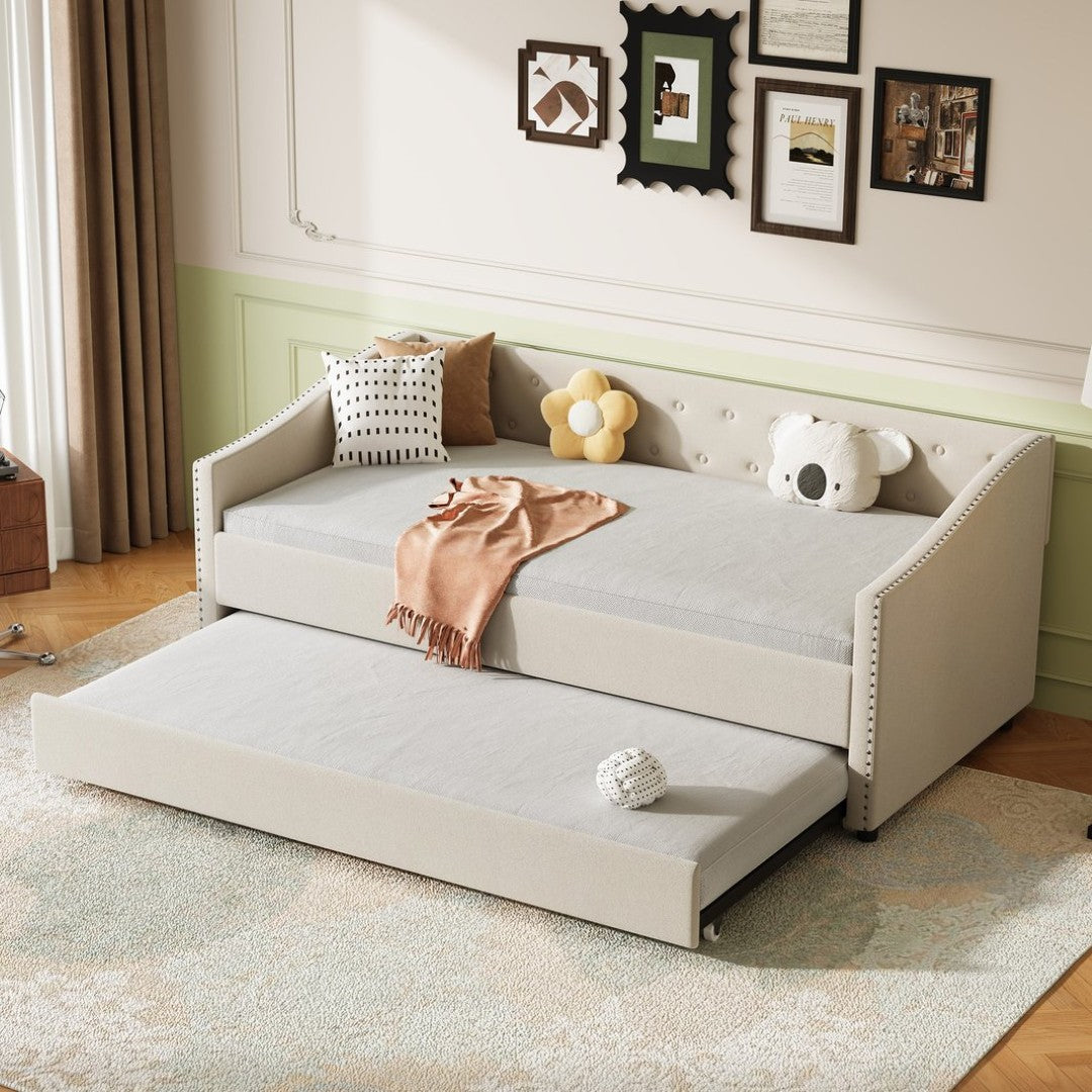 Transform any room with this elegant twin daybed and matching twin trundle—designed for style, comfort, and durability. Neutral beige fabric and a wood frame create a timeless look while thoughtful details like button-tufting and brass-accented waved handrails add refined character. Built for everyday use, the breathable cushions and high-density foam deliver long-lasting comfort, and the sturdy frame supports robust weight for reliable performance.