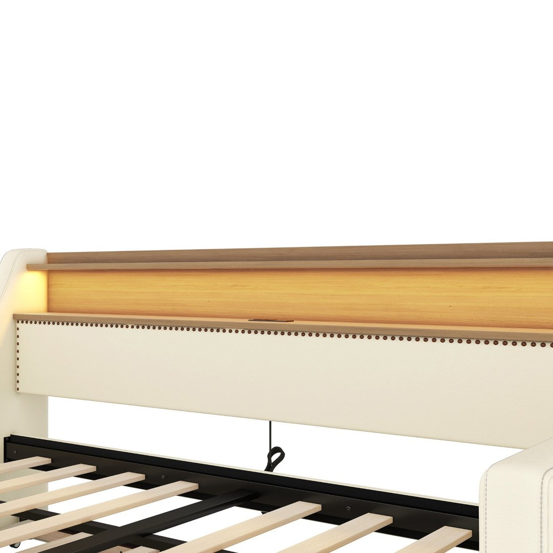 Give your bedroom a sleek, multifunctional upgrade with this contemporary upholstered twin daybed. Clean lines, bronze nailhead trim, integrated LED lighting, and a built-in charging station combine style and convenience—ideal for small spaces, guest rooms, or a modern youth bedroom. The included pull-out trundle expands sleeping capacity while maintaining a polished, cohesive look in crisp white.