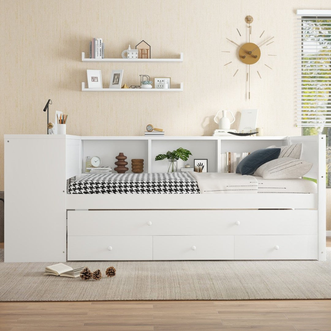 - Ample Storage with Built-in Shelves & DrawersThis twin daybed offers smart storage solutions with built-in shelves, under-bed drawers, and side racks. Perfect for books, clothes, and essentials, it helps maximize your bedroom’s space without extra furniture.