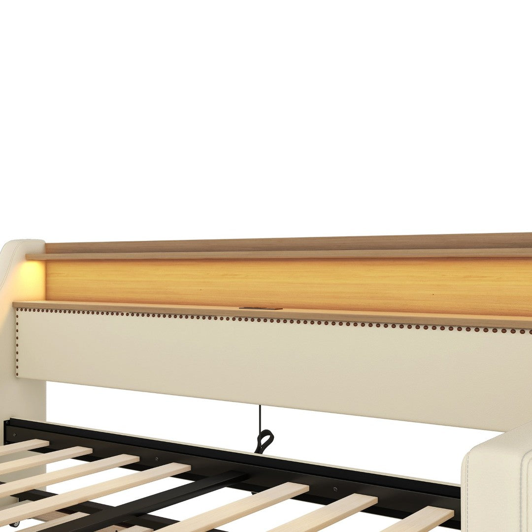 Elevate your guest room or living space with this contemporary upholstered twin daybed featuring a convenient trundle, built-in charging station, and subtle LED accent lighting. Designed for both style and function, it combines a clean silhouette with bronze nailhead trim and plush leatherette upholstery to create a cozy, hotel-worthy look that’s perfect for everyday use or overnight guests.