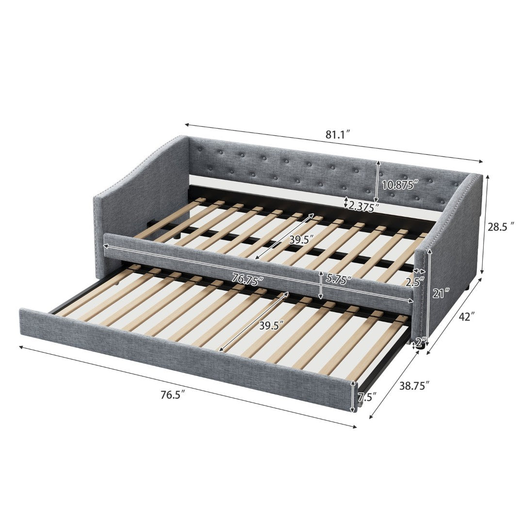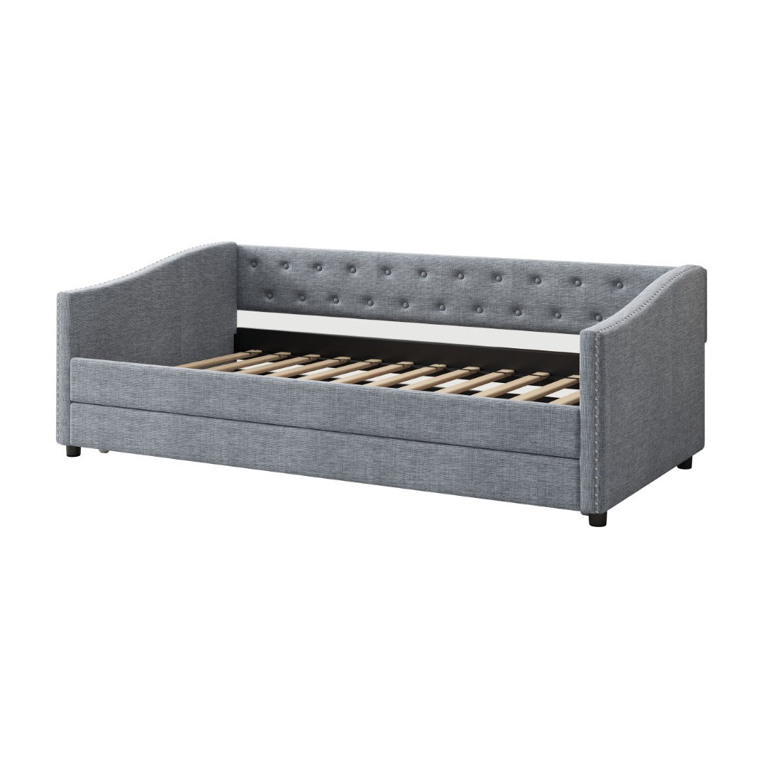 Bring classic charm and versatile function to your living space with this upholstered twin daybed and matching twin trundle. Designed for comfort and style, it features a button-tufted back, waved arms accented with copper nailhead trim, and durable construction that supports everyday use—ideal for guest rooms, small apartments, or a cozy reading nook.