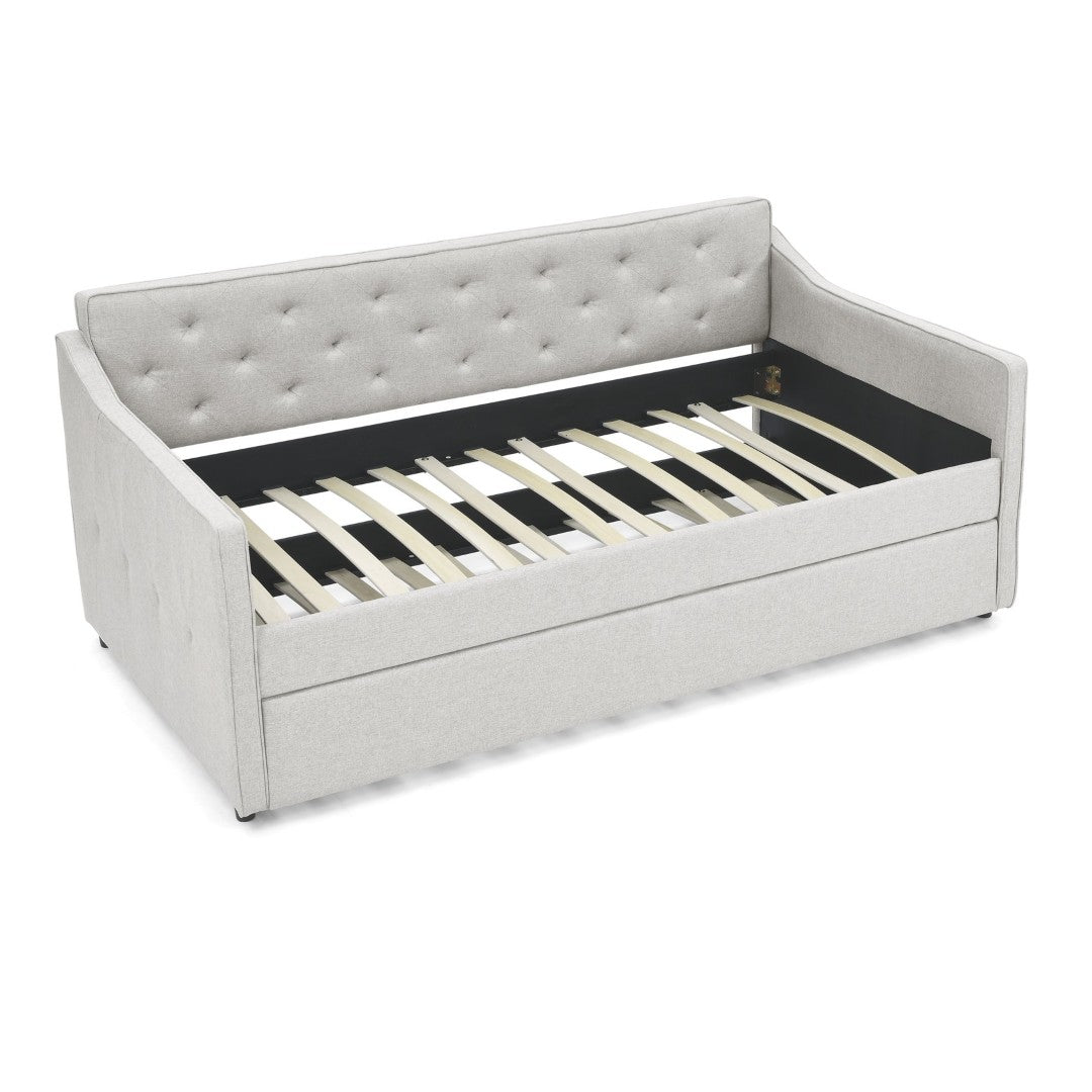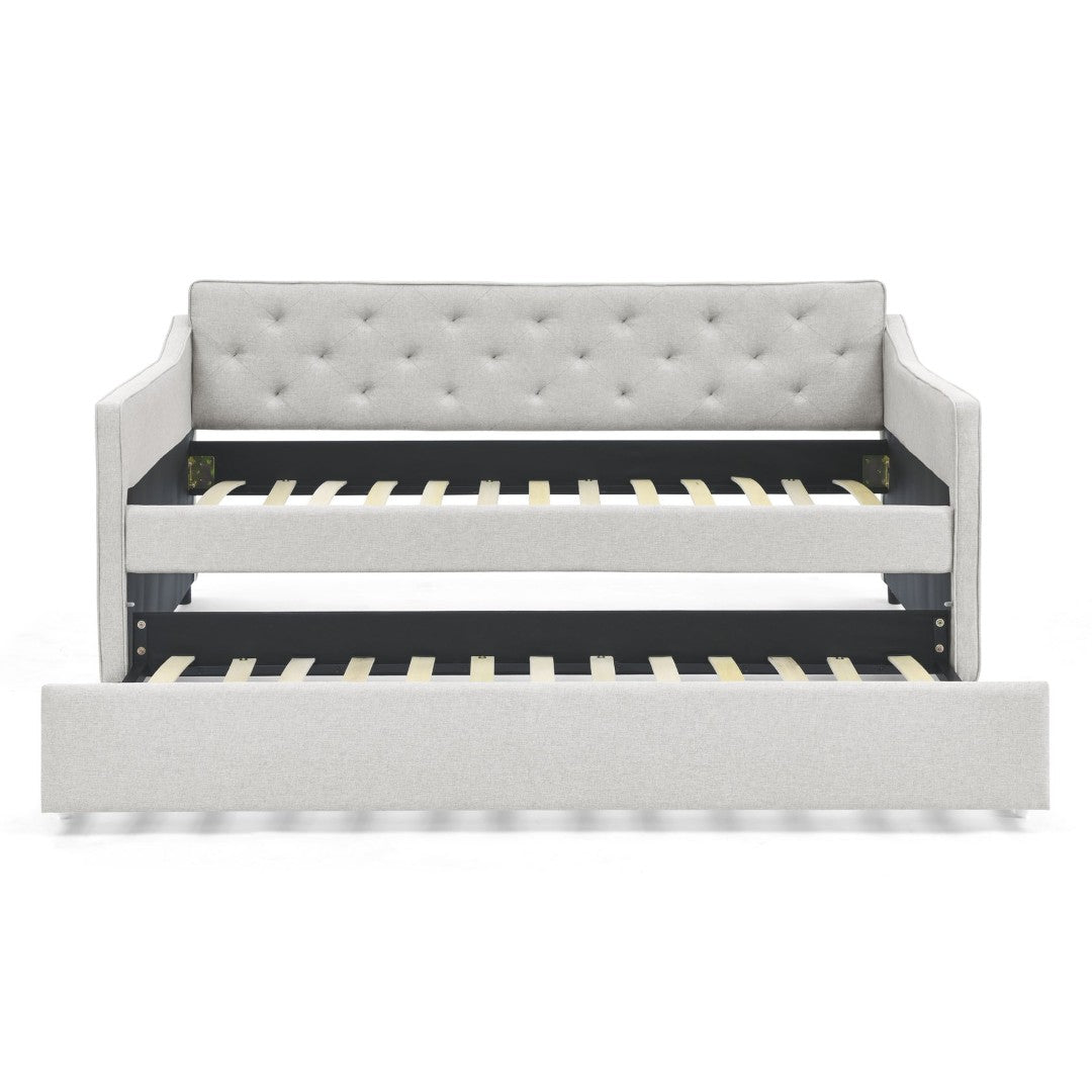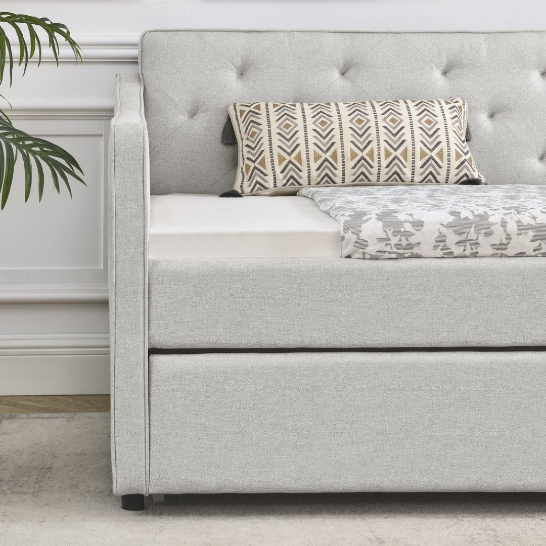 Bring versatile comfort and modern style to your guest room, studio, or child's bedroom with this upholstered twin daybed featuring a twin trundle sleeper. The tufted back and waved arms create a chic, inviting silhouette while sturdy eucalyptus construction and supportive slats ensure reliable everyday use. Ideal for hosting overnight guests or creating a cozy lounging nook, this piece balances form and function with a compact footprint.