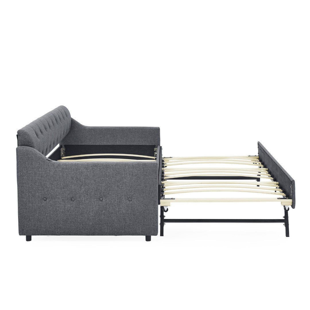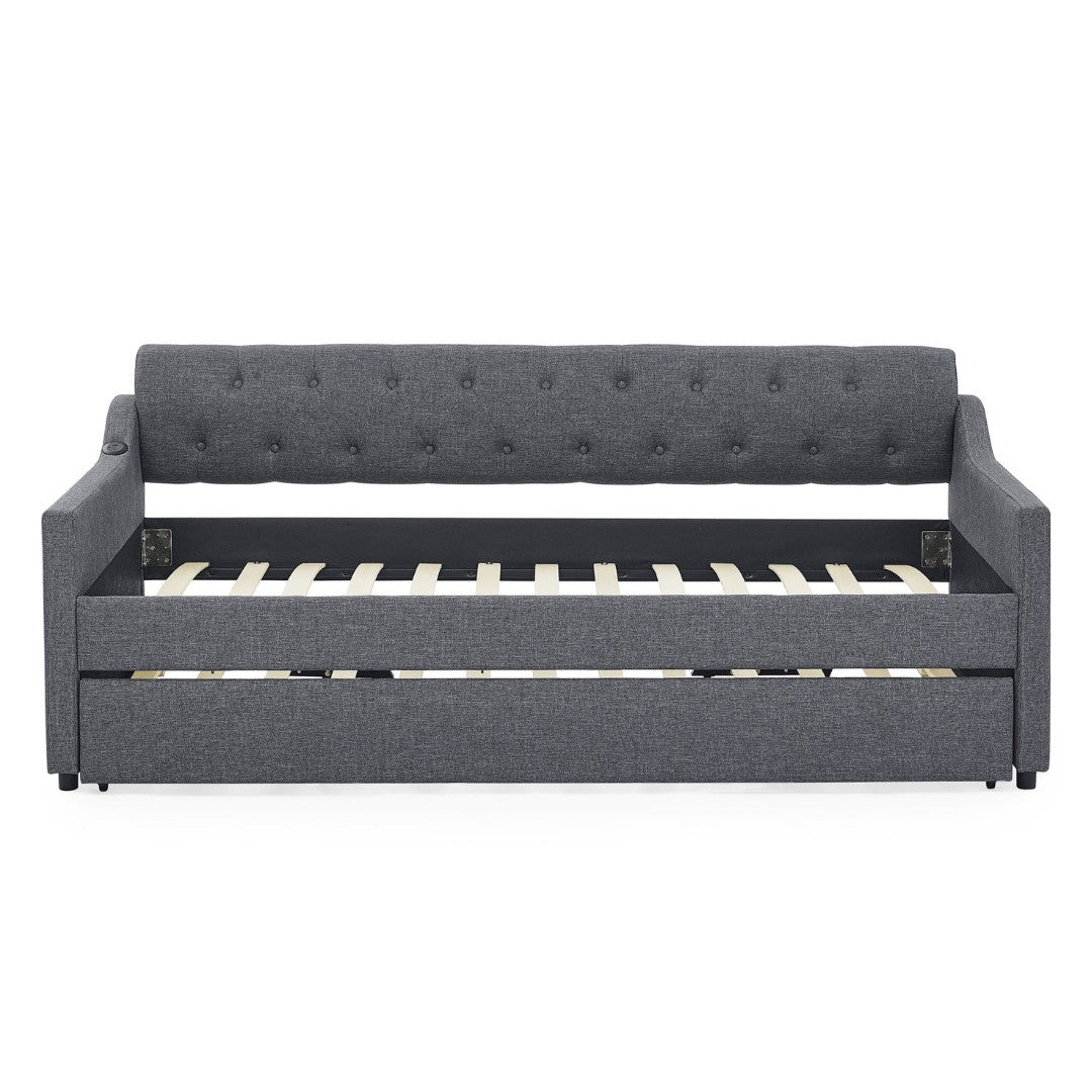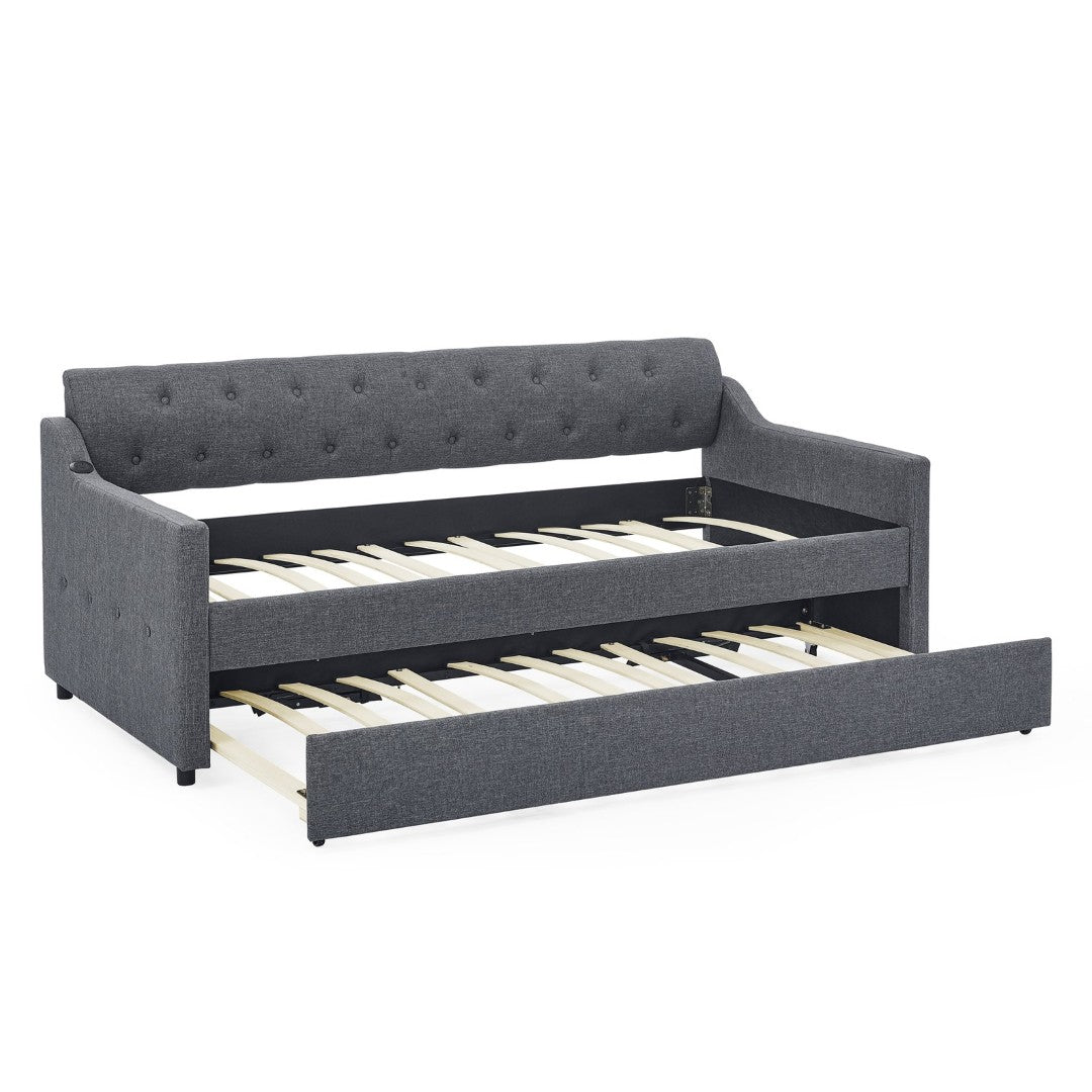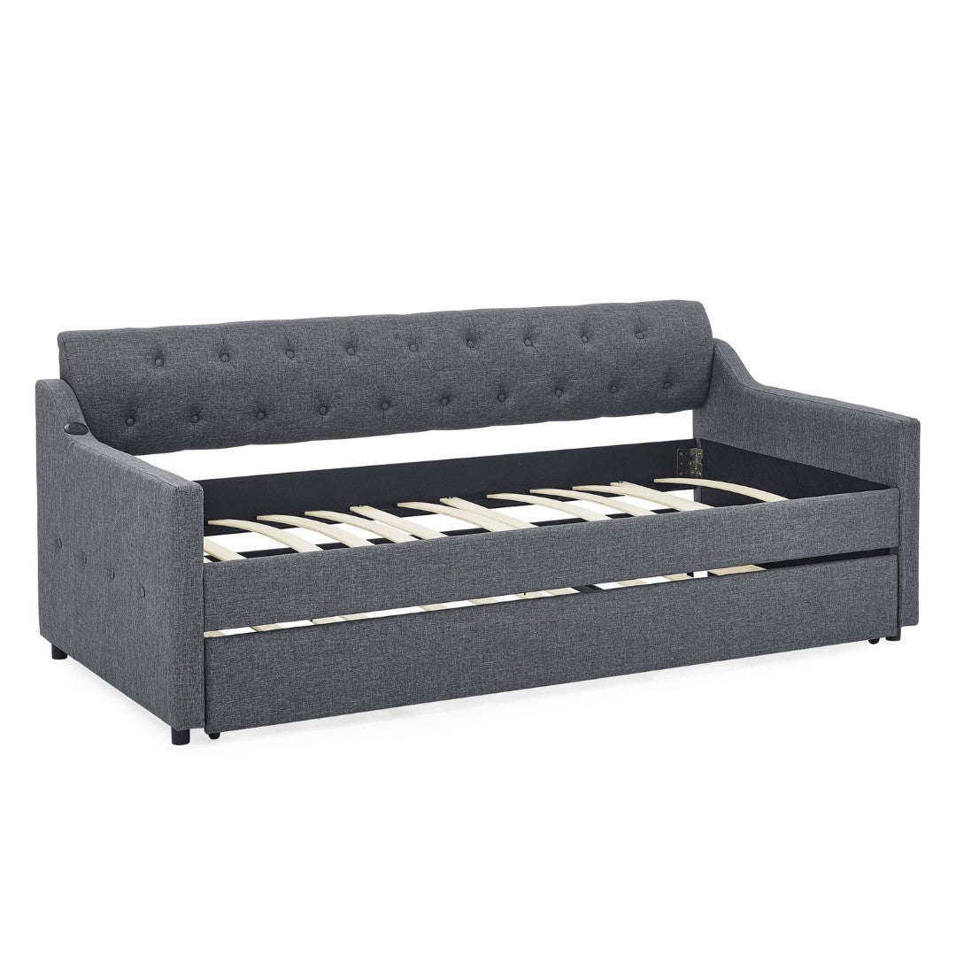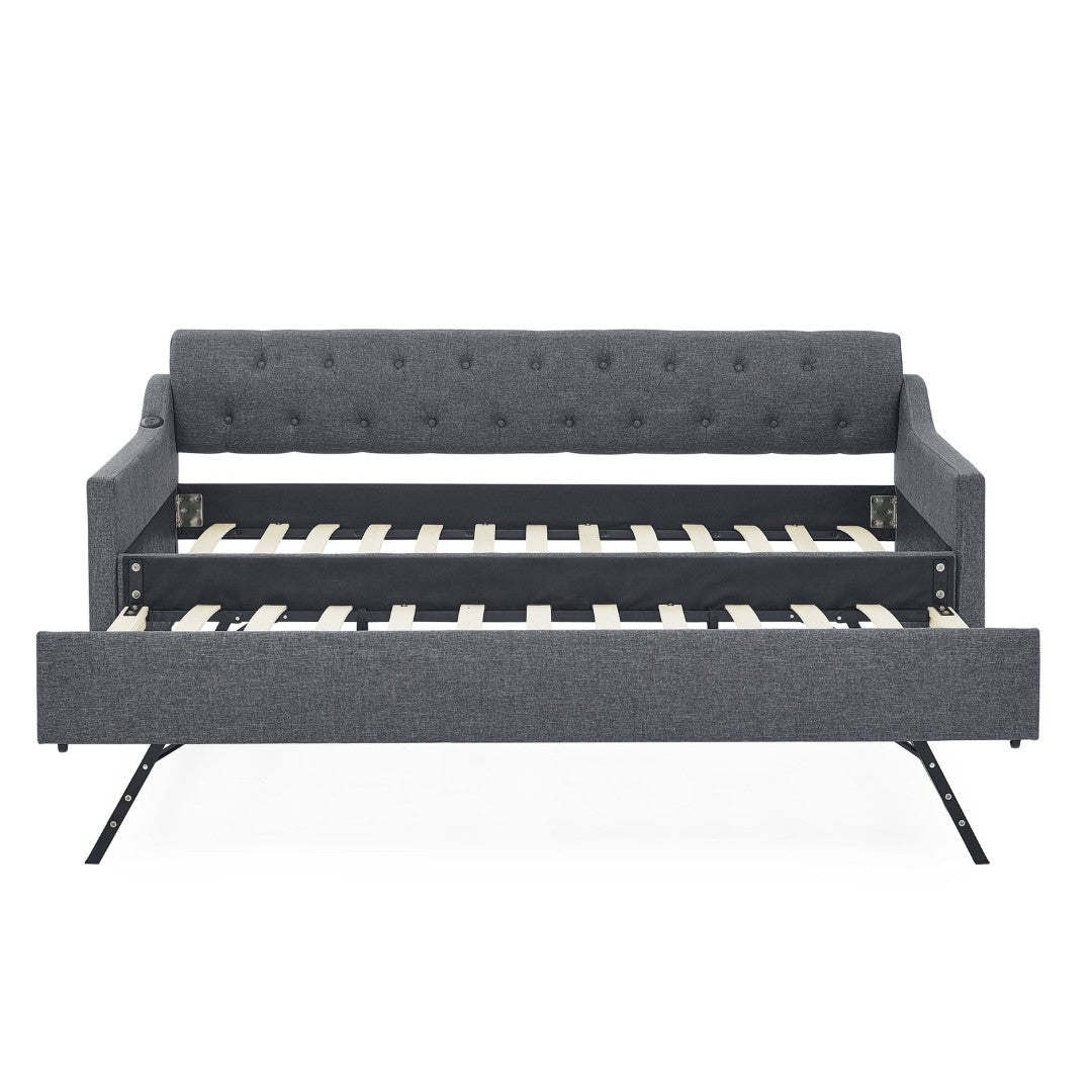 Bring modern functionality and comfortable design to your guest room, home office, or studio apartment with this twin-size upholstered daybed. Upholstered in dark gray linen with clean lines and a supportive frame, it converts easily into a sleeper with an erectable twin trundle and includes a convenient USB charging port—ideal for overnight guests or maximizing small spaces.