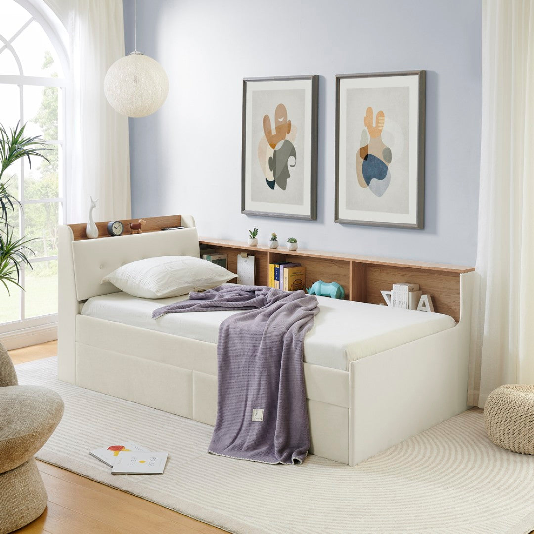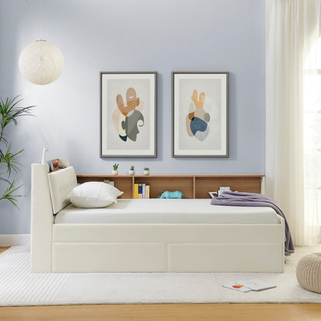 This elegant velvet daybed combines refined style with practical functionality—perfect for small spaces, guest rooms, or a cozy reading nook. Designed with a plush upholstered frame, integrated LED lighting, wireless charging, and generous storage, it blends comfort and convenience while maintaining a sleek, modern silhouette.