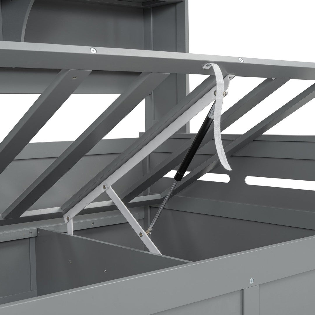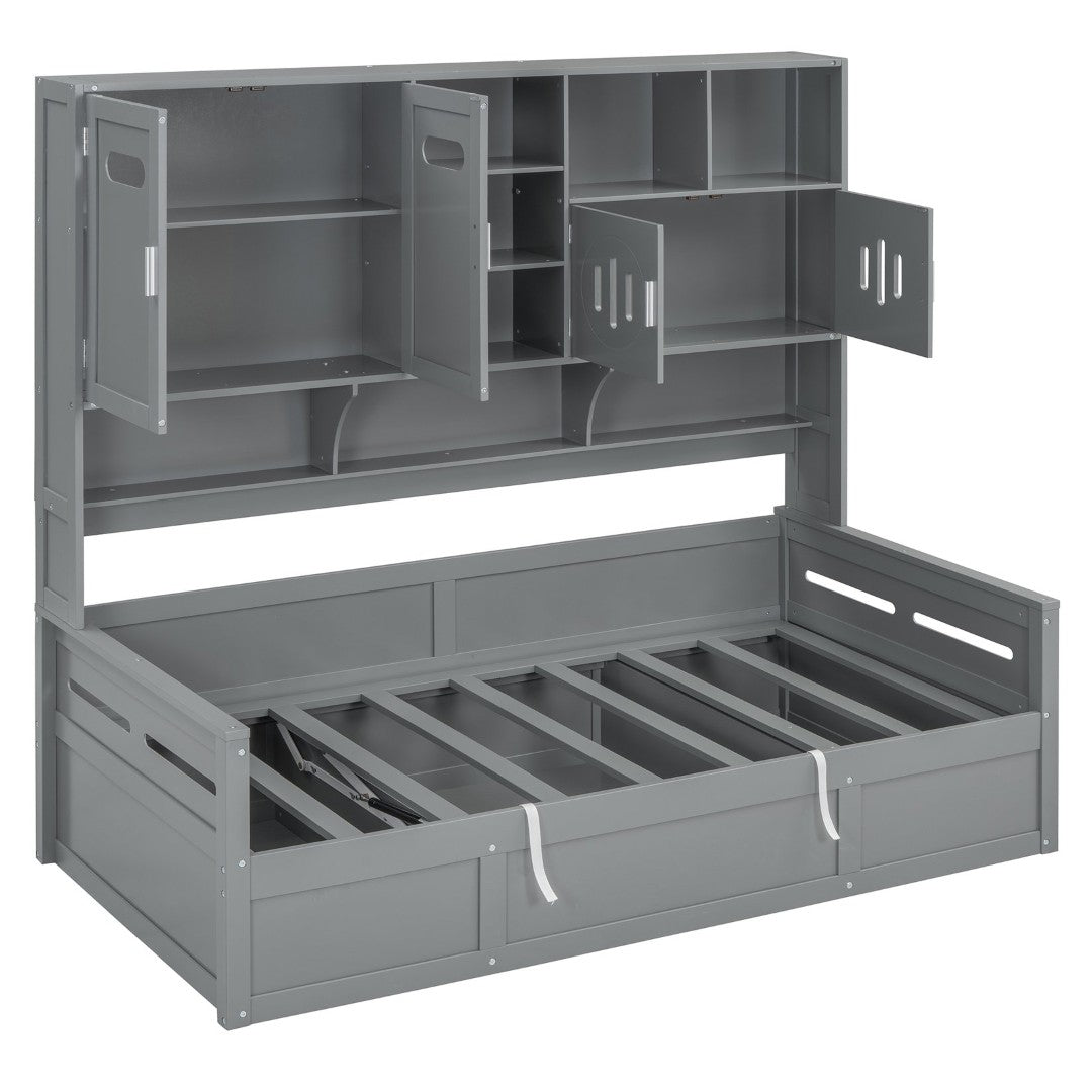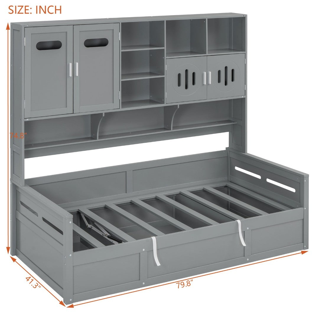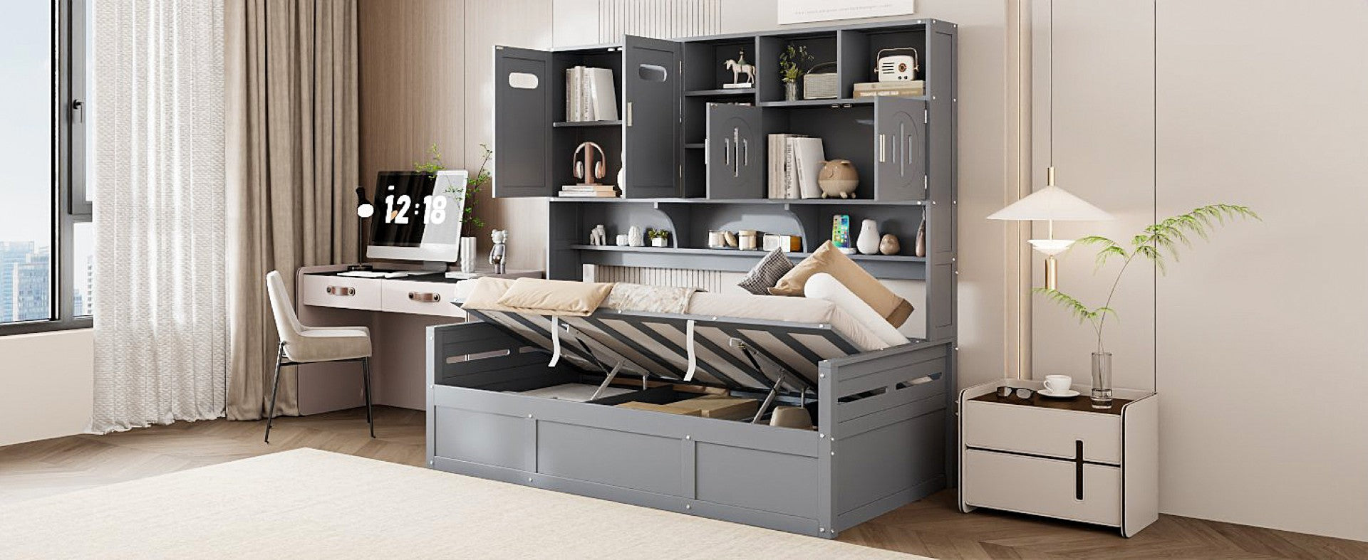Give your bedroom a smart, space-saving upgrade with this twin-size wooden daybed featuring a hydraulic lift and integrated cabinet and shelving. Designed for both functionality and style, it combines sturdy construction with clever storage to keep essentials within reach while maintaining a clean, modern look. Ideal for small rooms, guest spaces, or kids’ bedrooms, the daybed offers easy access to under-bed storage and durable support for daily use.