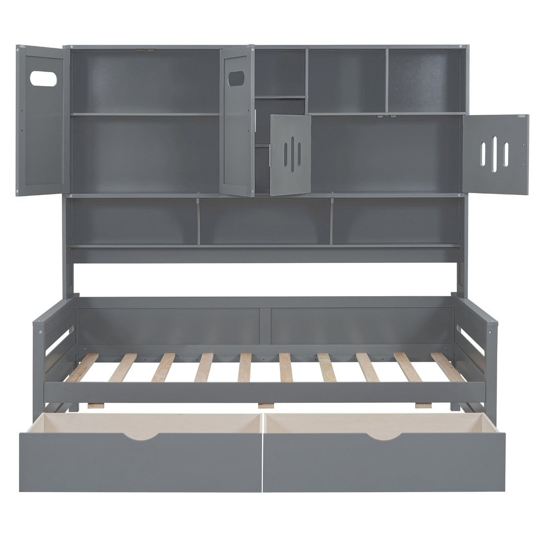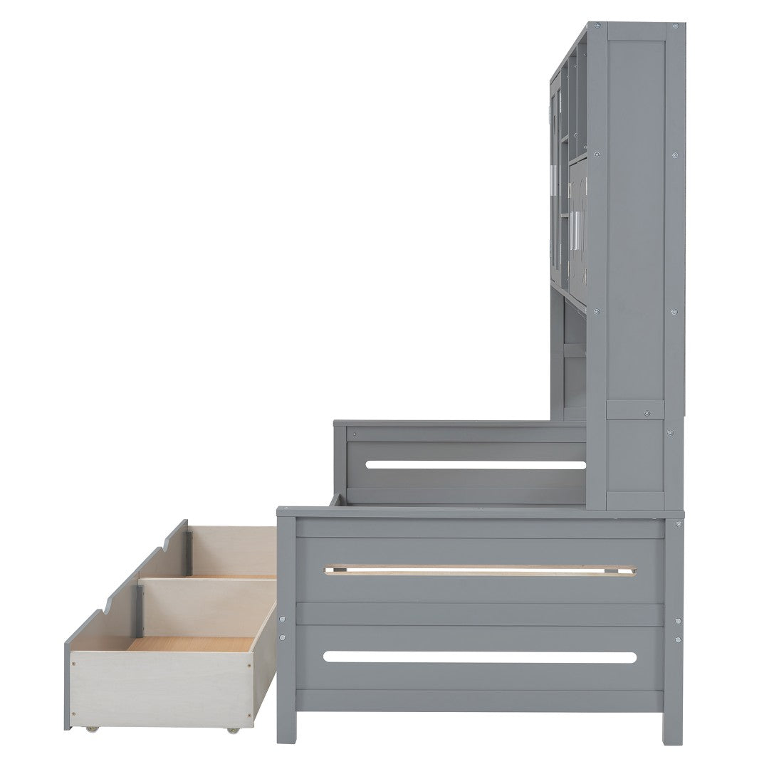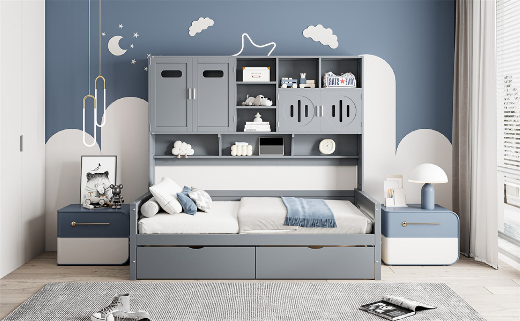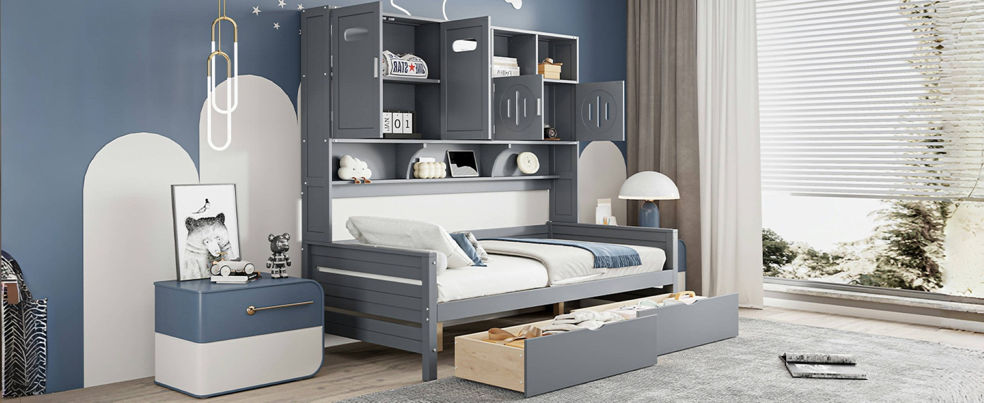 Give your bedroom a smart, space-saving upgrade with this twin wooden daybed that combines sleeping, storage, and display in one stylish unit. Designed for durability and everyday use, the integrated back cabinet and shelves keep books, decor, and essentials within reach while two smooth-gliding under-bed drawers maximize floor space. Finished in a versatile gray, the piece blends modern functionality with classic wood craftsmanship.