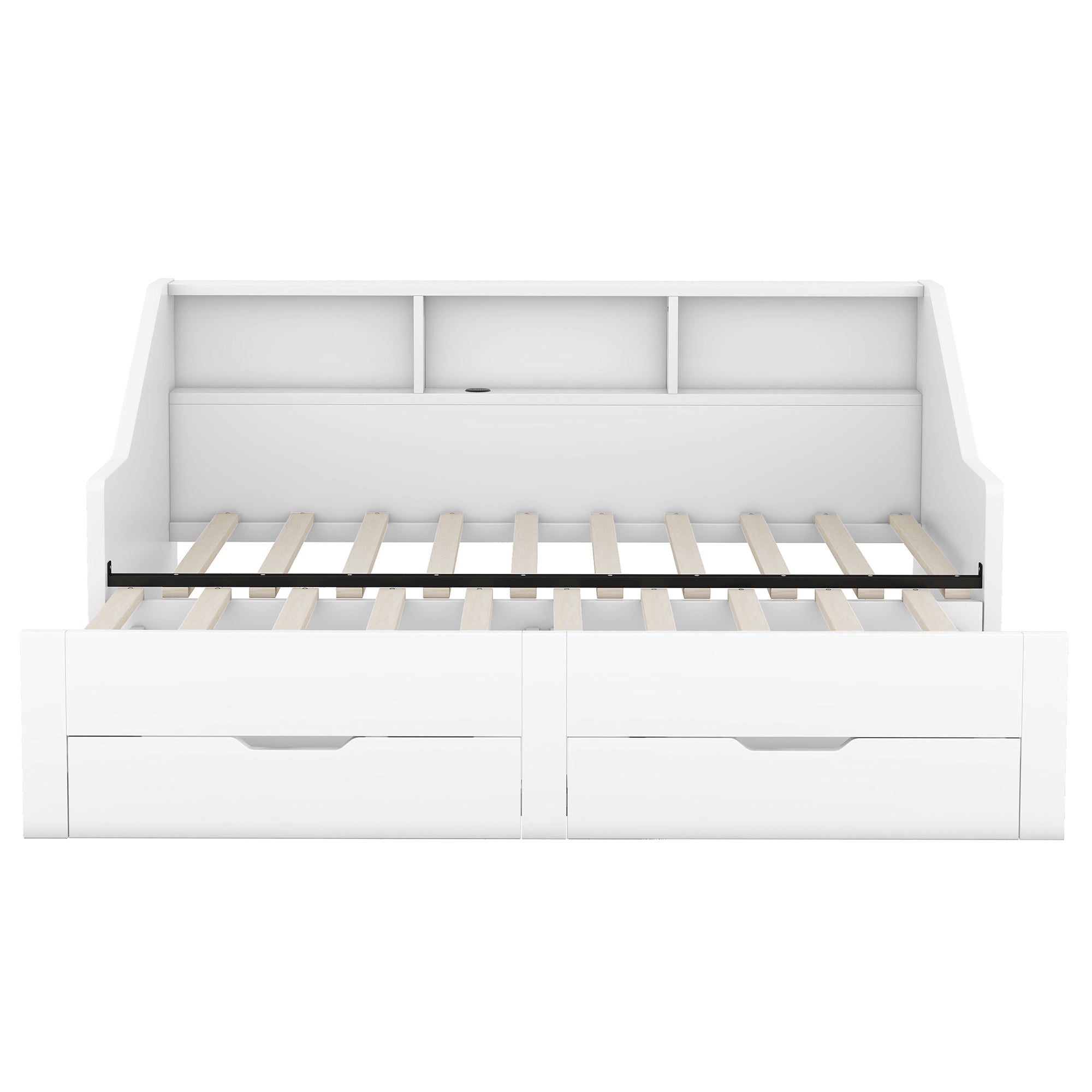 Transform any bedroom with a versatile, space-saving daybed that adapts from a twin to a king configuration while offering generous storage and modern conveniences. Clean lines and a crisp white finish make it a stylish focal point, while practical features—like a same-height pull-out trundle, built-in bookcases, large drawers, and a USB charging station—keep essentials organized and devices powered within reach.