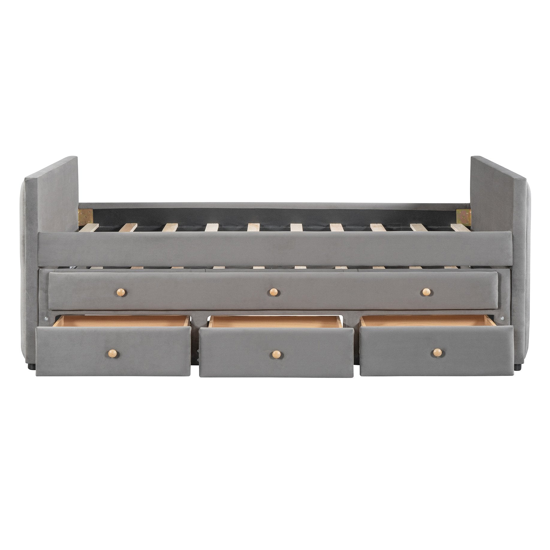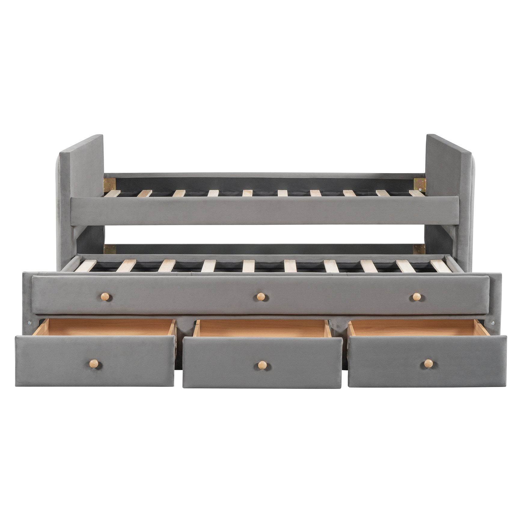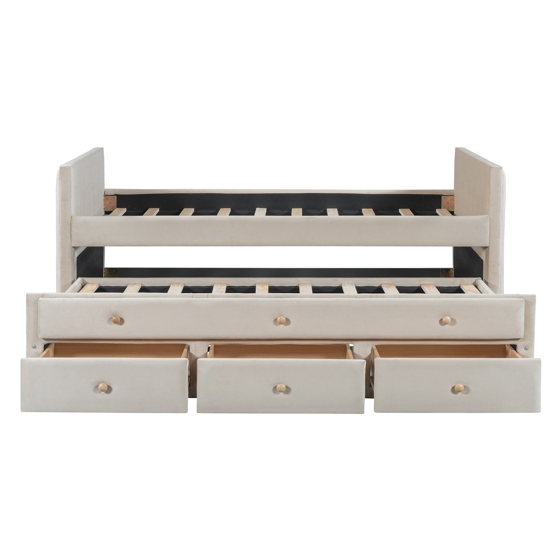 Bring stylish functionality to a bedroom or guest room with this elegant upholstered daybed featuring a convenient pull-out trundle and three built-in drawers—ideal for sleepovers, guests, or space-saving everyday use. Upholstered in soft velvet with a clean silhouette, the design pairs classic comfort with practical storage and a sturdy frame for long-term reliability.