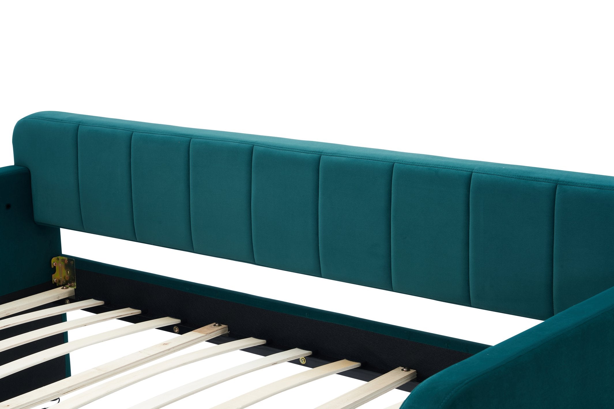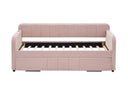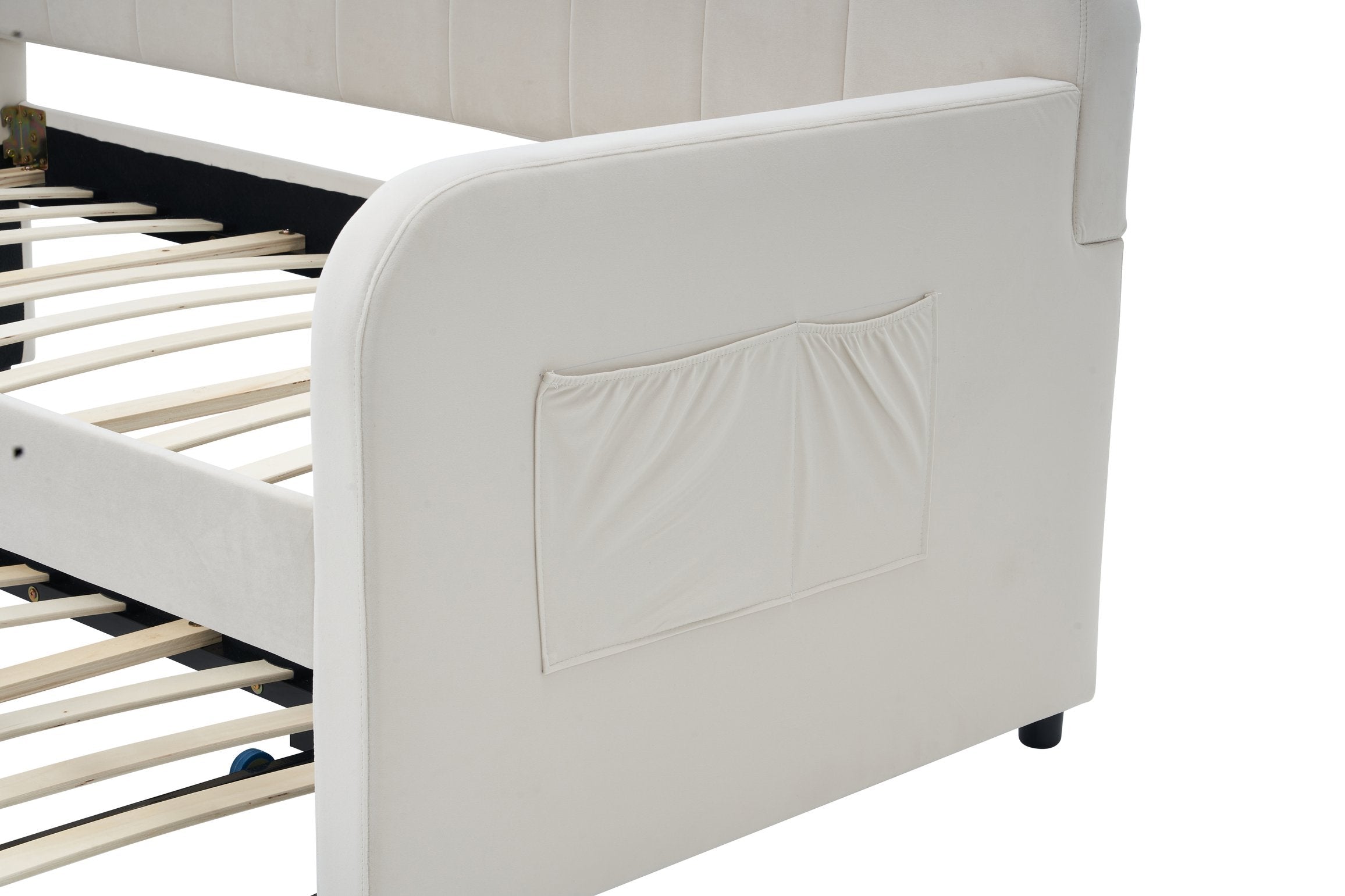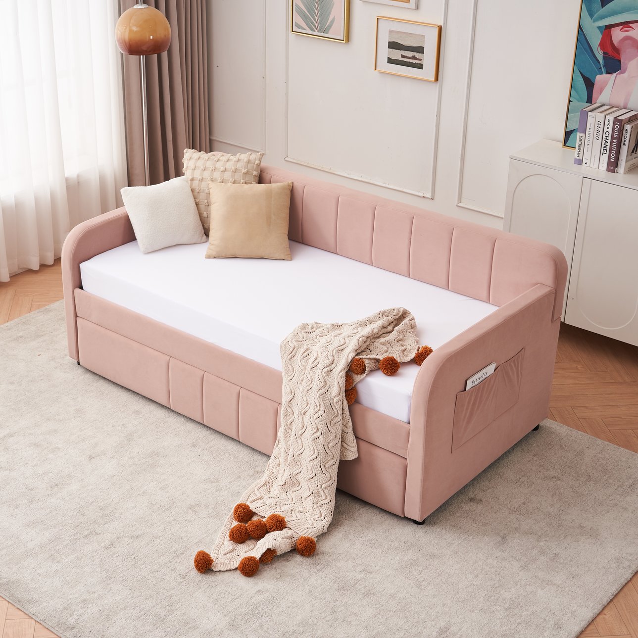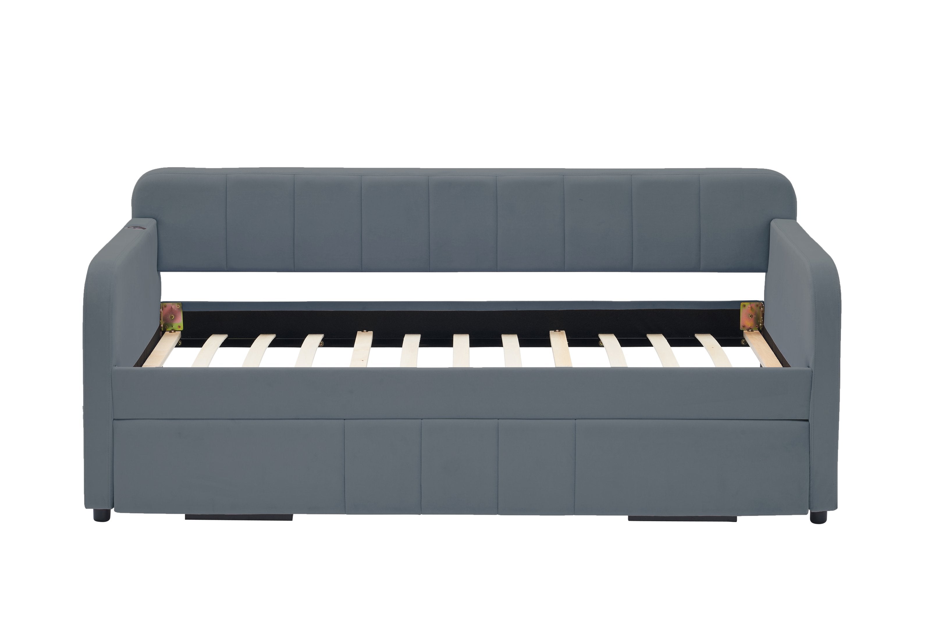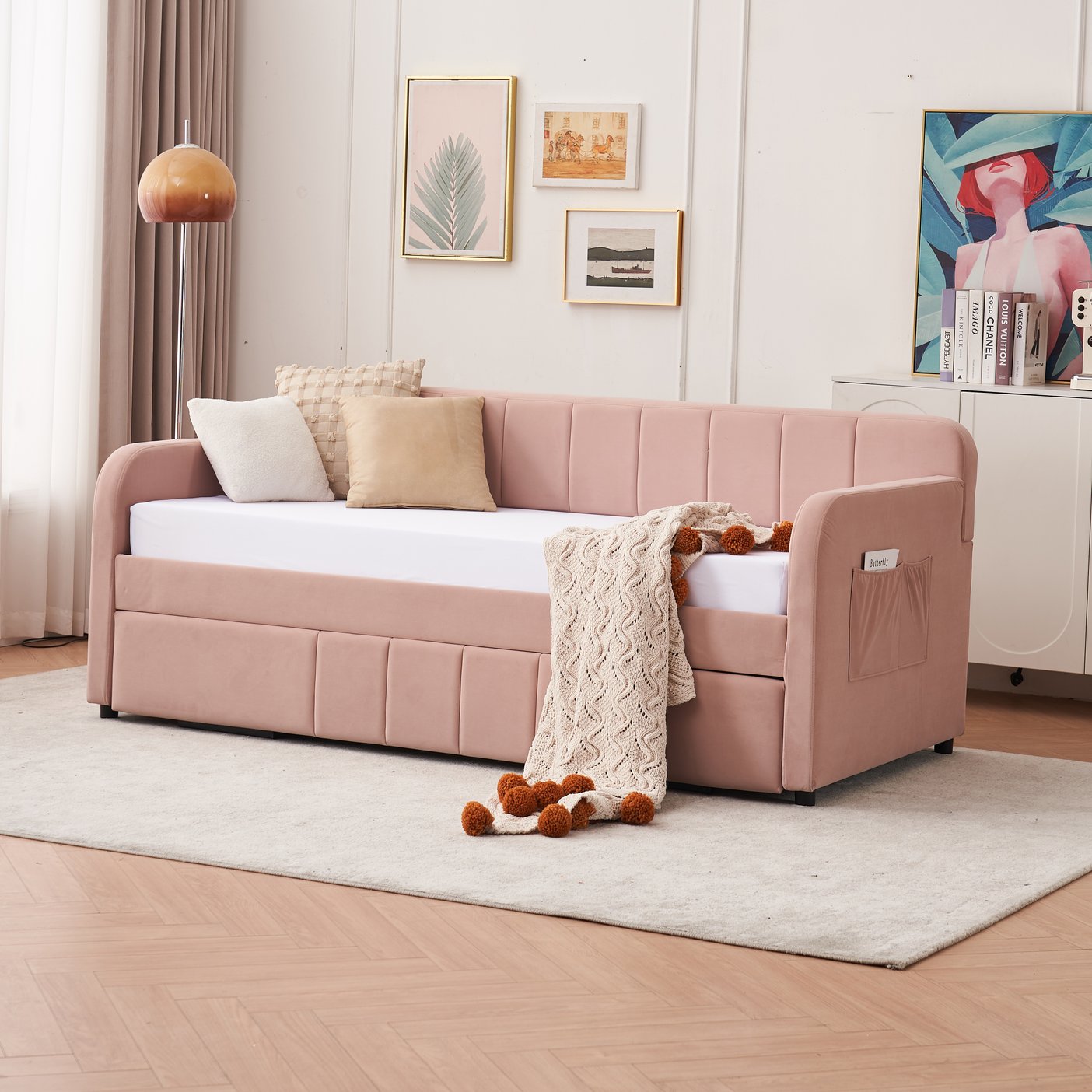 Transform any bedroom, guest room, or living space into a stylish, space-saving retreat with this upholstered twin daybed and pull-out trundle. Plush velvet upholstery, a supportive wood-slat system, and a sturdy pine/MDF/iron frame combine to deliver comfort, durability, and a polished look that suits modern and transitional interiors. Ideal for daily lounging or accommodating overnight visitors, this daybed offers a neat footprint with flexible sleeping options.