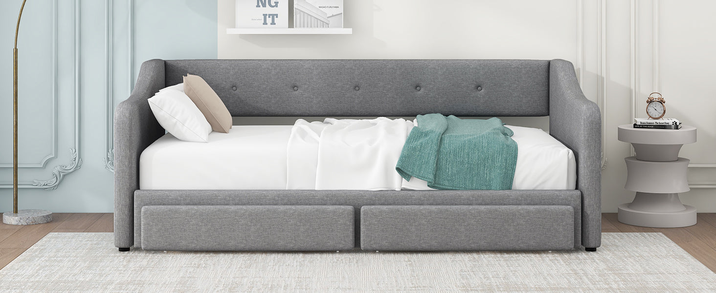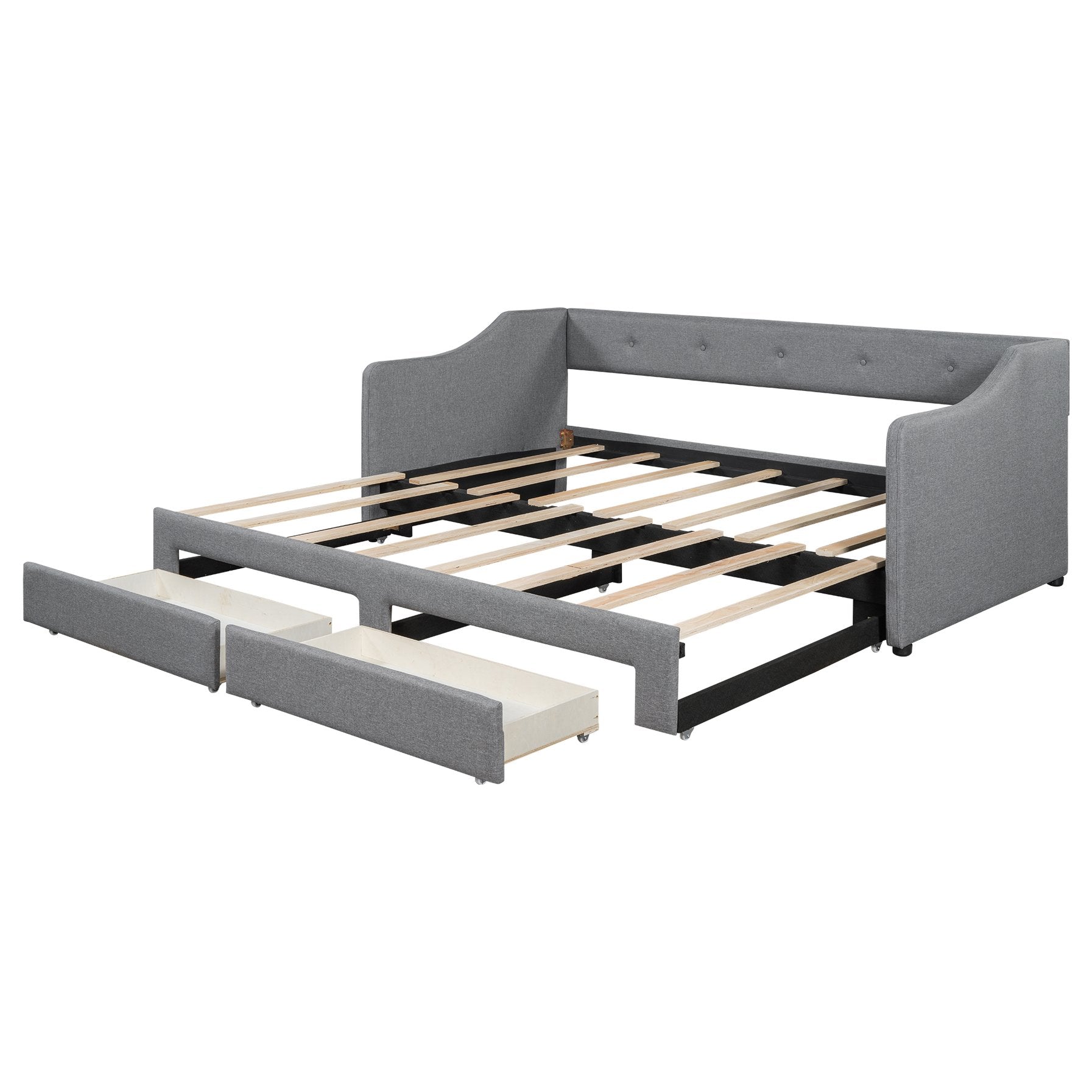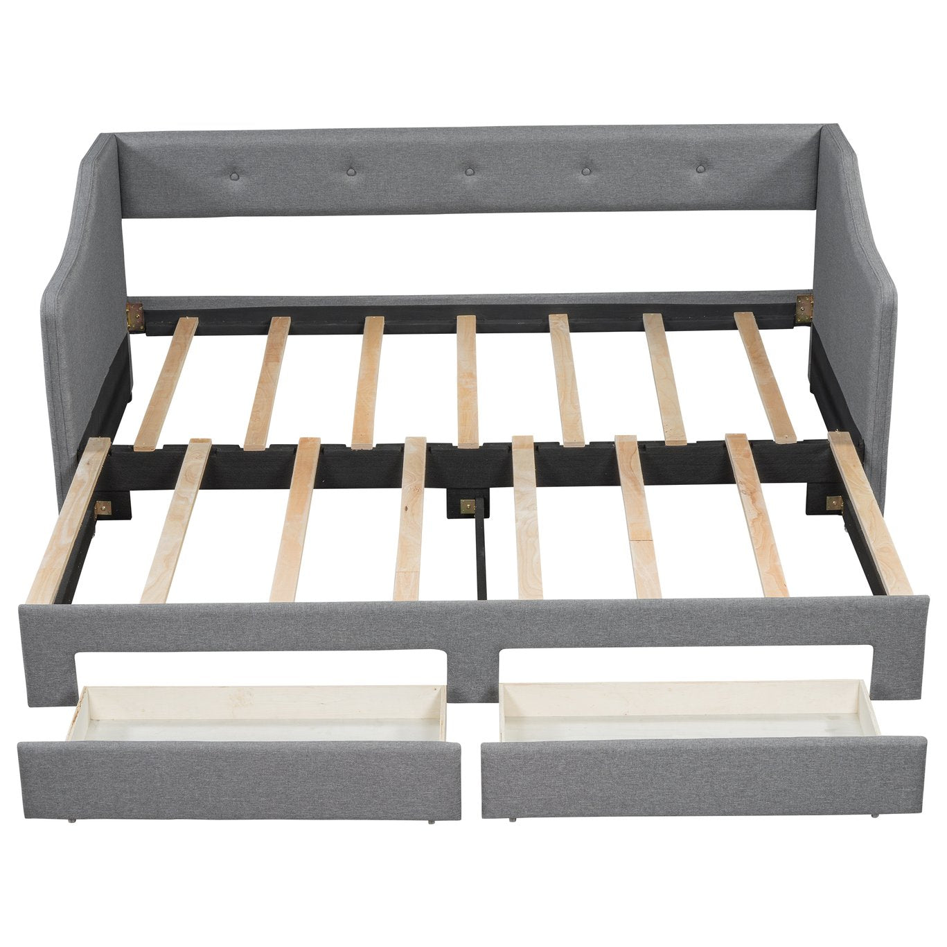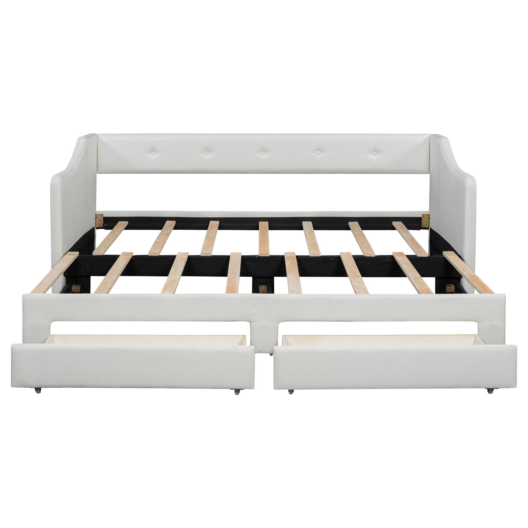 Transform any room with this versatile upholstered daybed that converts from Twin XL to King size, offering stylish seating by day and a comfortable sleep surface by night. Upholstered in soft beige fabric with a buttoned back and foam-padded sides, it blends designer looks with ergonomic support. Two built-in drawers provide discreet storage for bedding and linens, while sturdy plywood/MDF construction ensures lasting durability.