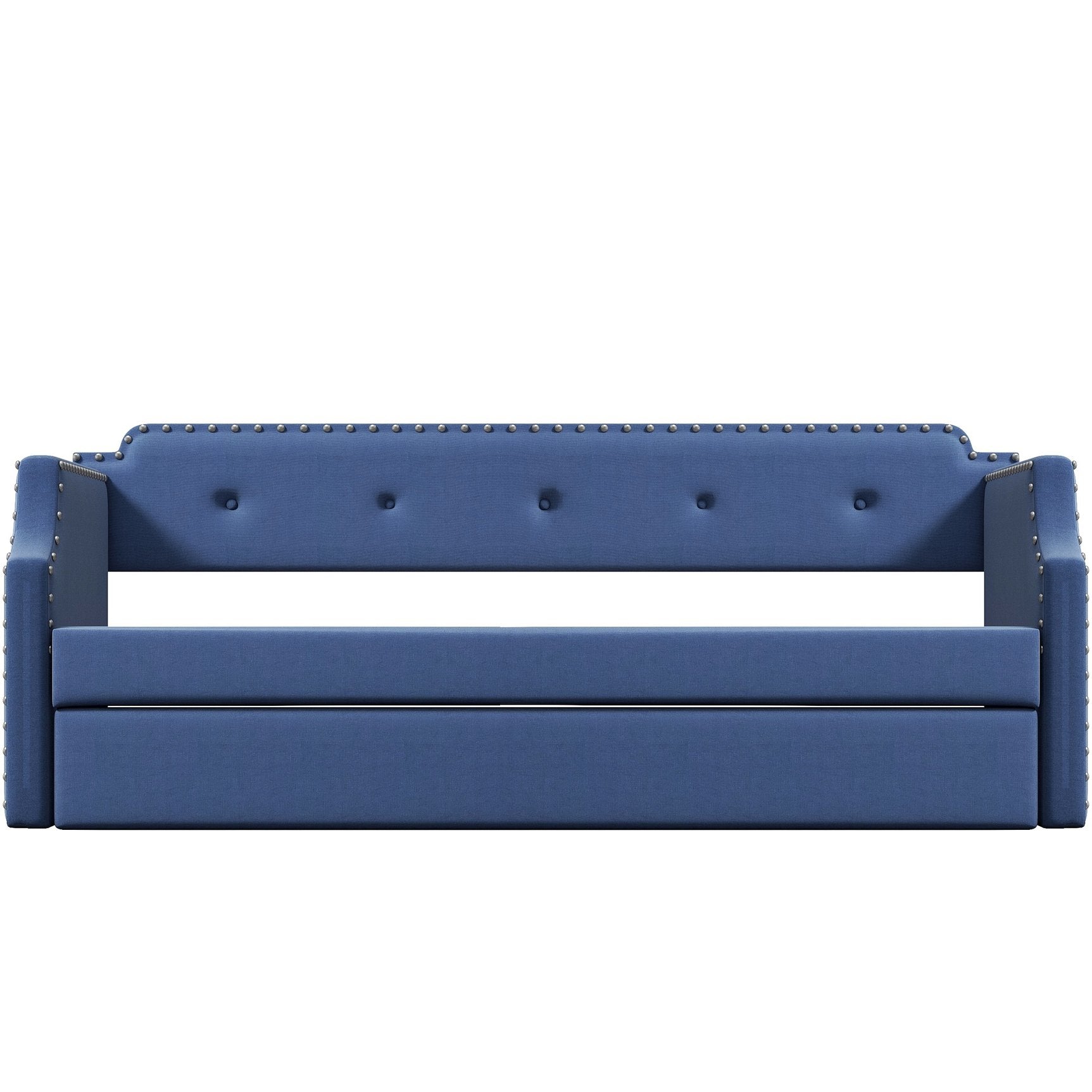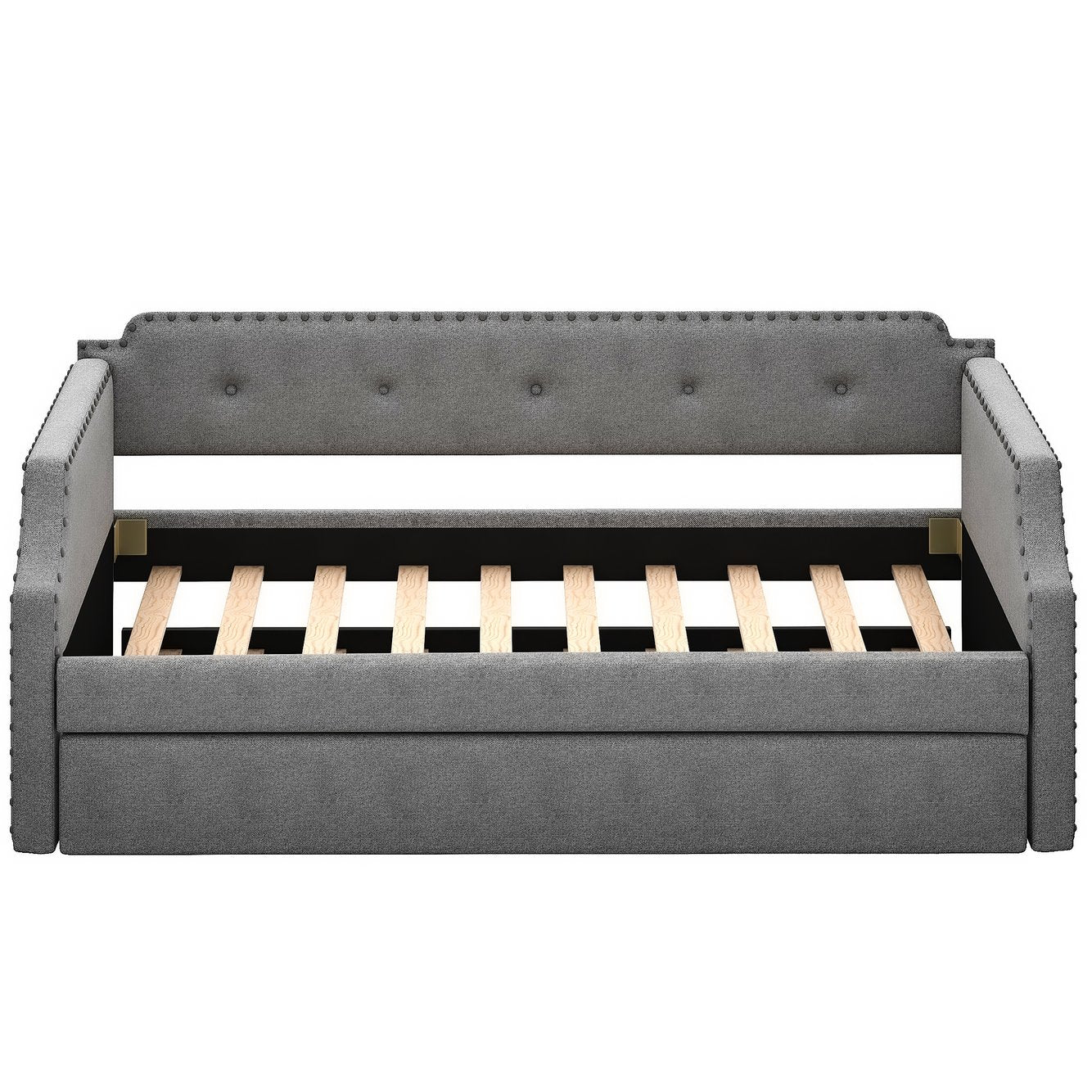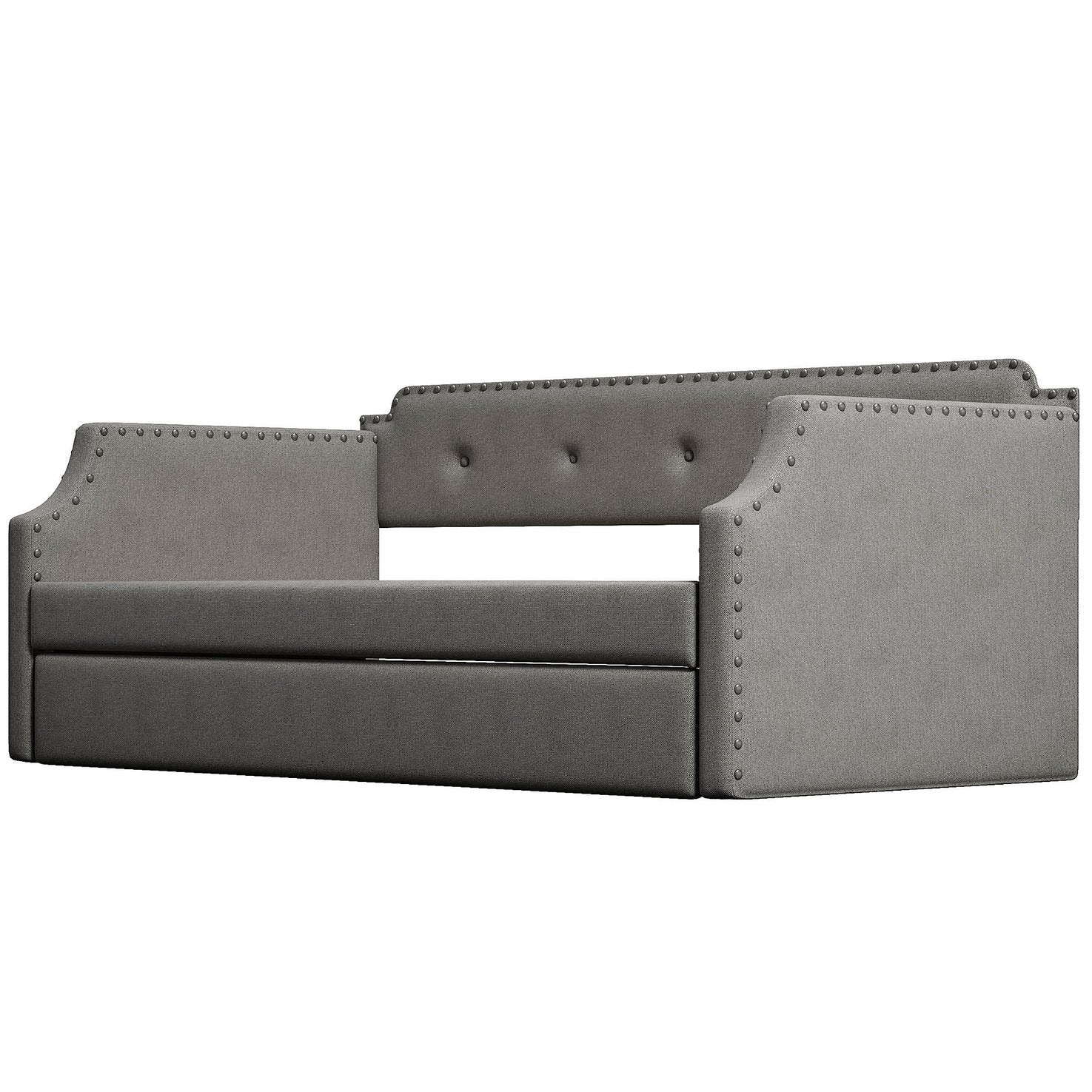 Create a stylish, space-saving seating and sleeping solution with this upholstered daybed and pull-out trundle—ideal for guest rooms, home offices or living areas. Its classic lines, nailhead trim and arched back provide a French-country inspired look while the durable wood-slat support and engineered wood frame deliver reliable everyday use.