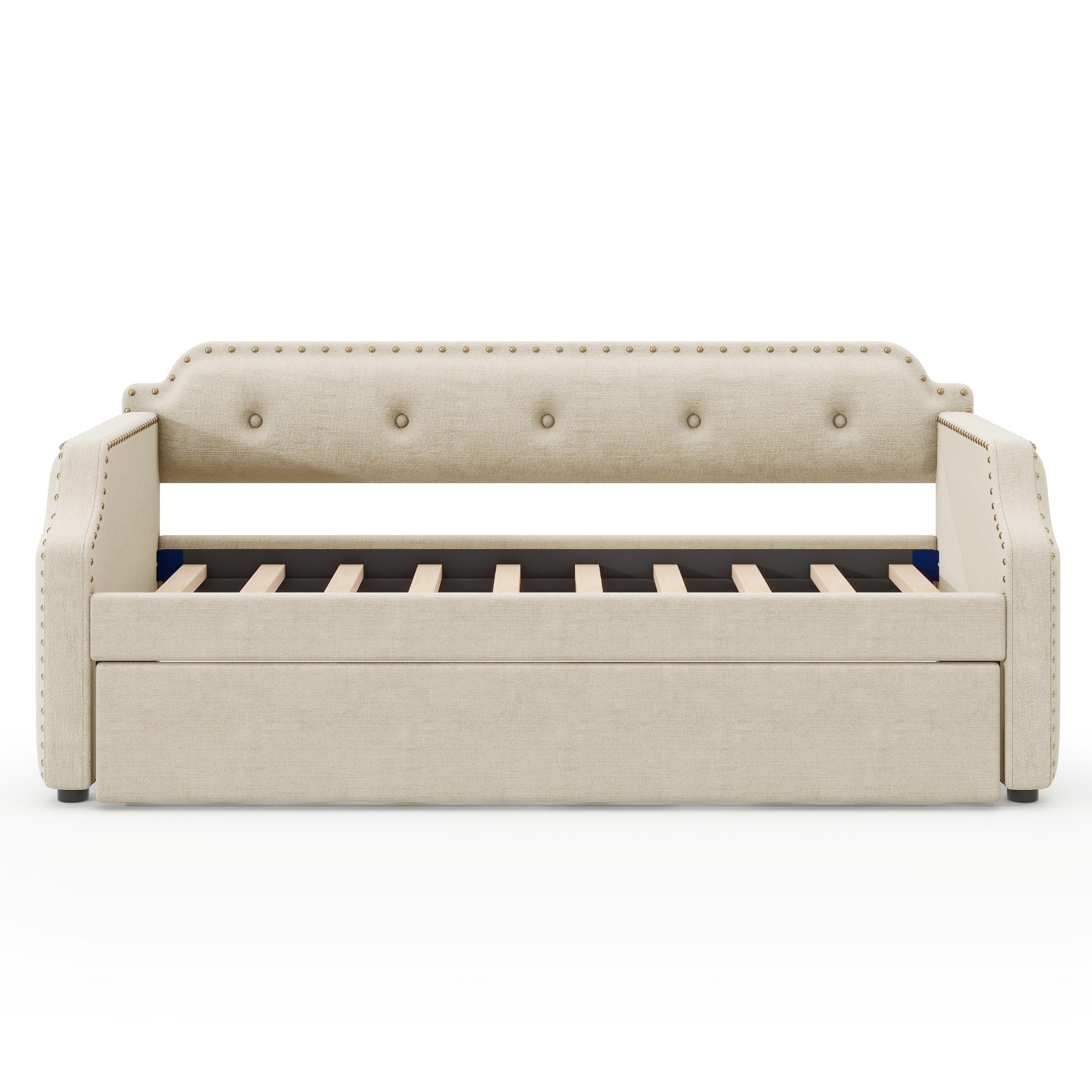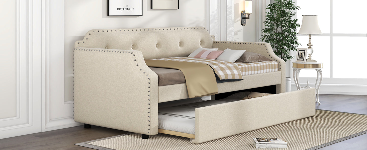- ①[Upholstered Daybed] Elegant style Upholstered in carefully-selected linen fabric, features two armrests, this daybed with trundle not only suits any home décor, but is timeless in its design. The soft textile bedhead creates coziness, while the single color of the design creates versatility.