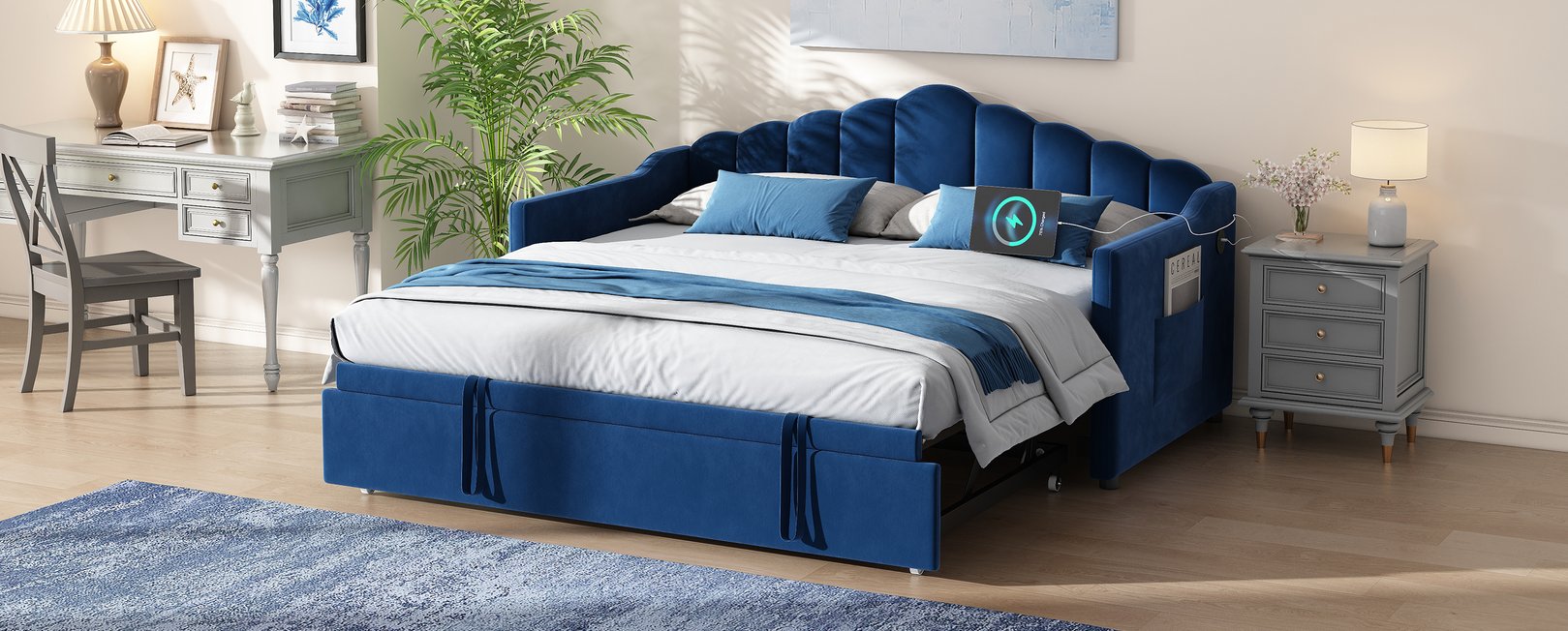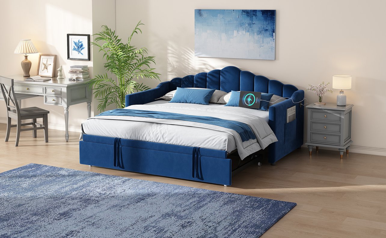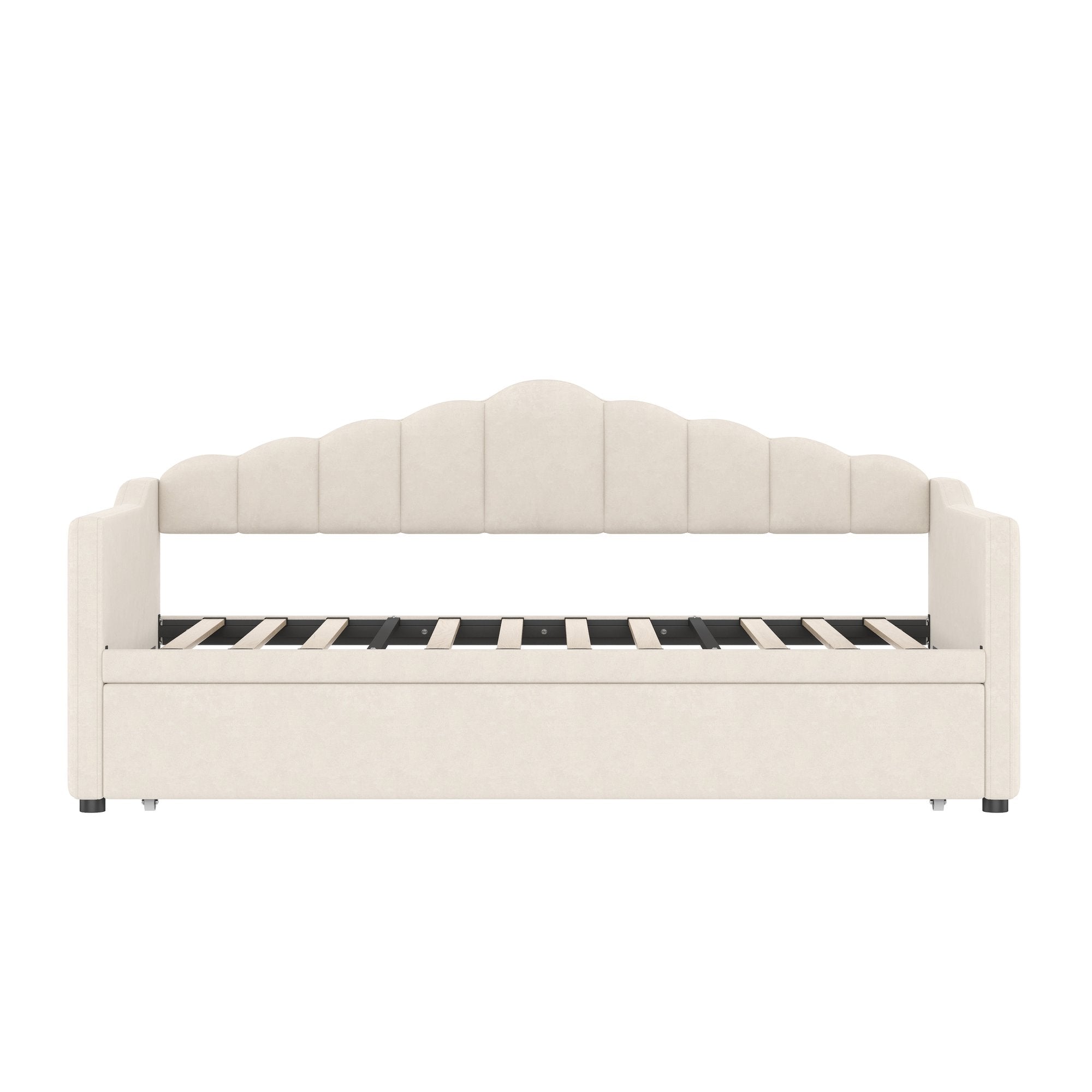 Bring style and smart functionality to a small space with this upholstered twin daybed. Its clean, contemporary silhouette and soft beige velvet make it an attractive seating area by day and a comfortable sleeping solution by night. The height-adjustable pop-up trundle expands sleeping capacity without sacrificing floor space, while integrated charging ports and dual side pockets add modern convenience for everyday living.