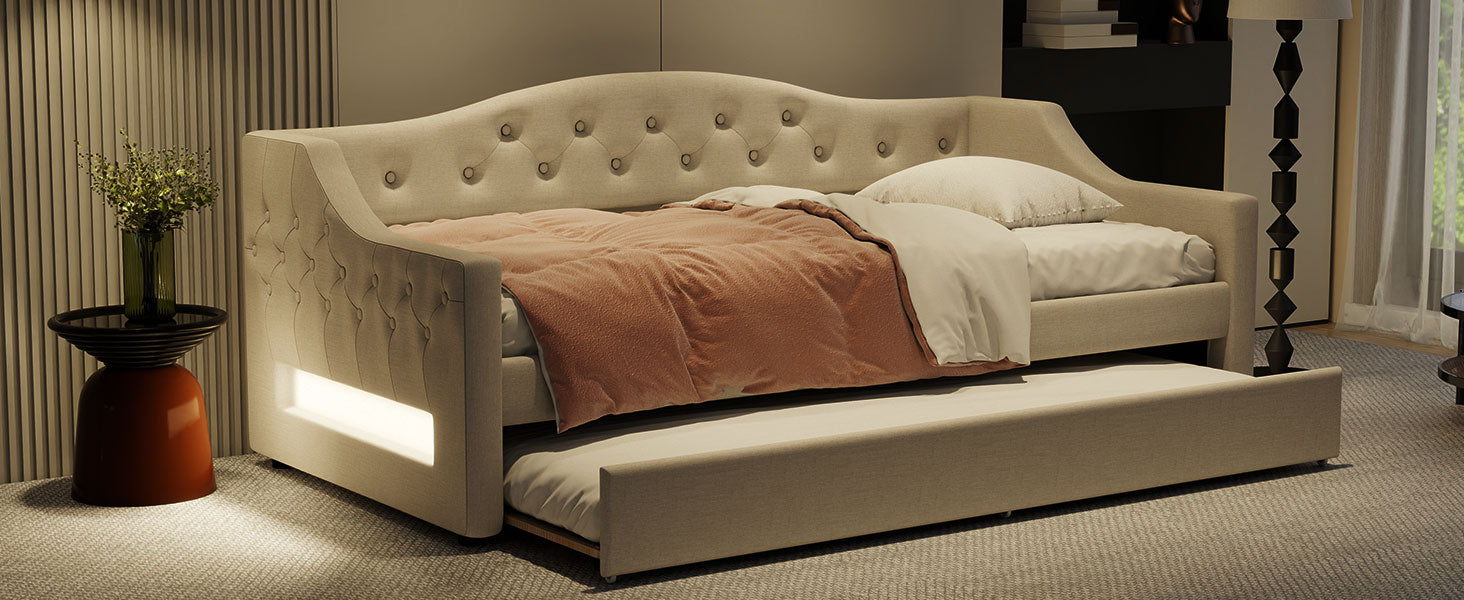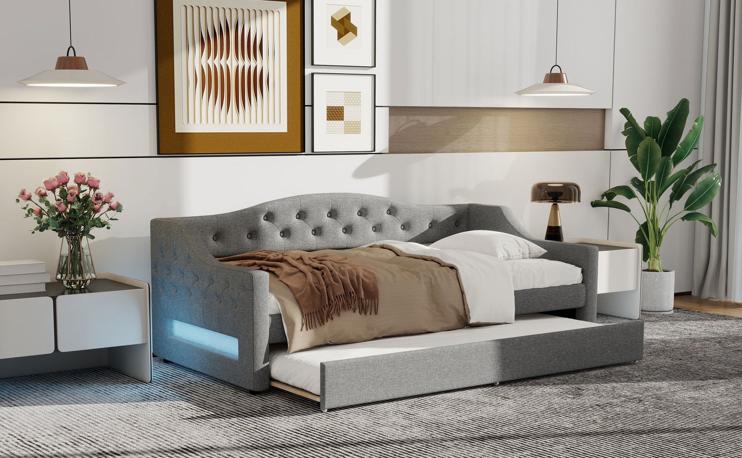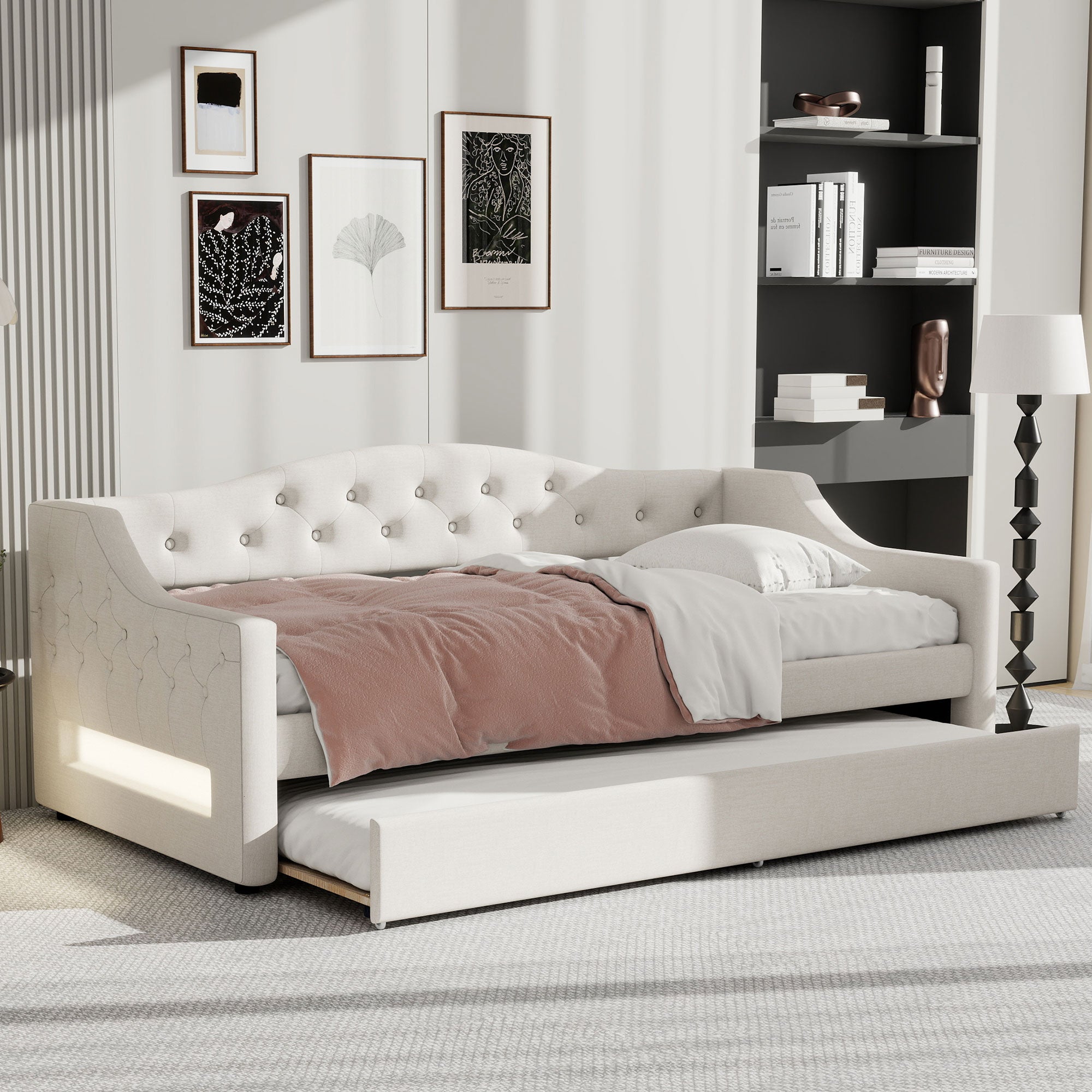 Bring versatile comfort and modern style to your guest room or apartment with this upholstered Twin XL daybed featuring an integrated LED belt and a convenient pull-out trundle. Wrapped in a neutral beige linen cover over a sturdy MDF frame, it offers a clean silhouette that complements many decor styles while delivering practical sleeping solutions for overnight visitors.