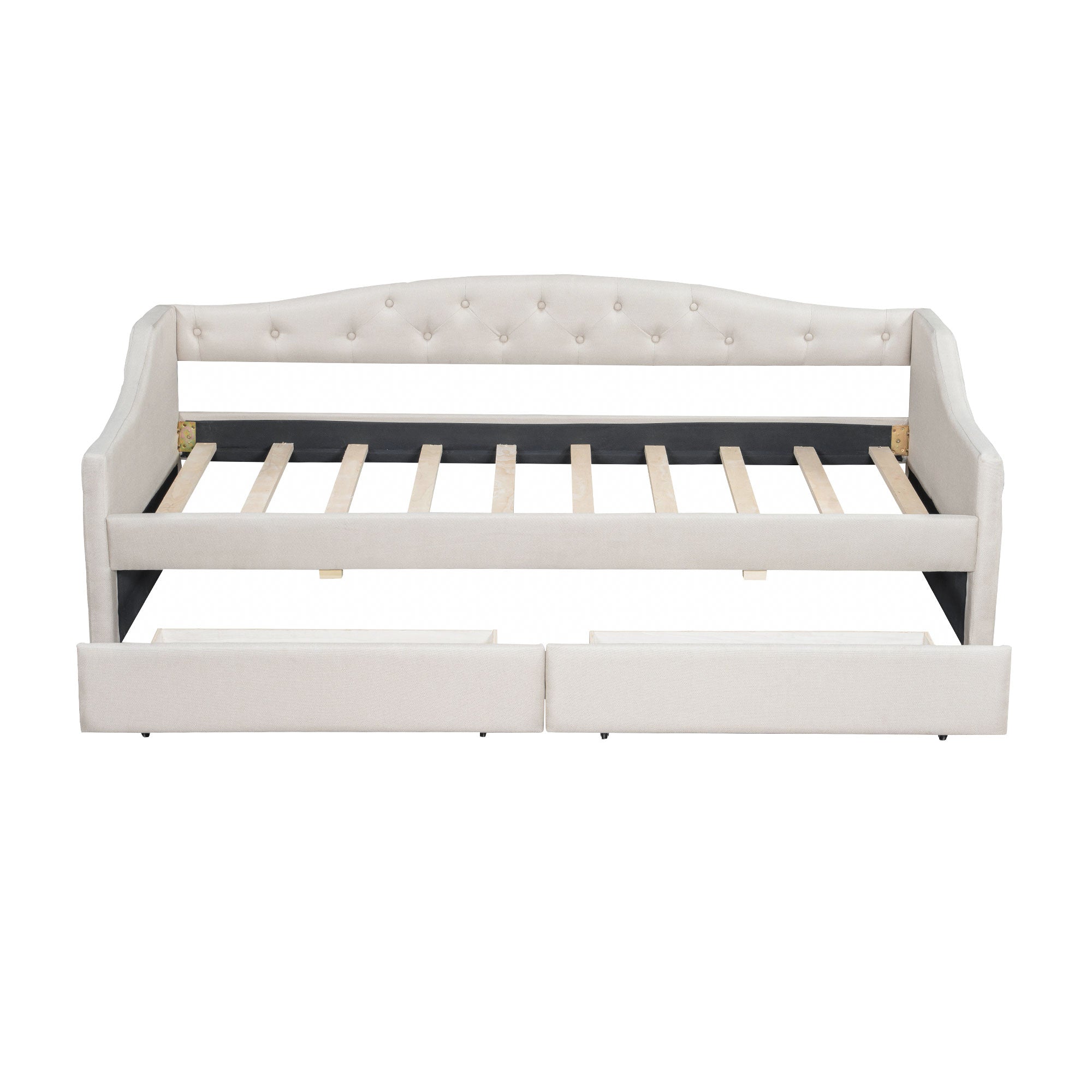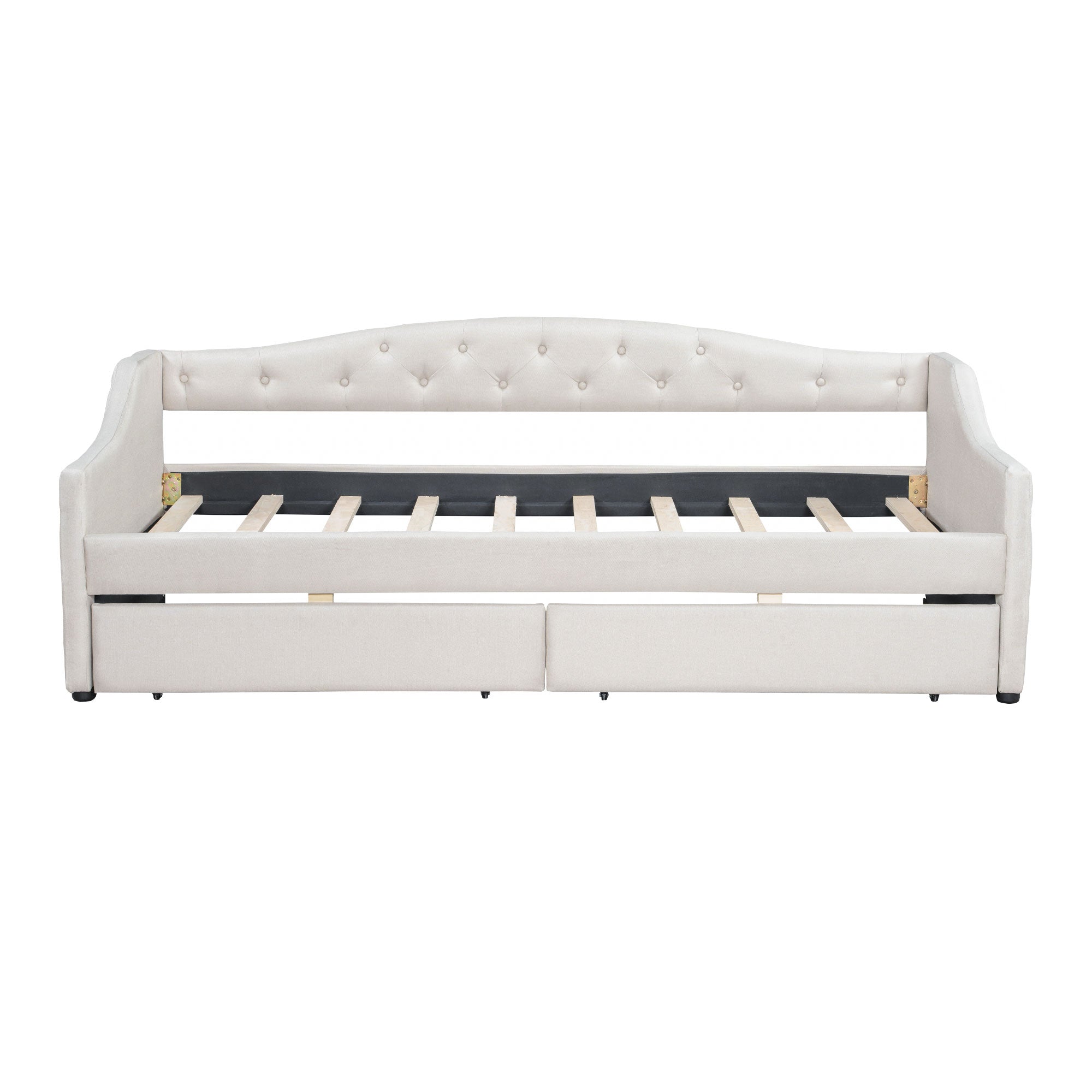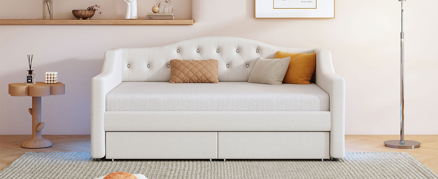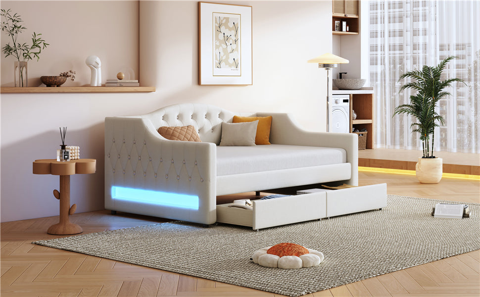 Elevate your bedroom with this elegant upholstered Twin XL daybed — a stylish, multifunctional piece that blends comfort, storage, and modern convenience. Wrapped in soft beige linen and featuring a subtle LED belt, it creates a warm, inviting focal point while maximizing space with two built-in drawers. Ideal for guestrooms, studio apartments, or teen rooms, this daybed combines a refined silhouette with practical details for everyday living.
