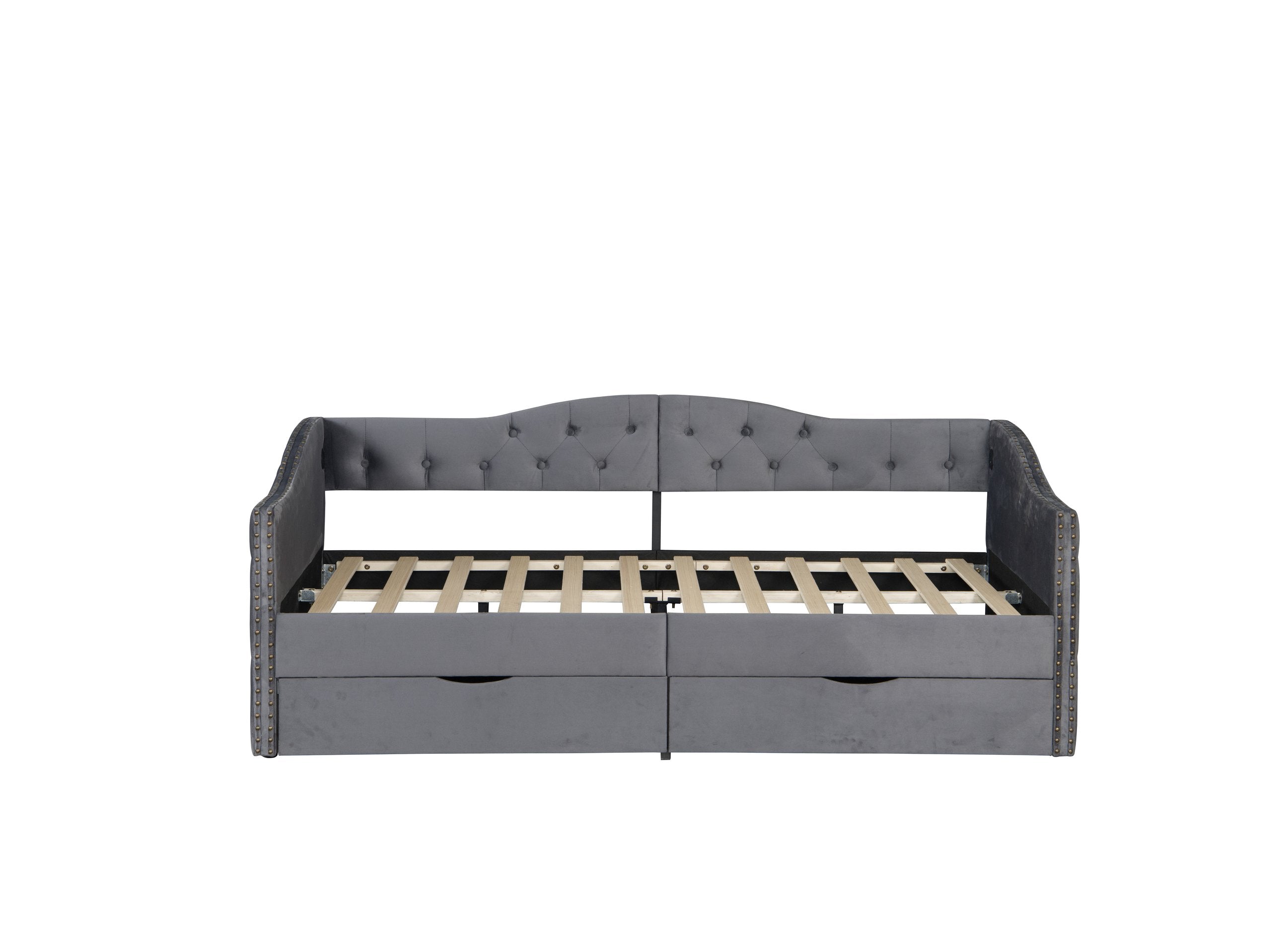 Create a stylish, space-saving focal point for your bedroom or guest room with this upholstered twin daybed. Wrapped in plush velvet and built on a sturdy plywood frame, it combines comfort and functionality with built-in storage drawers, a slatted support system that requires no box spring, and a modern grey finish that complements a variety of decor styles.
