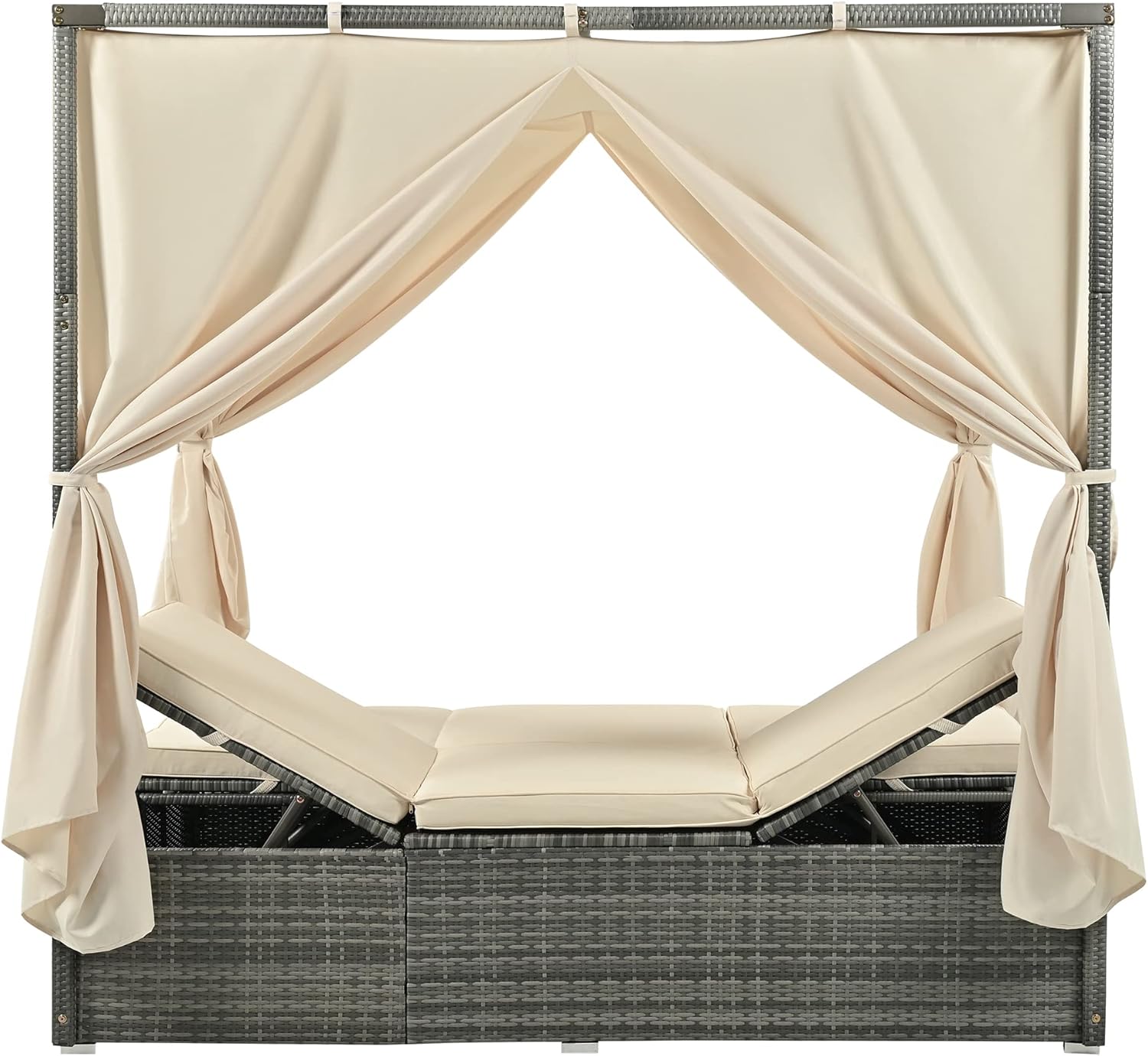 - This stylish rattan rectangular patio chaise lounge has a four-sided canopy, side curtains and a top curtain for both shade and privacy.Durable Luxury for Long-lasting Enjoyment: Crafted for outdoor durability, this sunbed features tightly woven PE rattan wicker on a sturdy steel frame. Withstanding rain and wind effortlessly, the high-quality PE rattan, elegantly woven on a rust-resistant steel frame, promises a natural look.