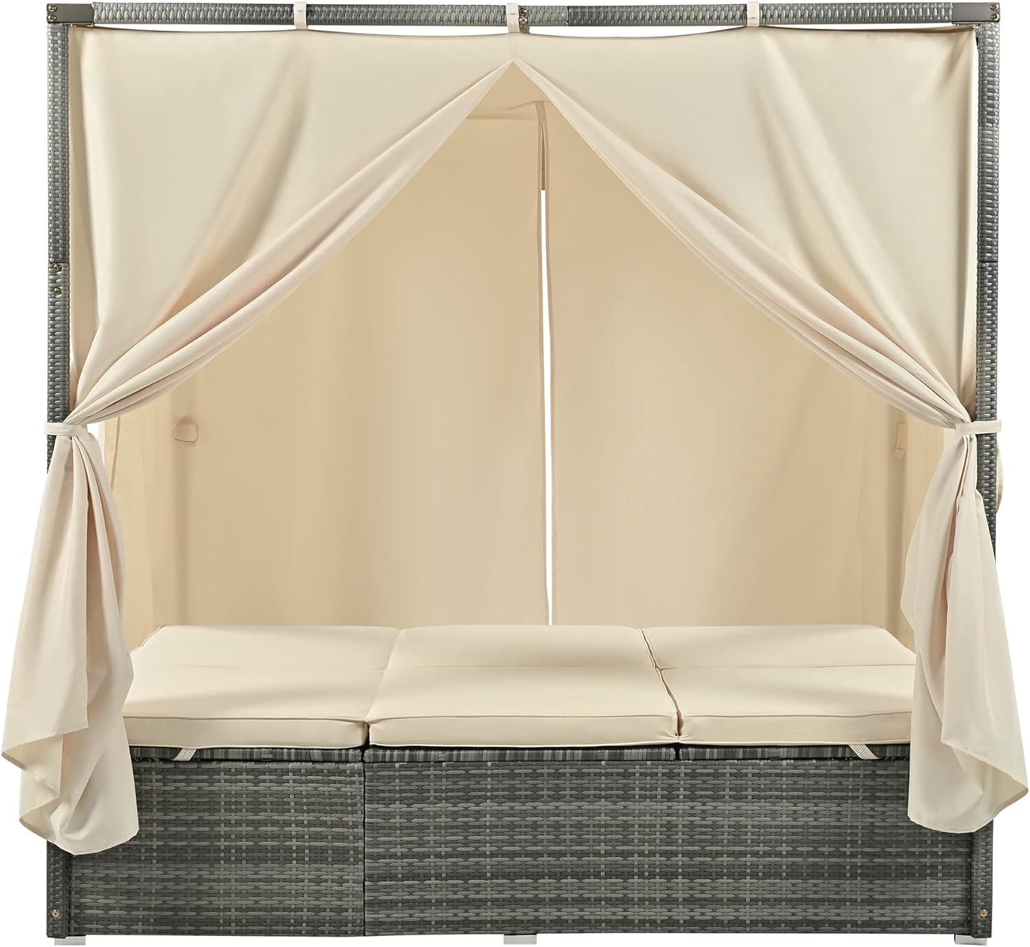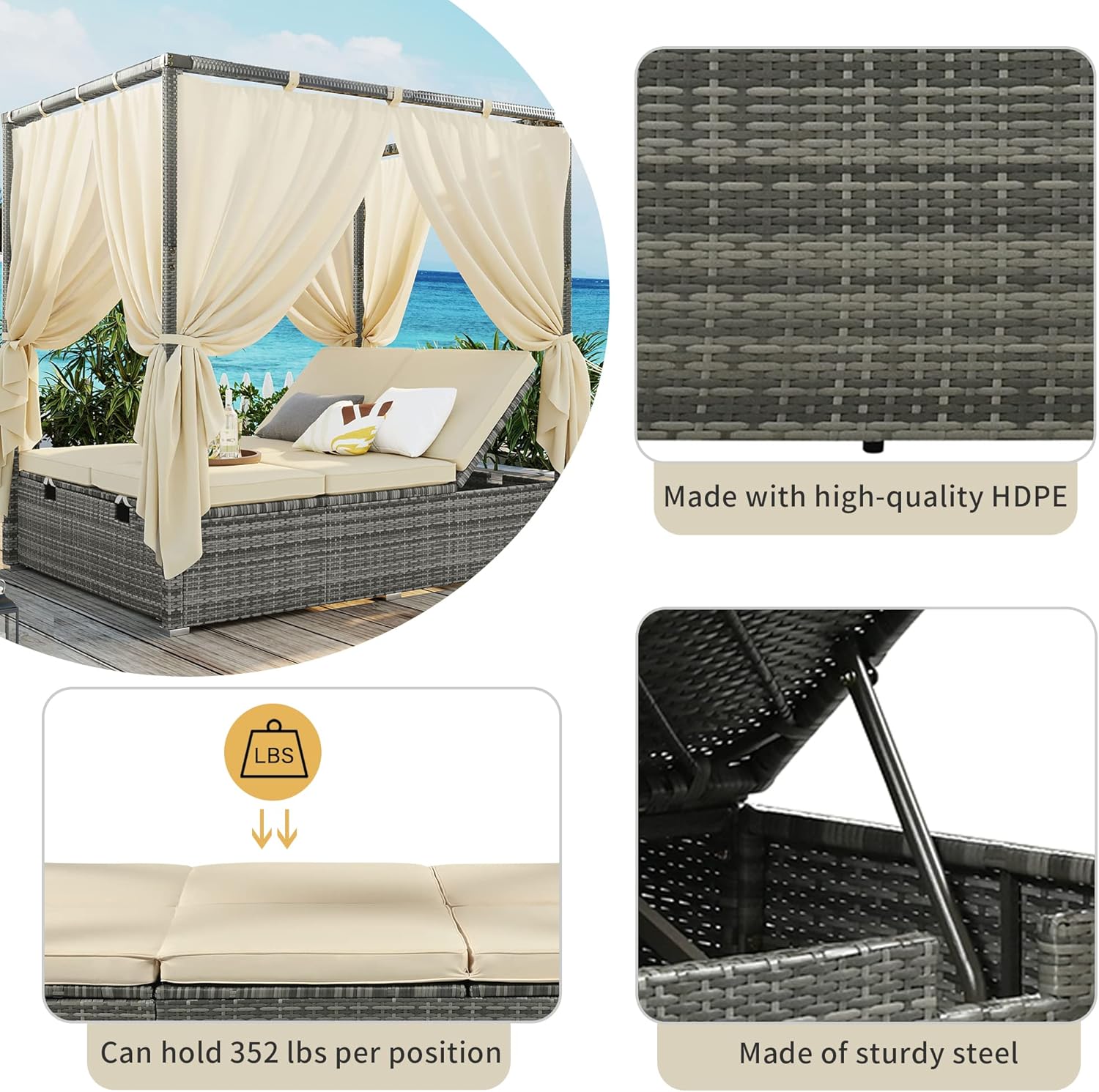Create a peaceful, stylish retreat in your backyard, garden, or poolside with this wicker daybed featuring a protective canopy, overhead curtains, and adjustable lounge seats. Designed for comfort and built to withstand outdoor conditions, it combines roomy relaxation space with thoughtful details—removable cushions, privacy curtains, and an adjustable reclining mechanism—so you can sunbathe, nap, or socialize in style.