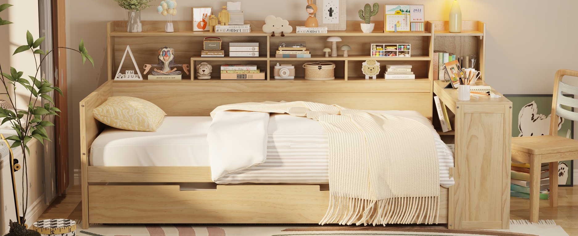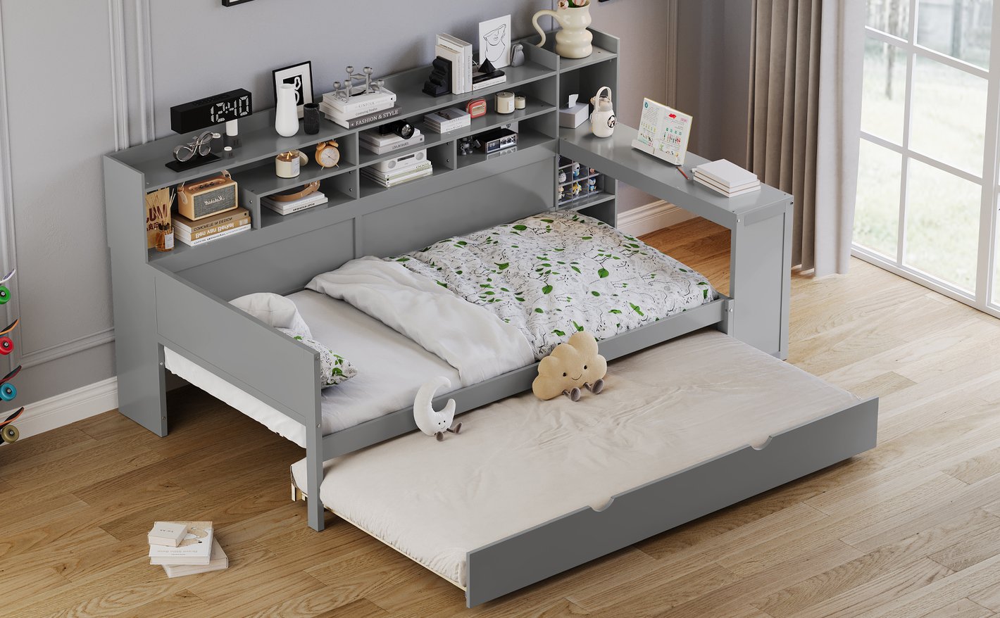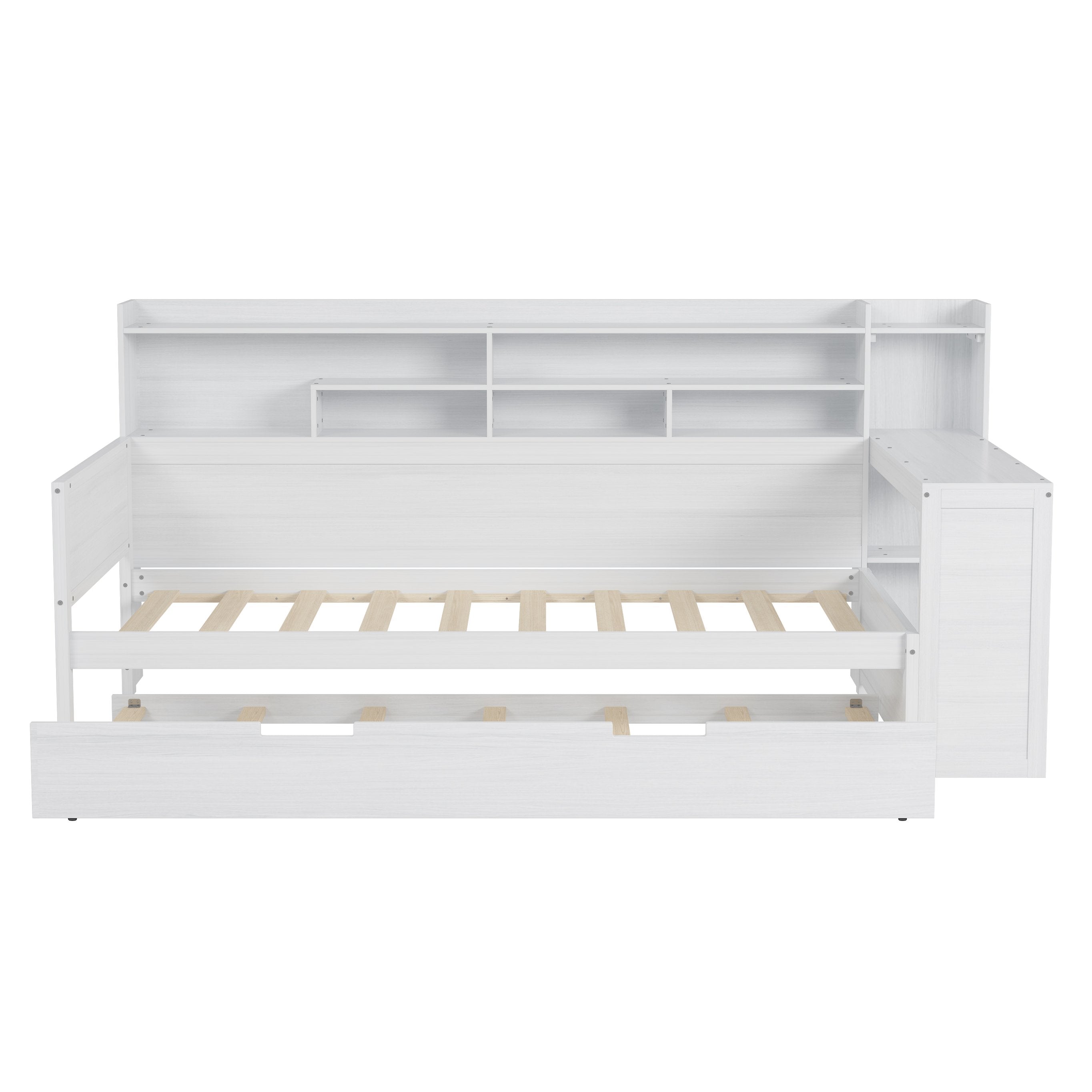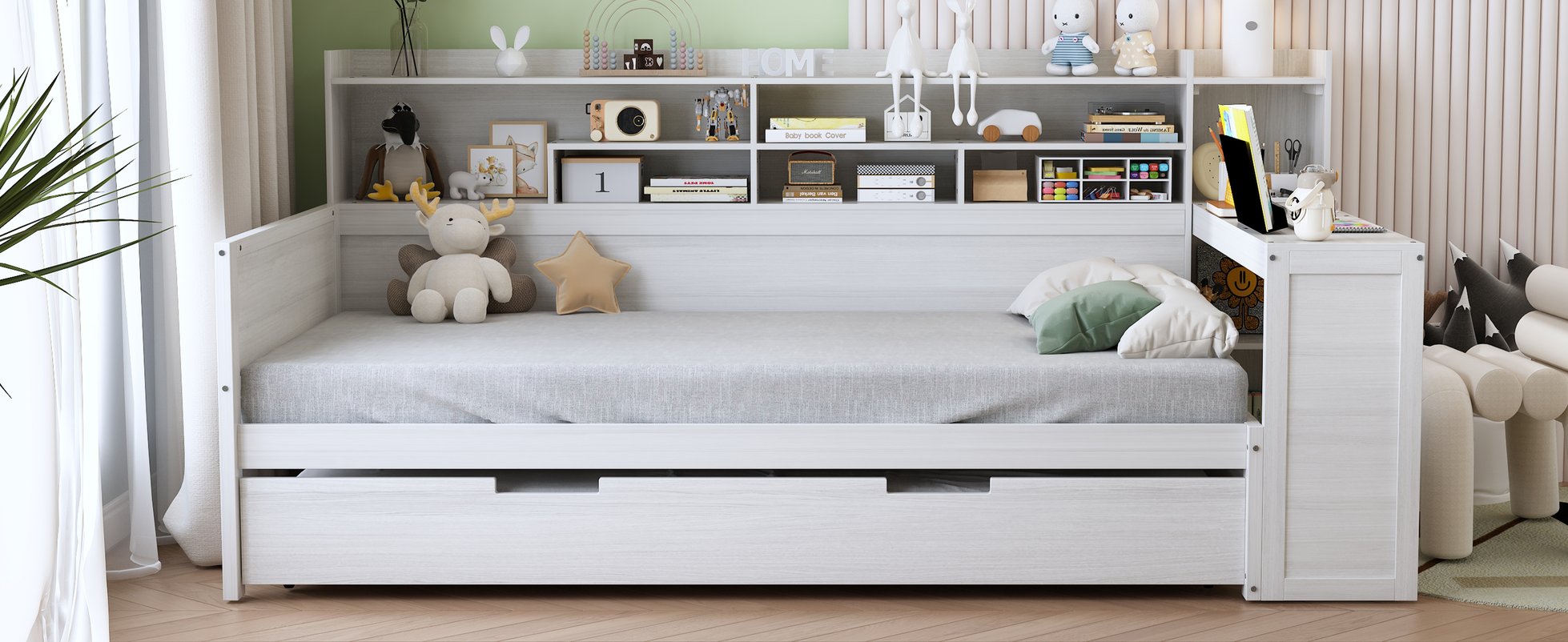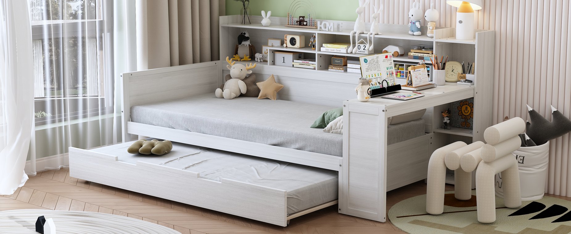 This elegant antique-white wooden daybed combines sleep, storage, and study into one space-saving unit — ideal for small bedrooms, guest rooms, or kids' rooms. Clean lines and a classic finish pair with smartly integrated features: a twin trundle for overnight guests, multi-layer shelves for books and decor, and a pull-out study desk that creates a functional workspace without taking extra floor space. Built from durable engineered woods and solid pine accents, this piece balances style, strength, and utility.
