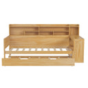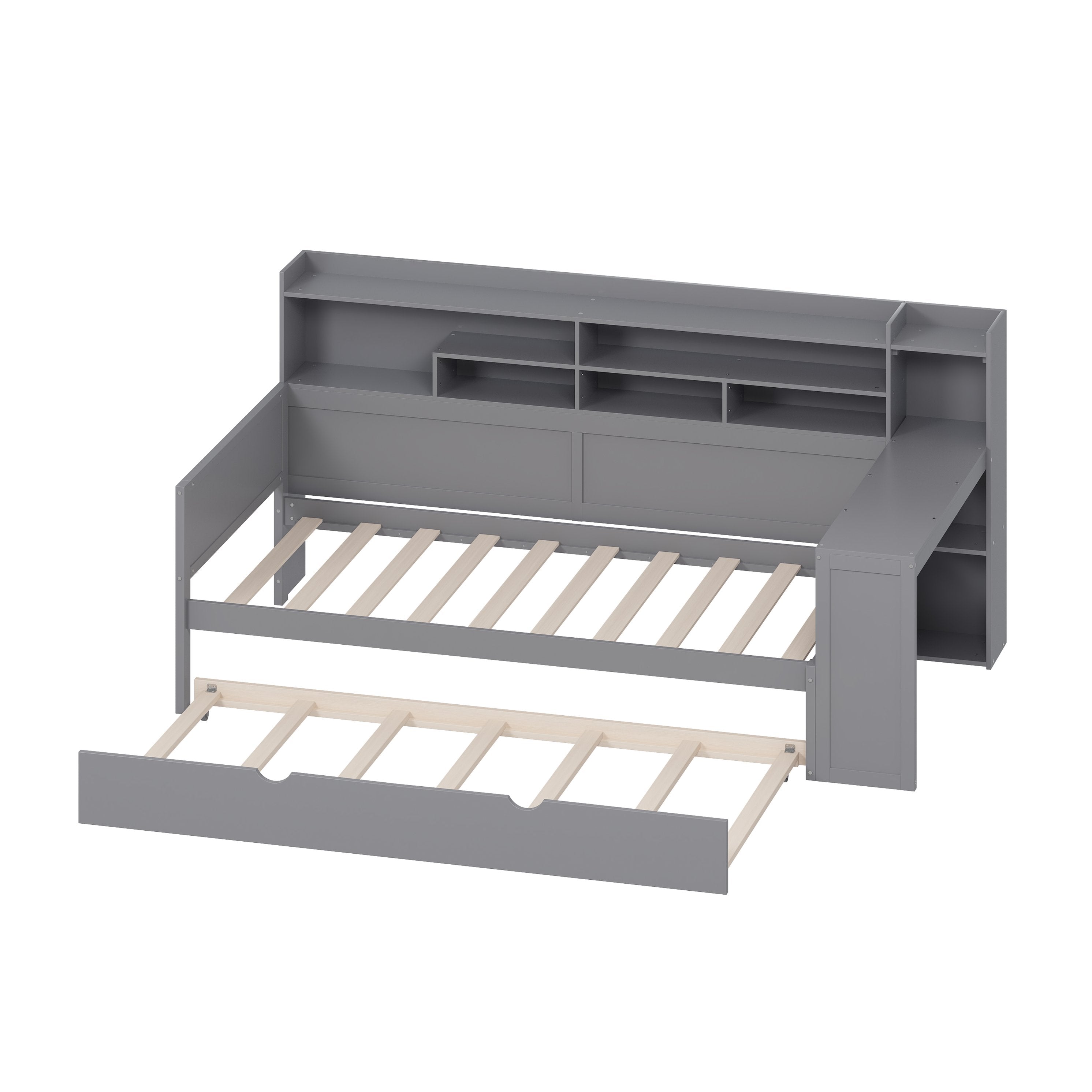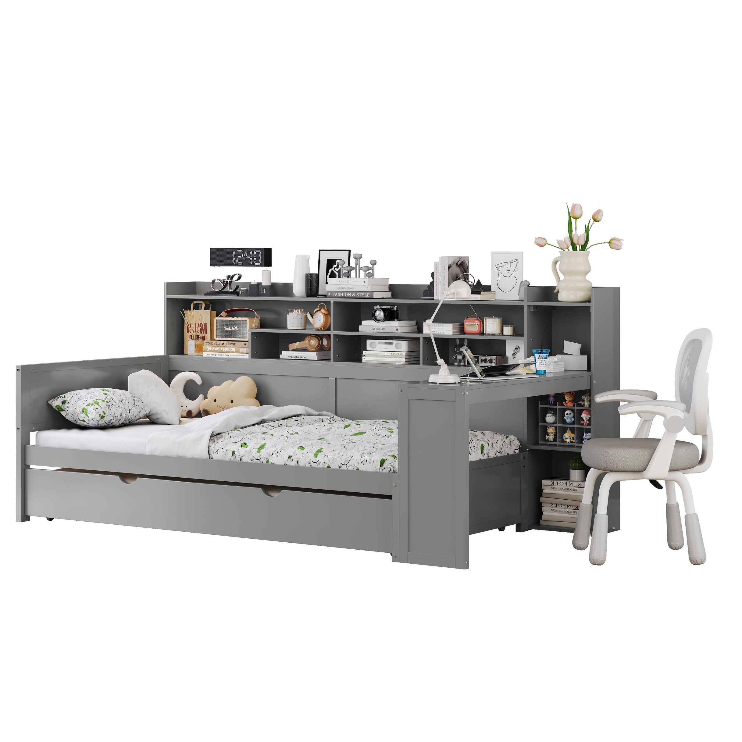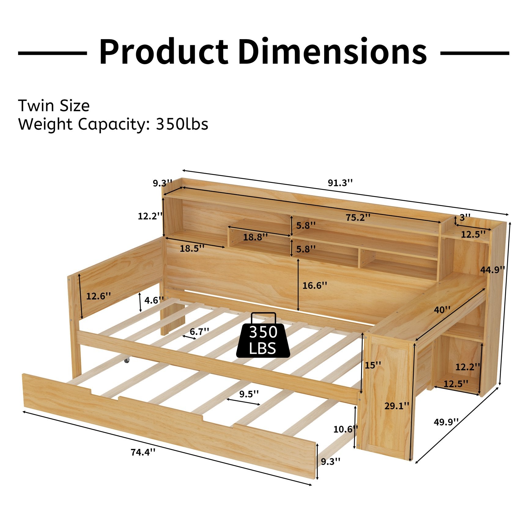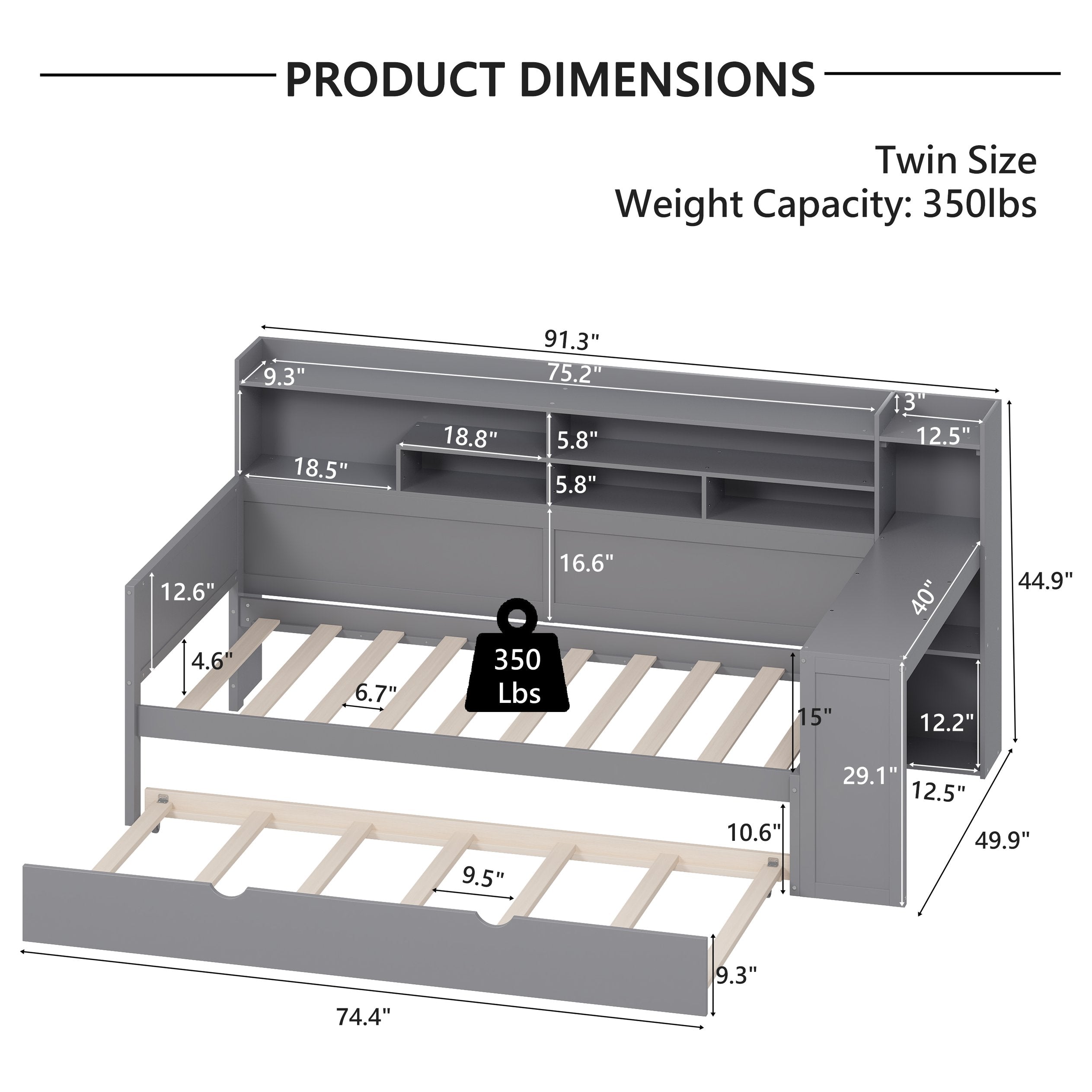 This elegant antique-white wooden daybed combines sleep, storage, and study into one space-saving unit — ideal for small bedrooms, guest rooms, or kids' rooms. Clean lines and a classic finish pair with smartly integrated features: a twin trundle for overnight guests, multi-layer shelves for books and decor, and a pull-out study desk that creates a functional workspace without taking extra floor space. Built from durable engineered woods and solid pine accents, this piece balances style, strength, and utility.