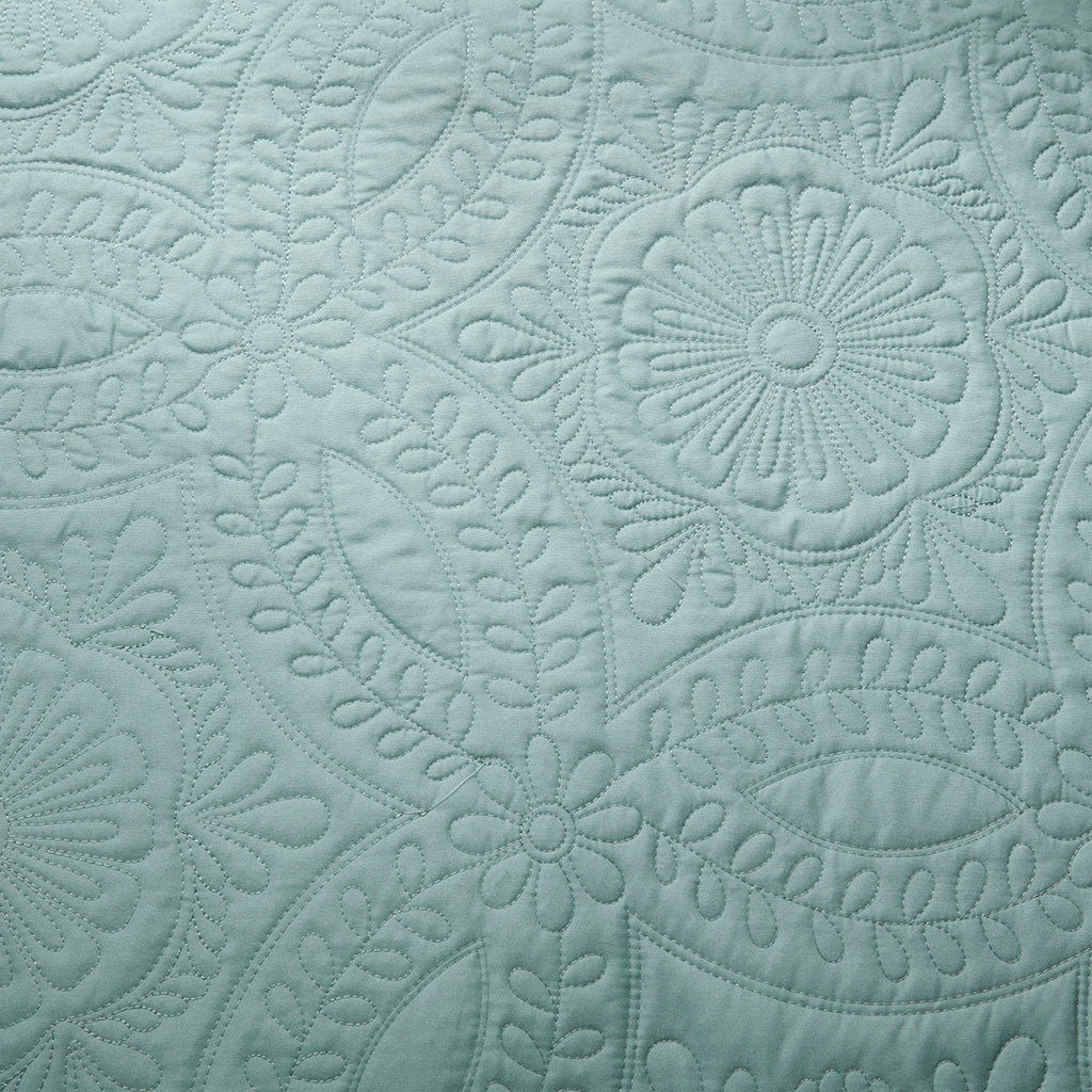 - Decorative details: Embroidered medallion on the oblong pillow and matching pattern repeat on shams for a cohesive style