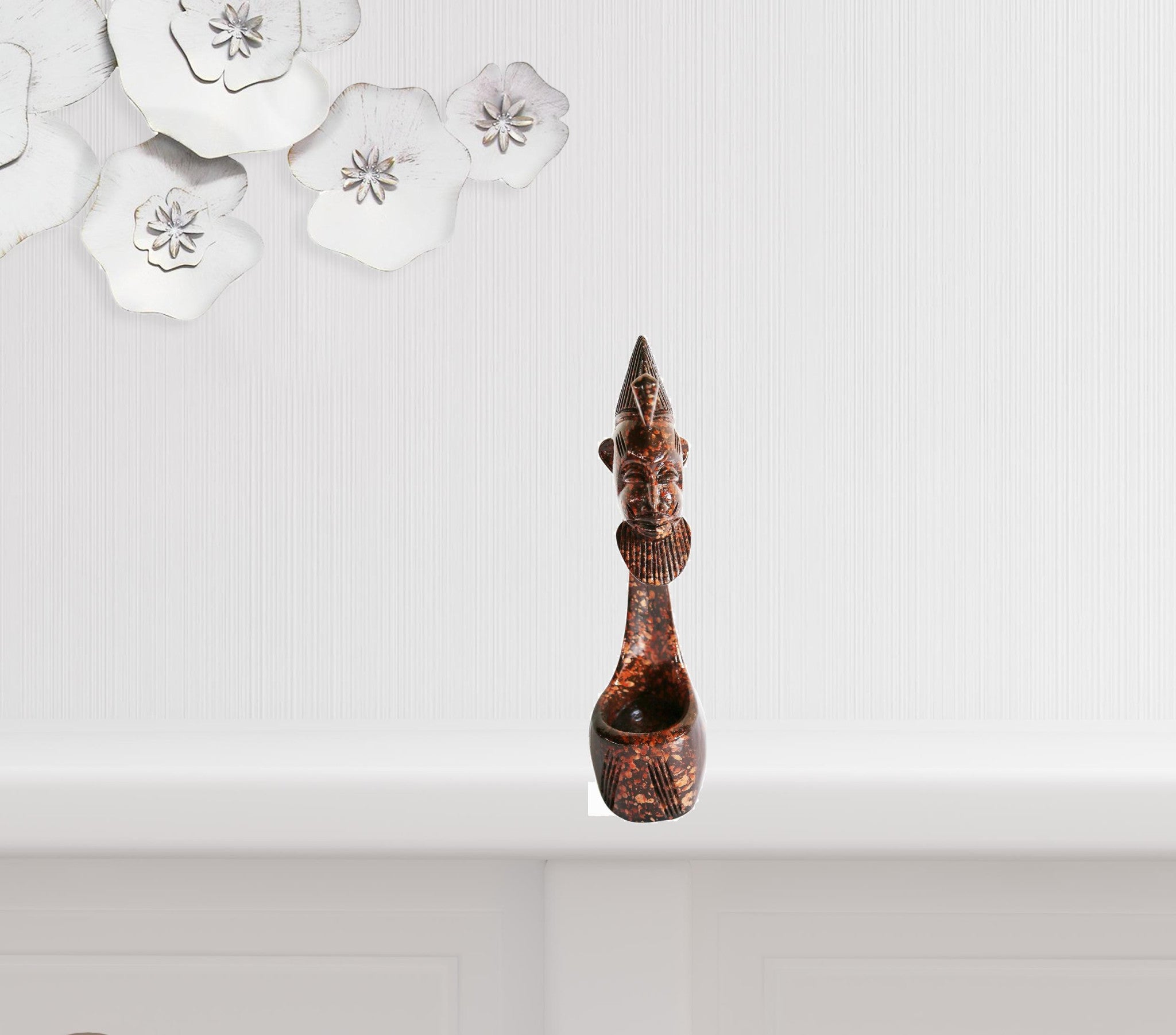 - Adult sculpture made of hand-painted brown manufactured wood.