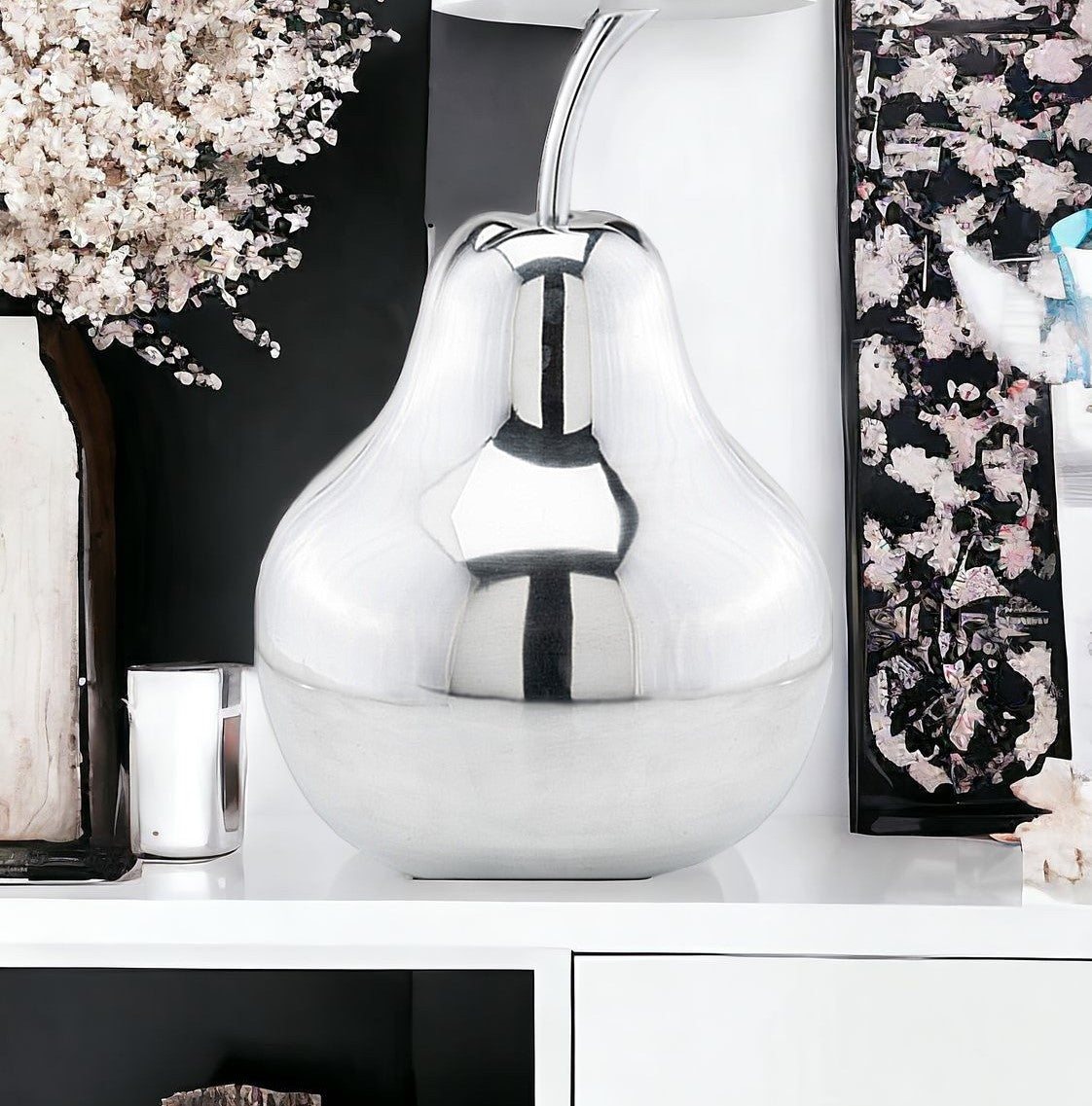 - Decorative pear sculpture made of buffed aluminum in a modern style.