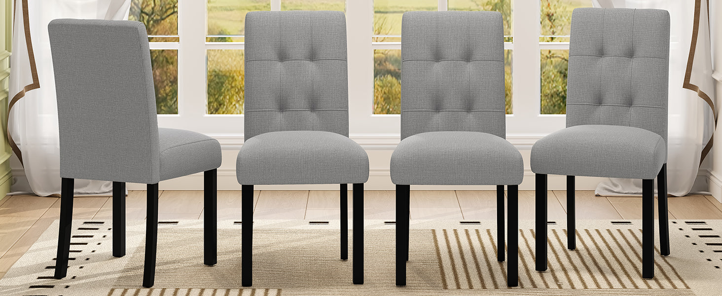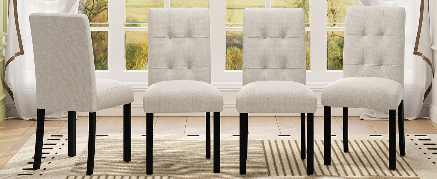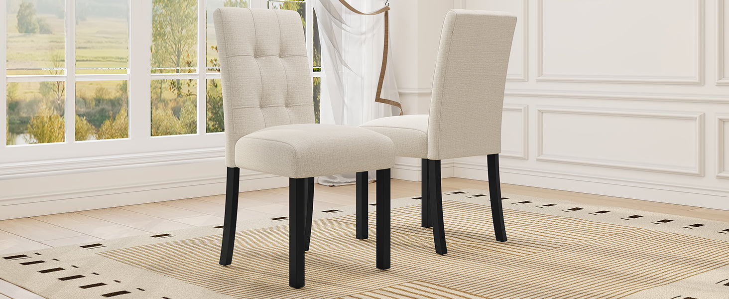 Upgrade your dining or living space with these modern tufted accent chairs that blend contemporary style and everyday comfort. Upholstered in rustic beige linen with elegant tufting and supported by sturdy black rubber wood legs, each chair offers a refined look suitable for the kitchen, dining room, bedroom, or home office. Designed for easy assembly and durable use, this 4-piece set delivers consistent comfort and chic design for family meals, gatherings, and everyday seating.
