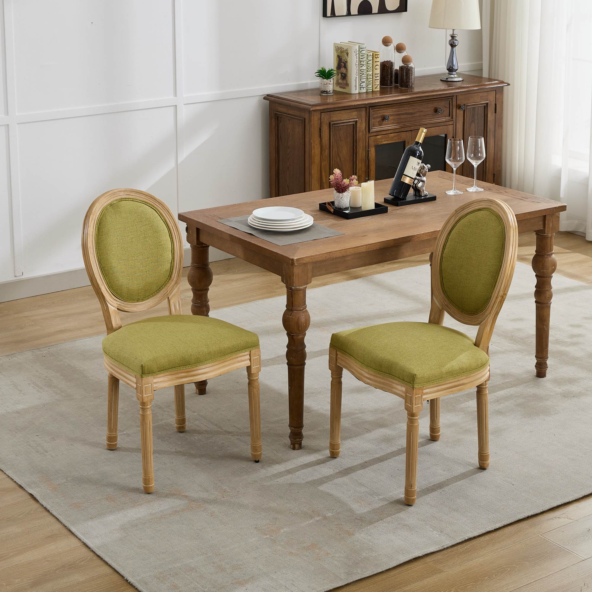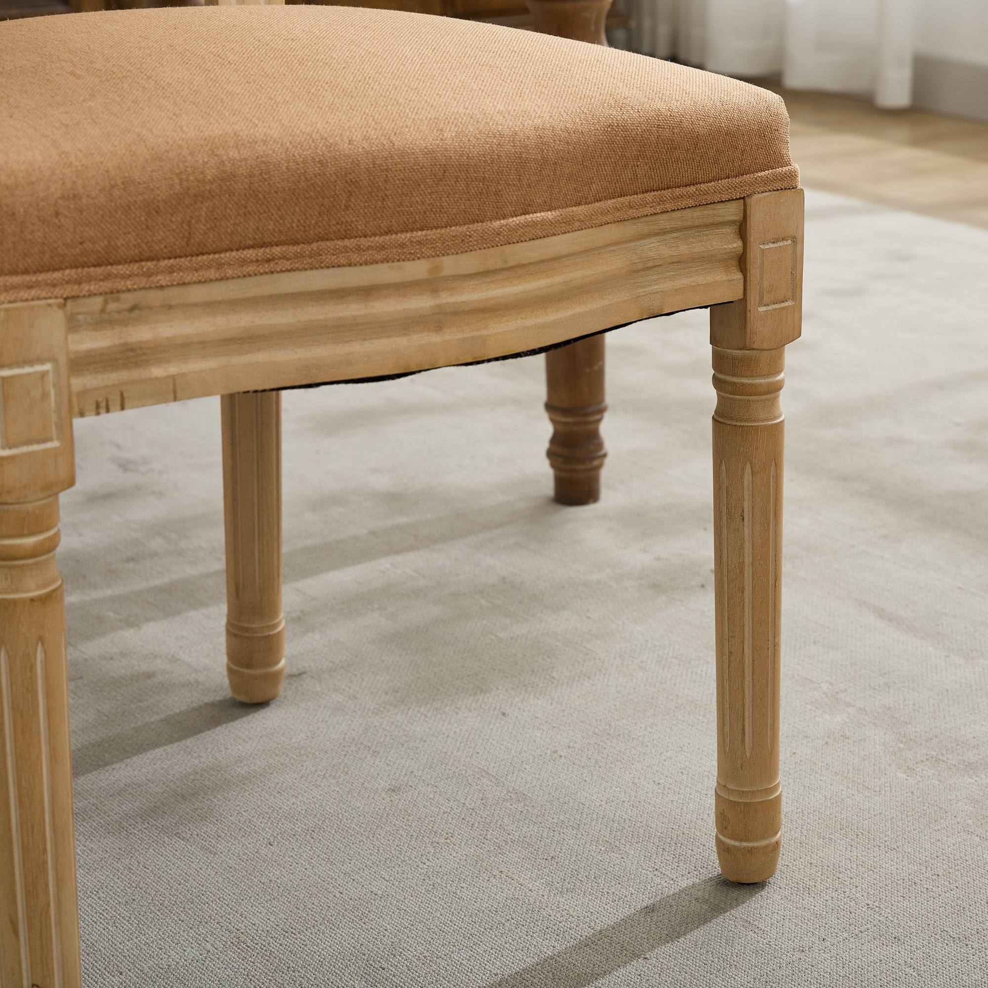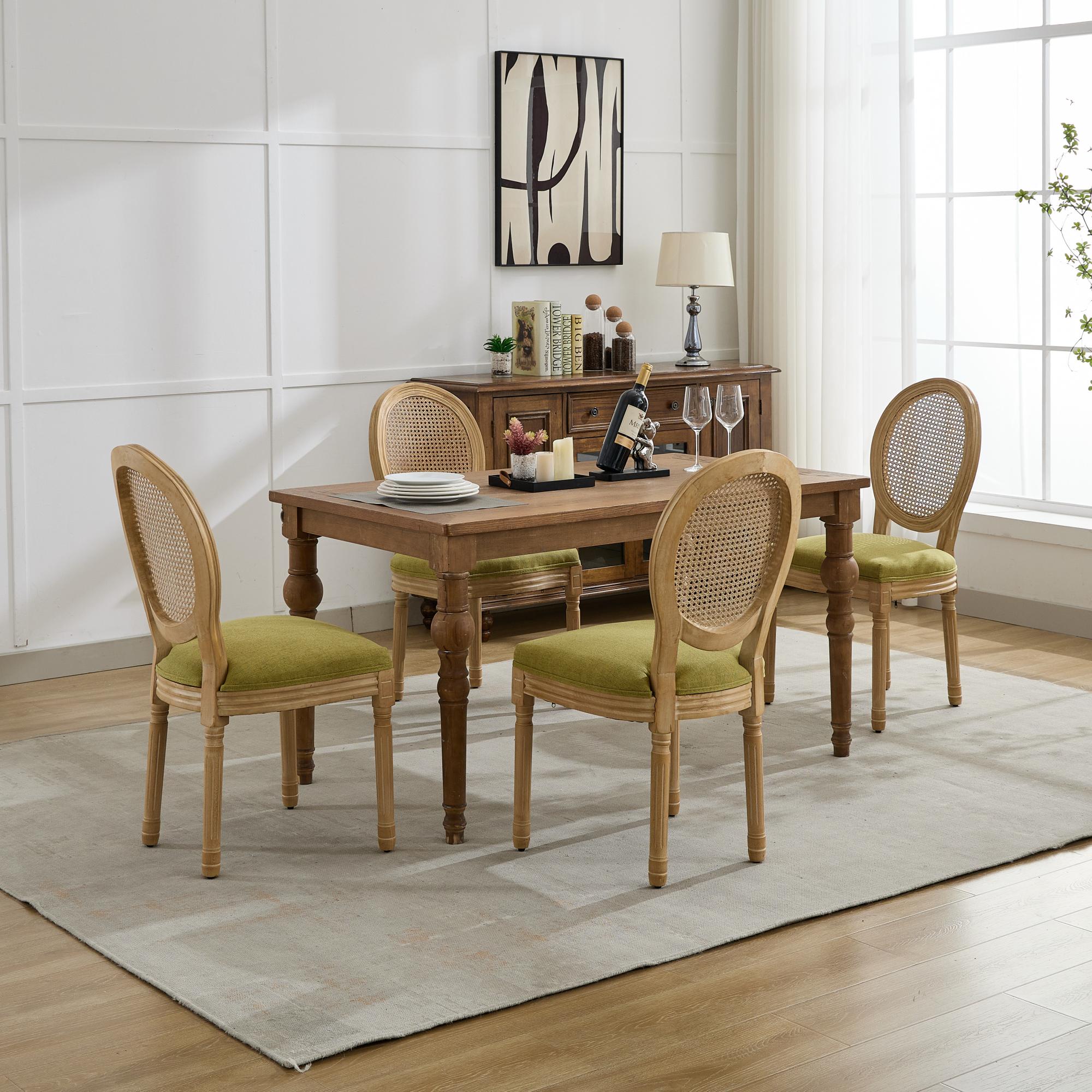 Elevate your dining or living space with these French-style dining chairs that combine classic elegance with durable construction. The antique-painted solid wood frame and tan linen fabric upholstery create a refined, timeless look, while the rattan back adds artisanal charm. Designed for comfort and longevity, these chairs are ideal for everyday use or as accent seating in dining rooms, breakfast nooks, or guest rooms.
