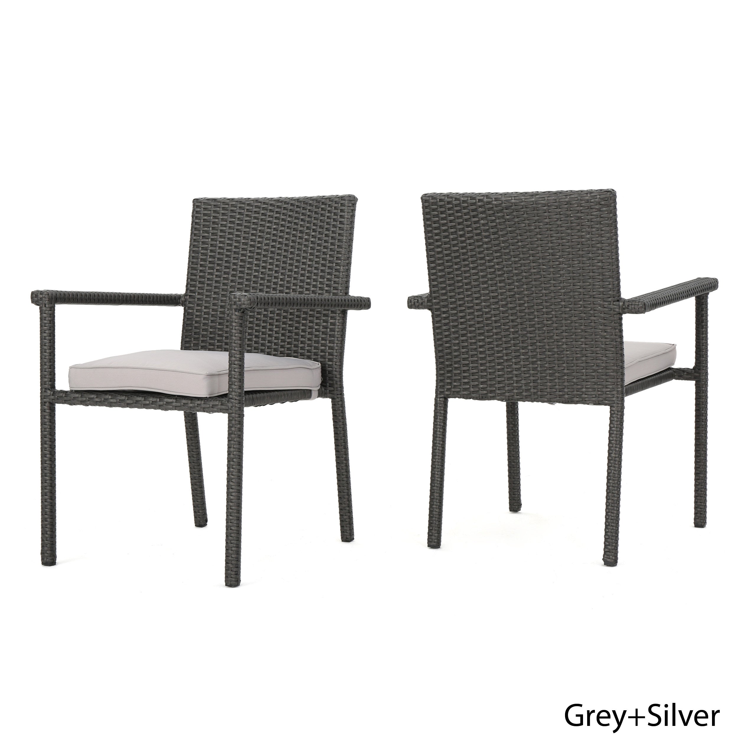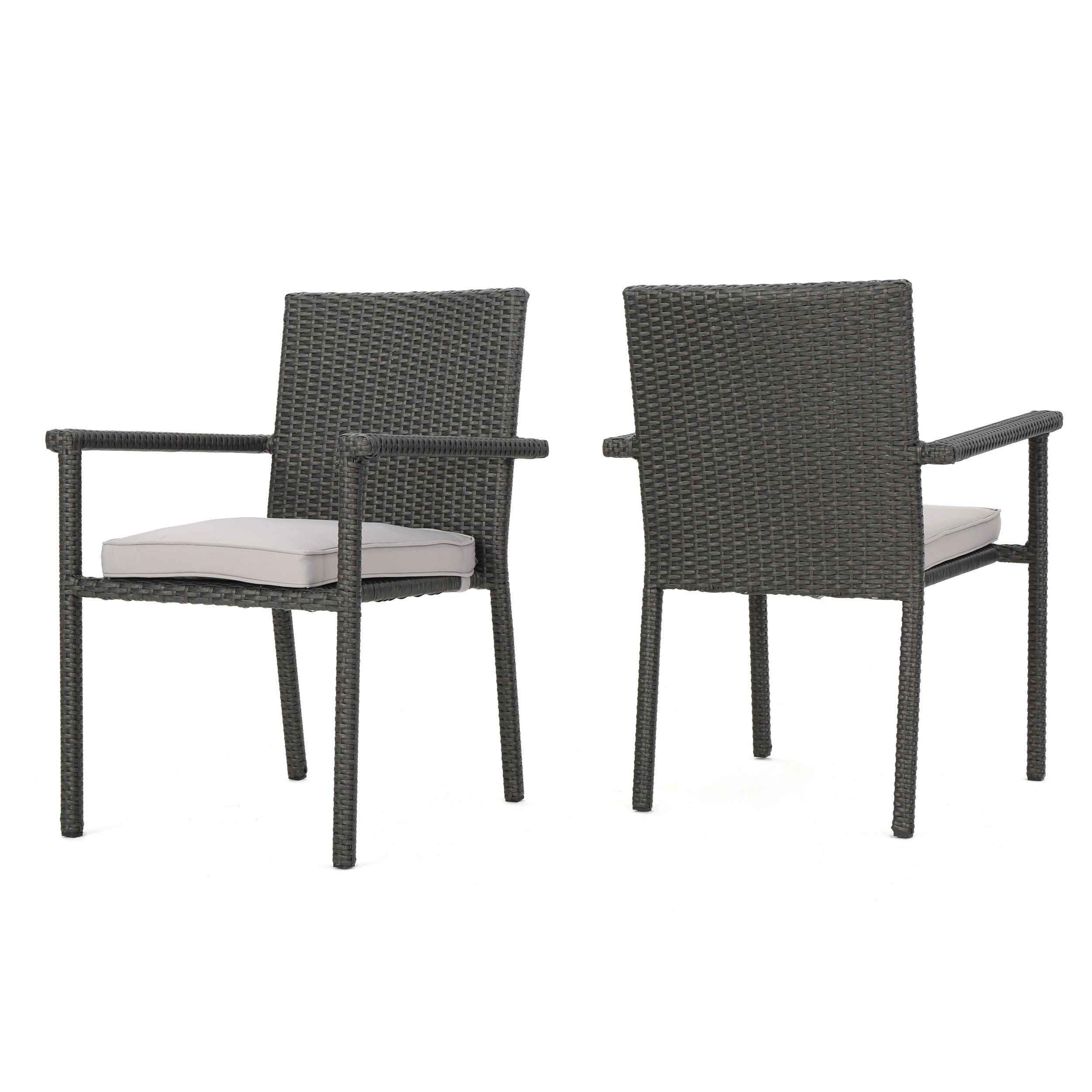 Add contemporary comfort and durable style to your outdoor dining or patio area with this set of three grey PE rattan chairs. Crafted for easy use and storage, the stackable design and weather-resistant materials make them a practical choice for casual alfresco meals, poolside seating, or extra guest chairs. Their clean lines and comfortable armrests bring modern charm while the iron frame provides dependable support.