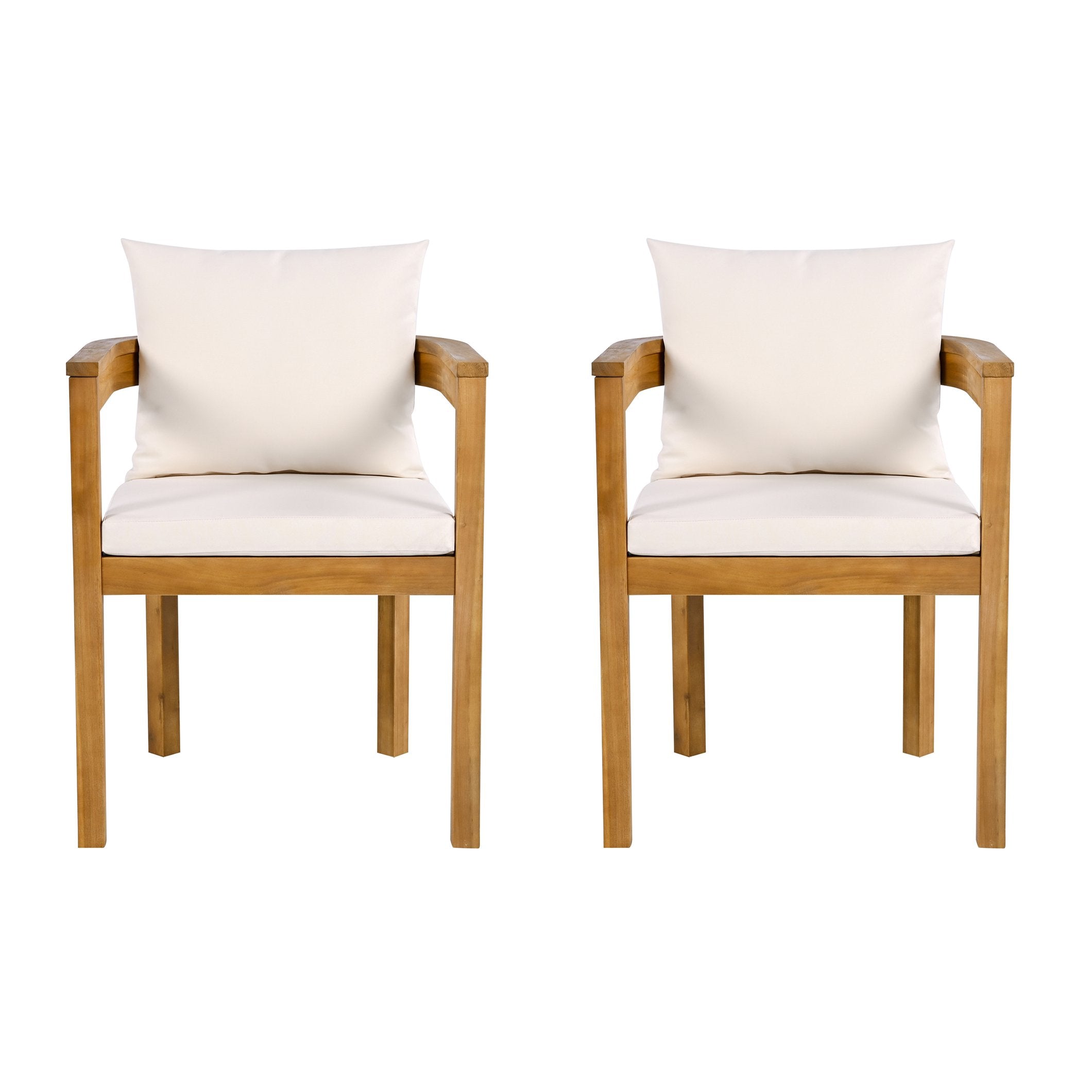 Enjoy relaxed alfresco dining with these elegant Acacia wood chairs — a perfect blend of durability, comfort, and timeless design. Finished in a warm teak tone and paired with soft beige cushions, this set of two elevates any outdoor dining space while standing up to everyday use and the elements.