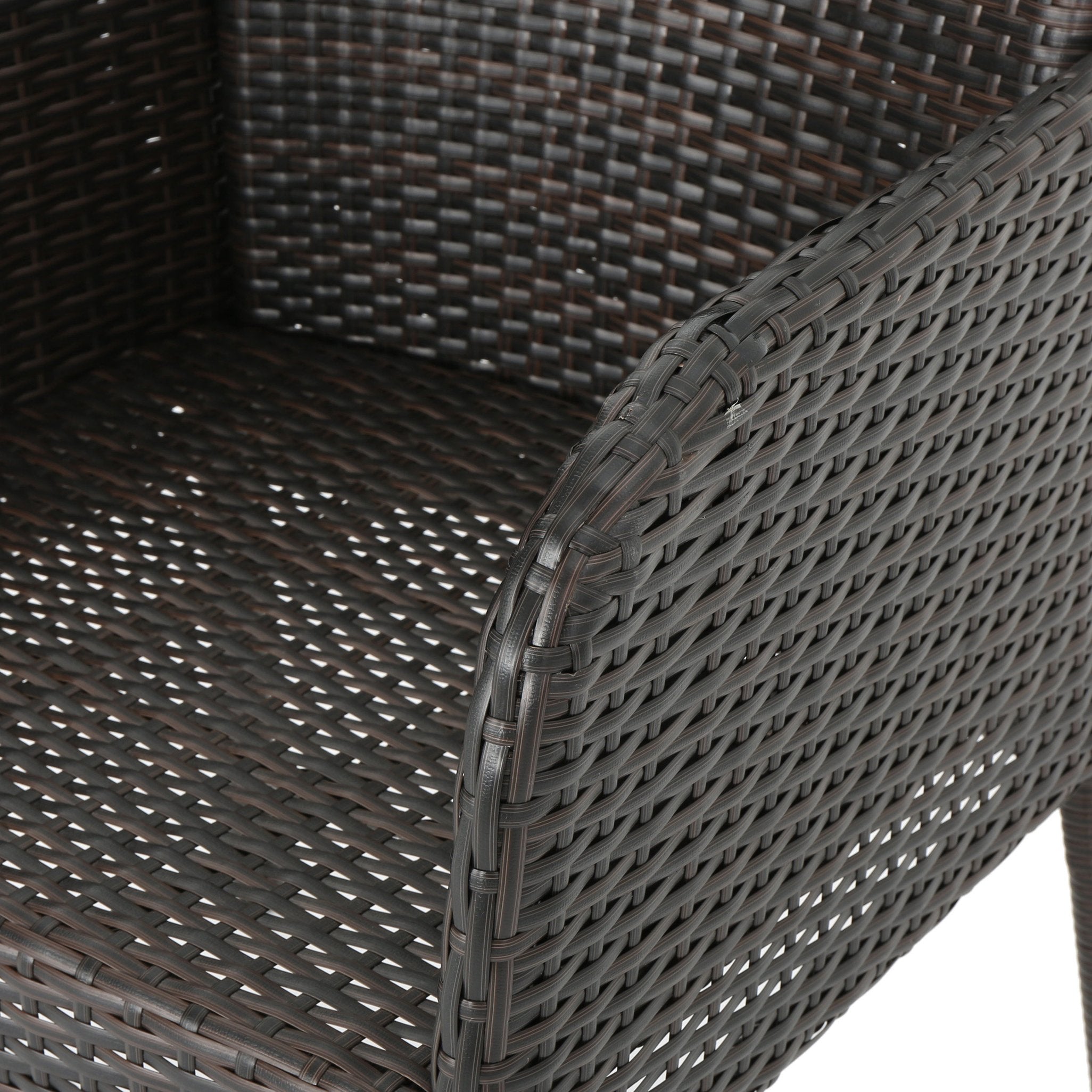 - Offer comfortable seating for guests both indoors and outdoors with this set of two wicker dining chairs. Crafted from PE wicker and a powder-coated iron frame for a sturdy seating option, this set of wicker dining chairs boasts a water-resistant structure to withstand harsh temperatures.
